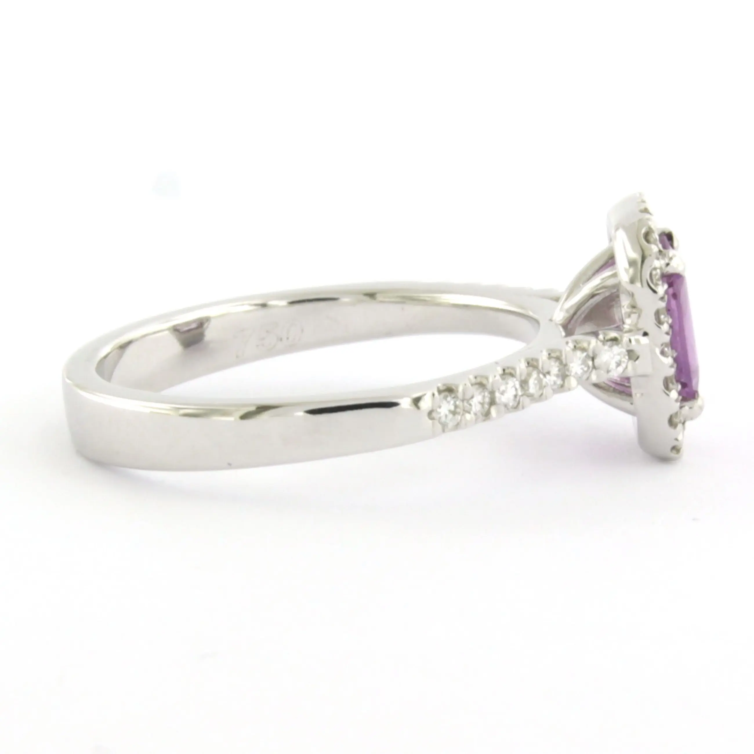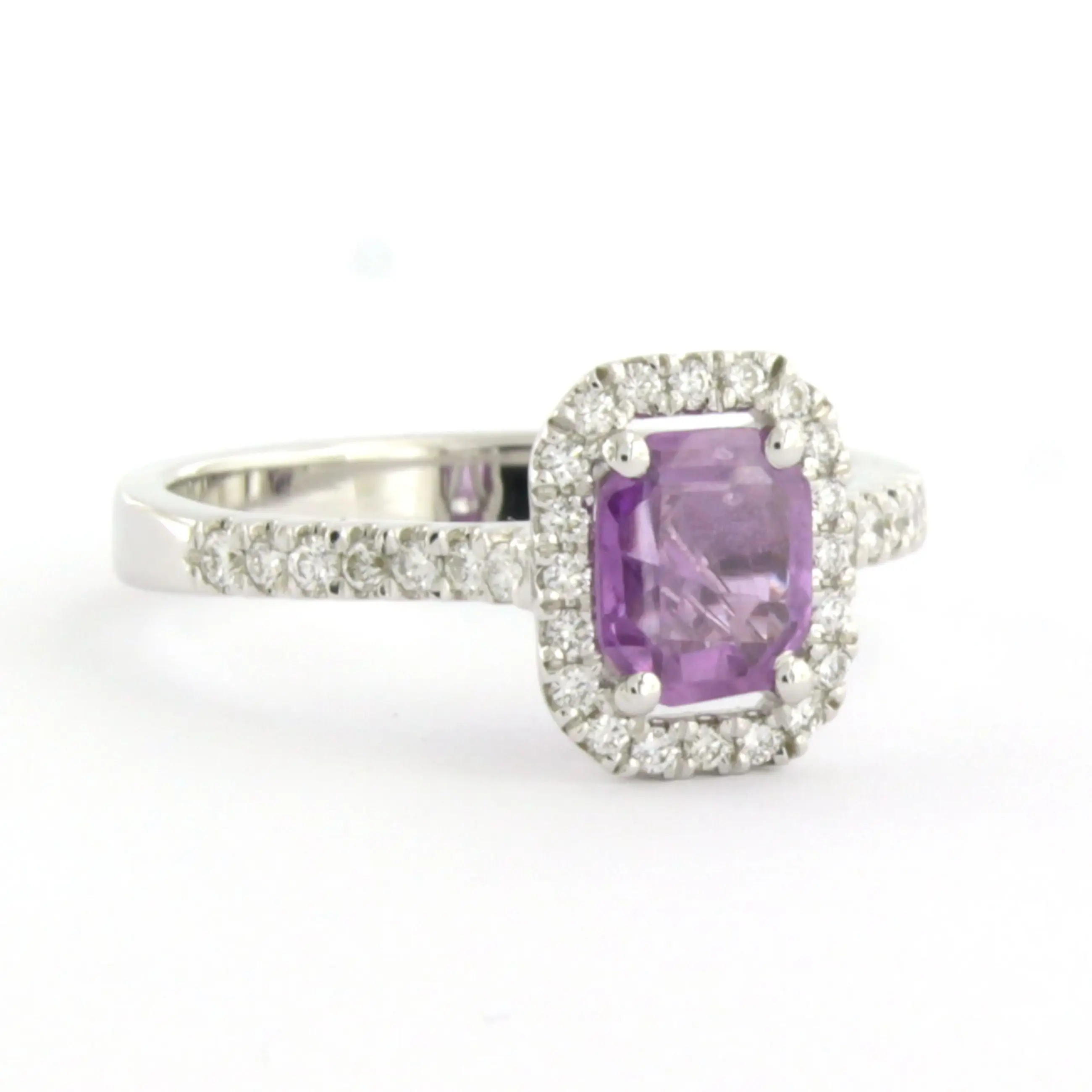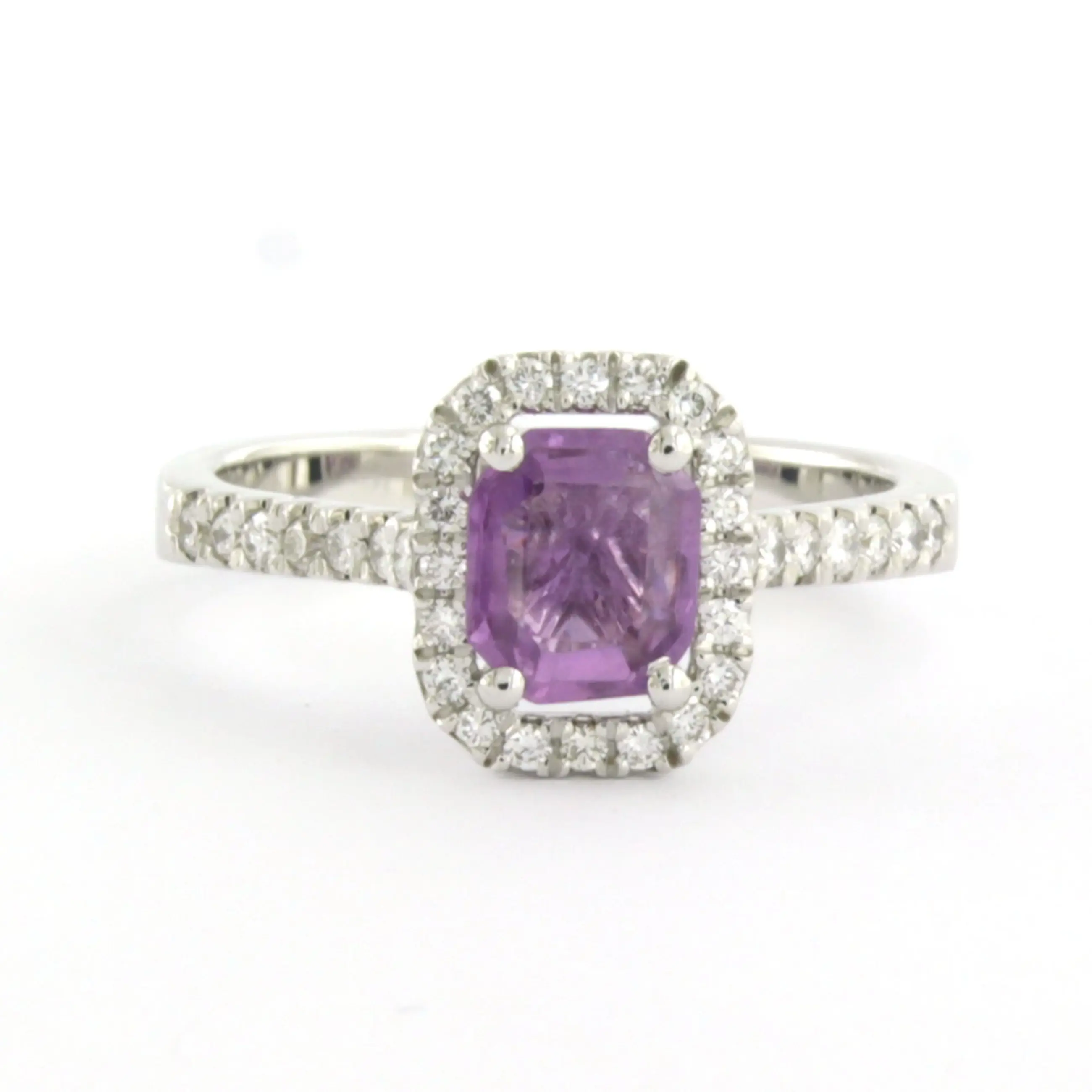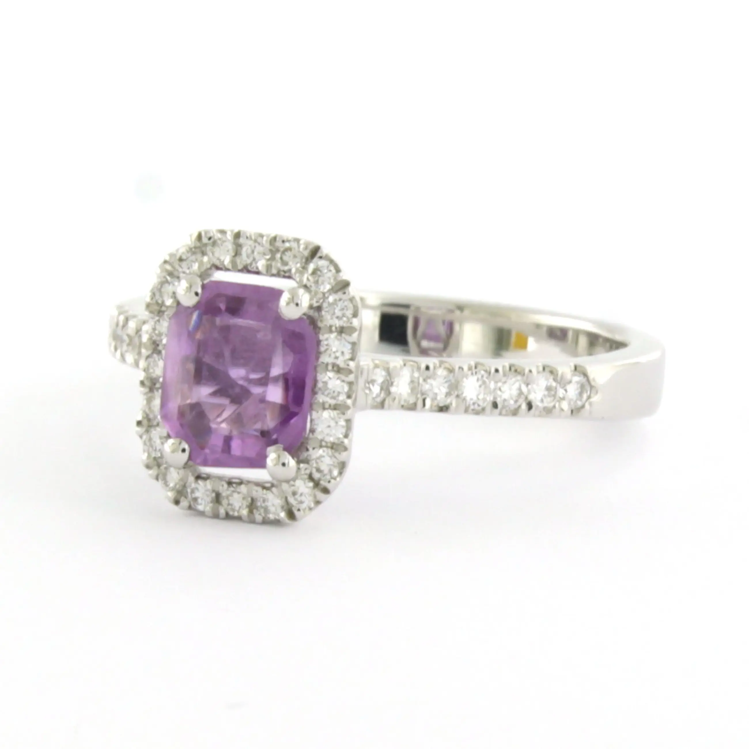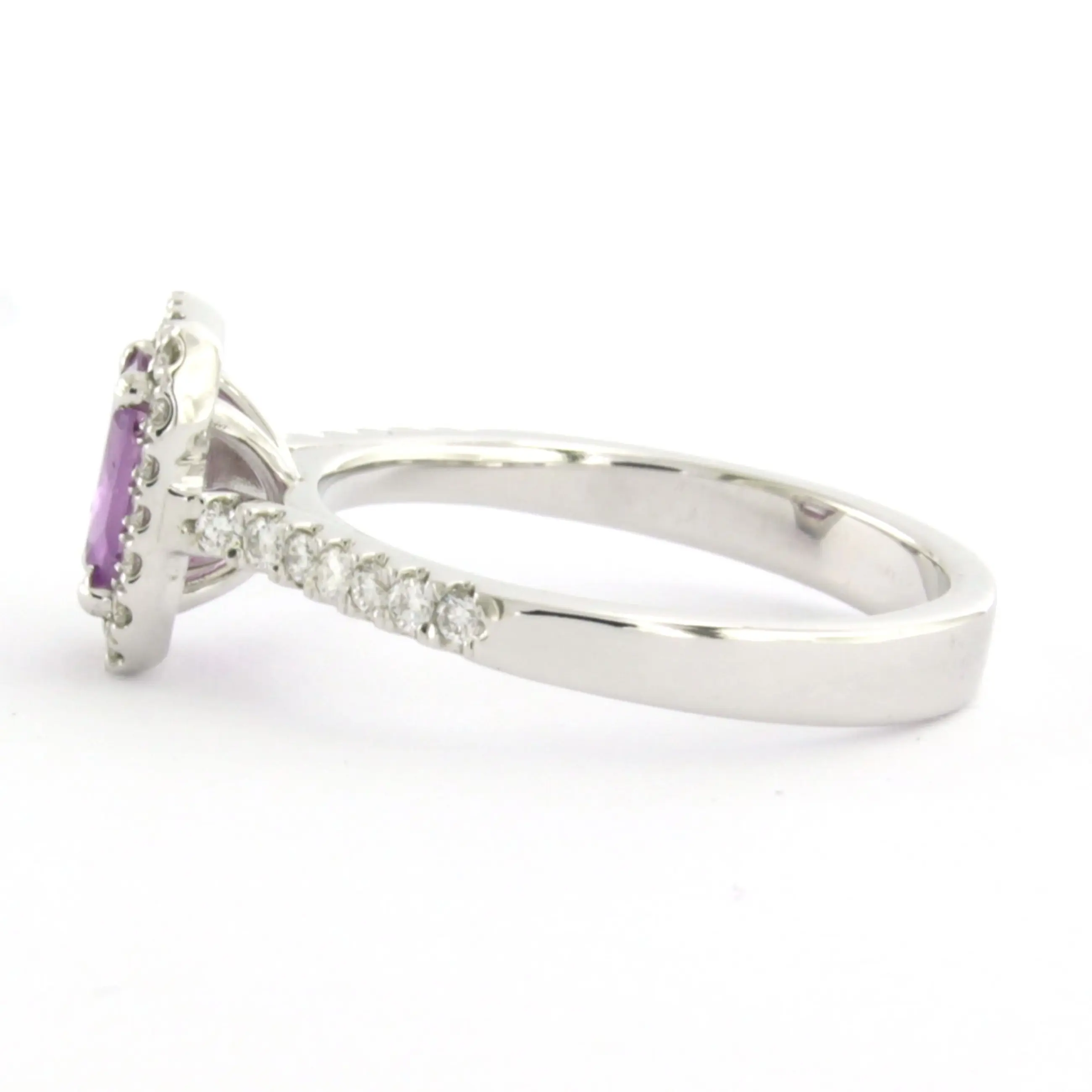 18k wit gouden ring bezet met centraal een roze saffier tot. 1.05ct en erom heen briljant geslepen diamant tot. 0.28ct - F/G - VS/SI - ringmaat 17.5(55)