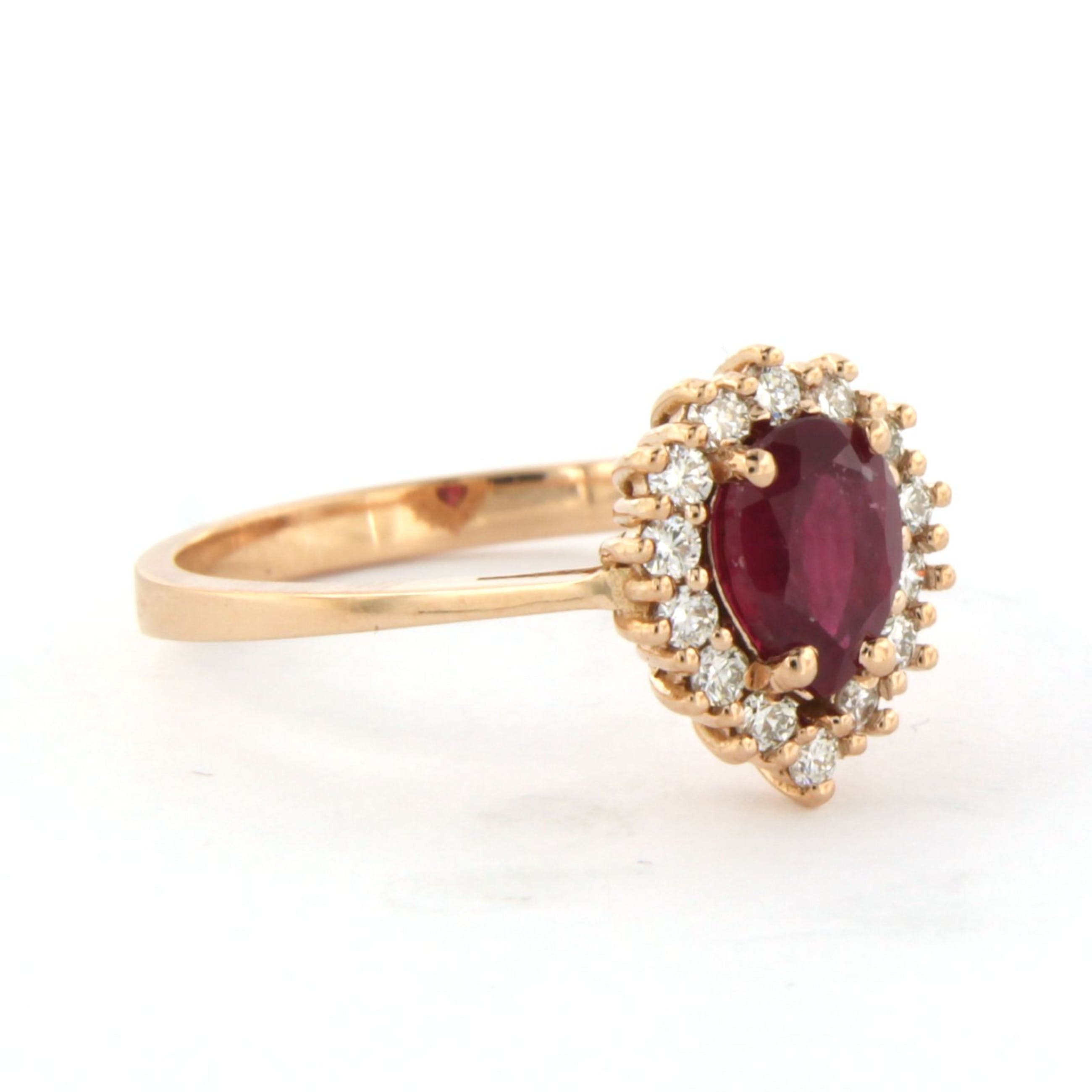 18k rosé gouden entourage ring bezet met centraal een robijn tot. 0,90ct en aan entourage briljant geslepen diamant tot. 0.24ct - F/G - VS/SI - ringmaat 17,5 (55)