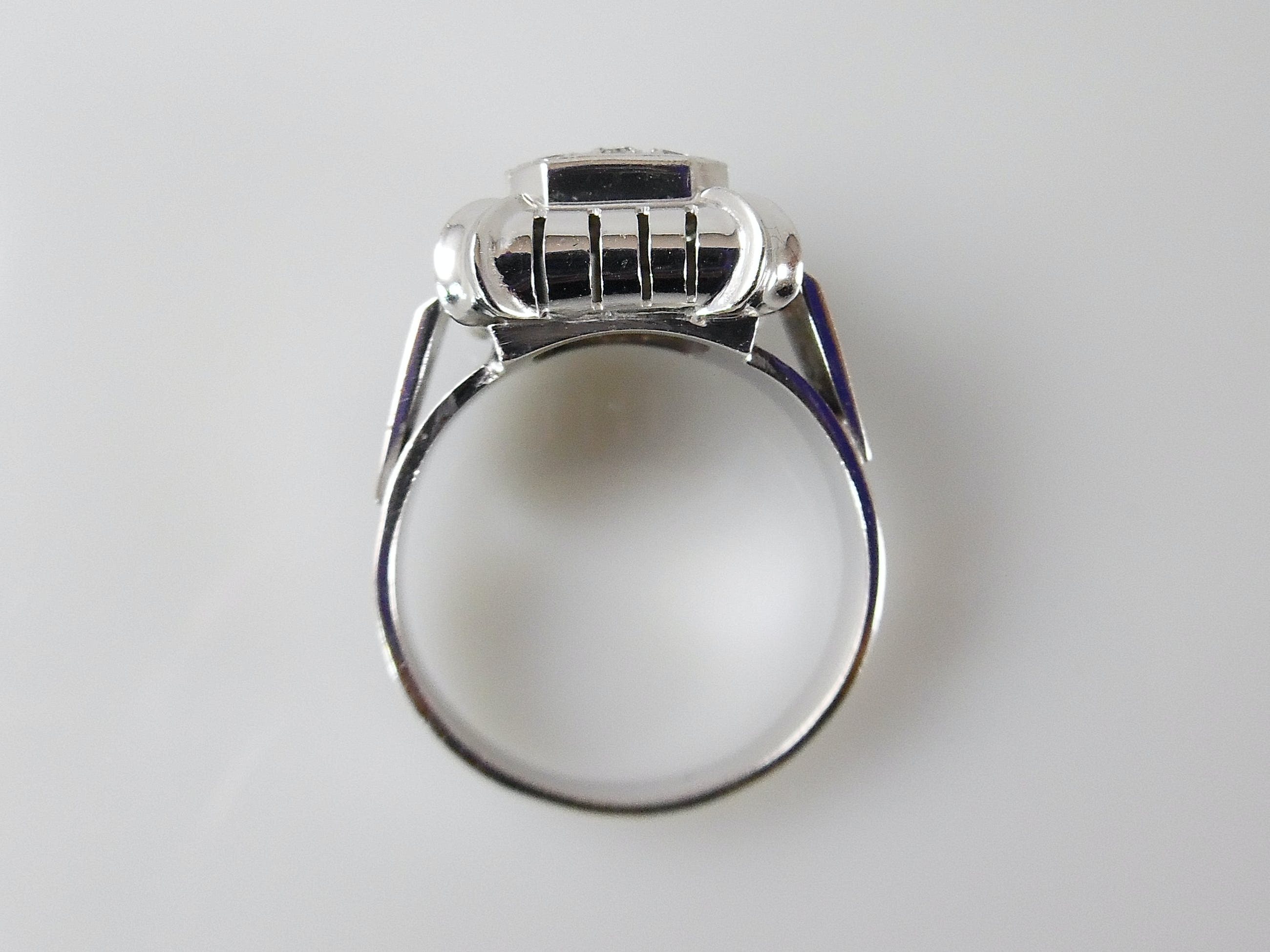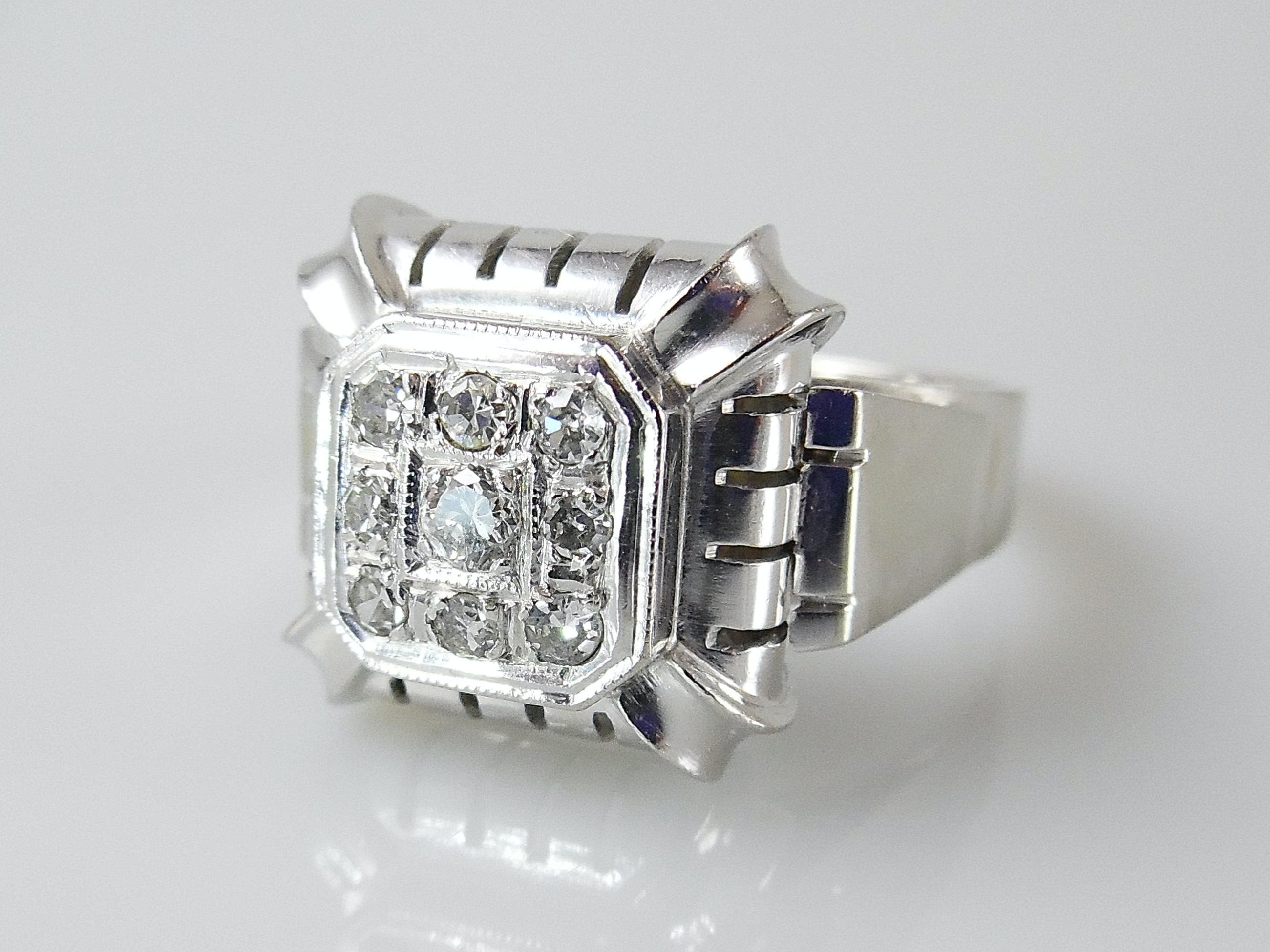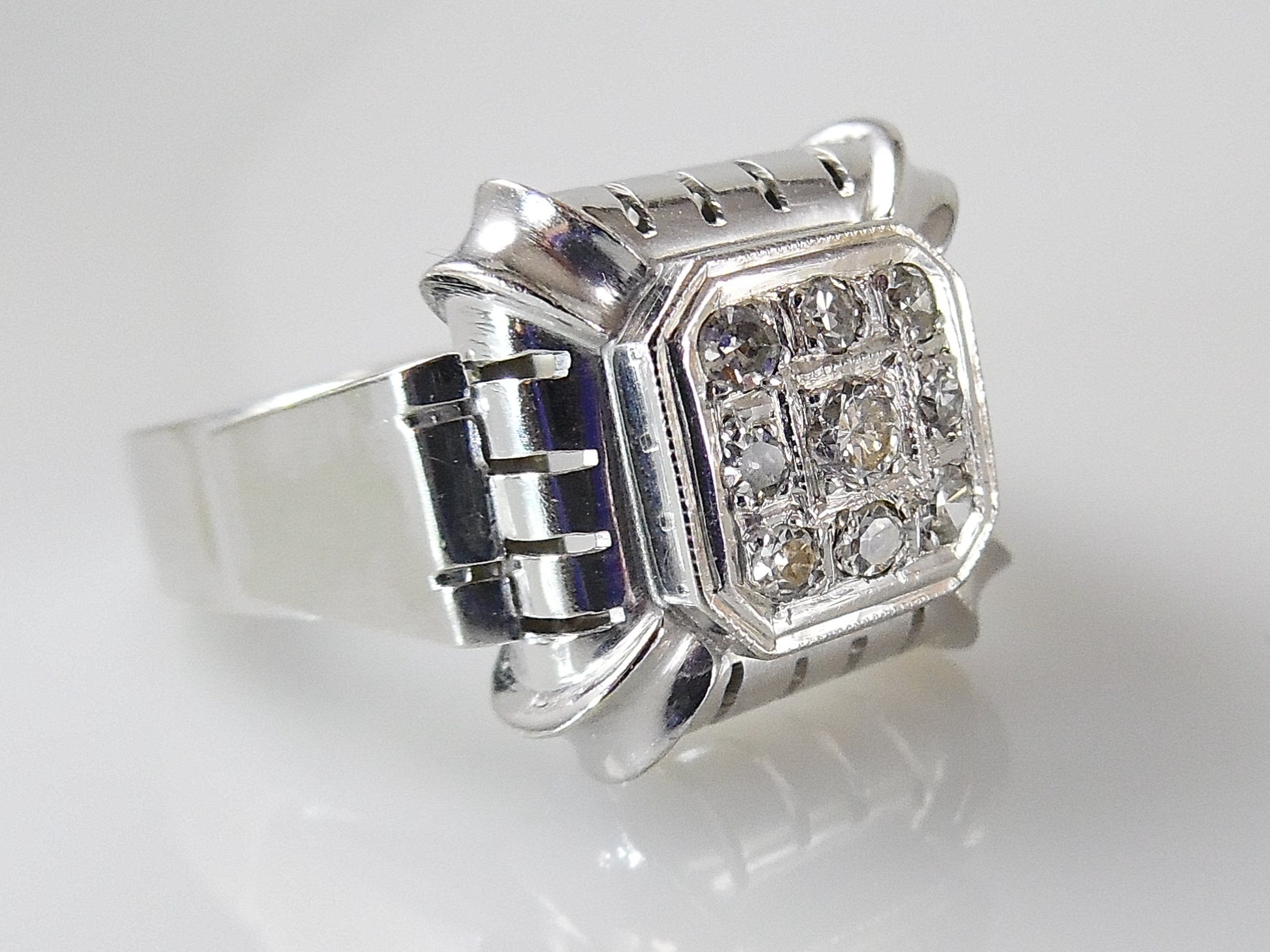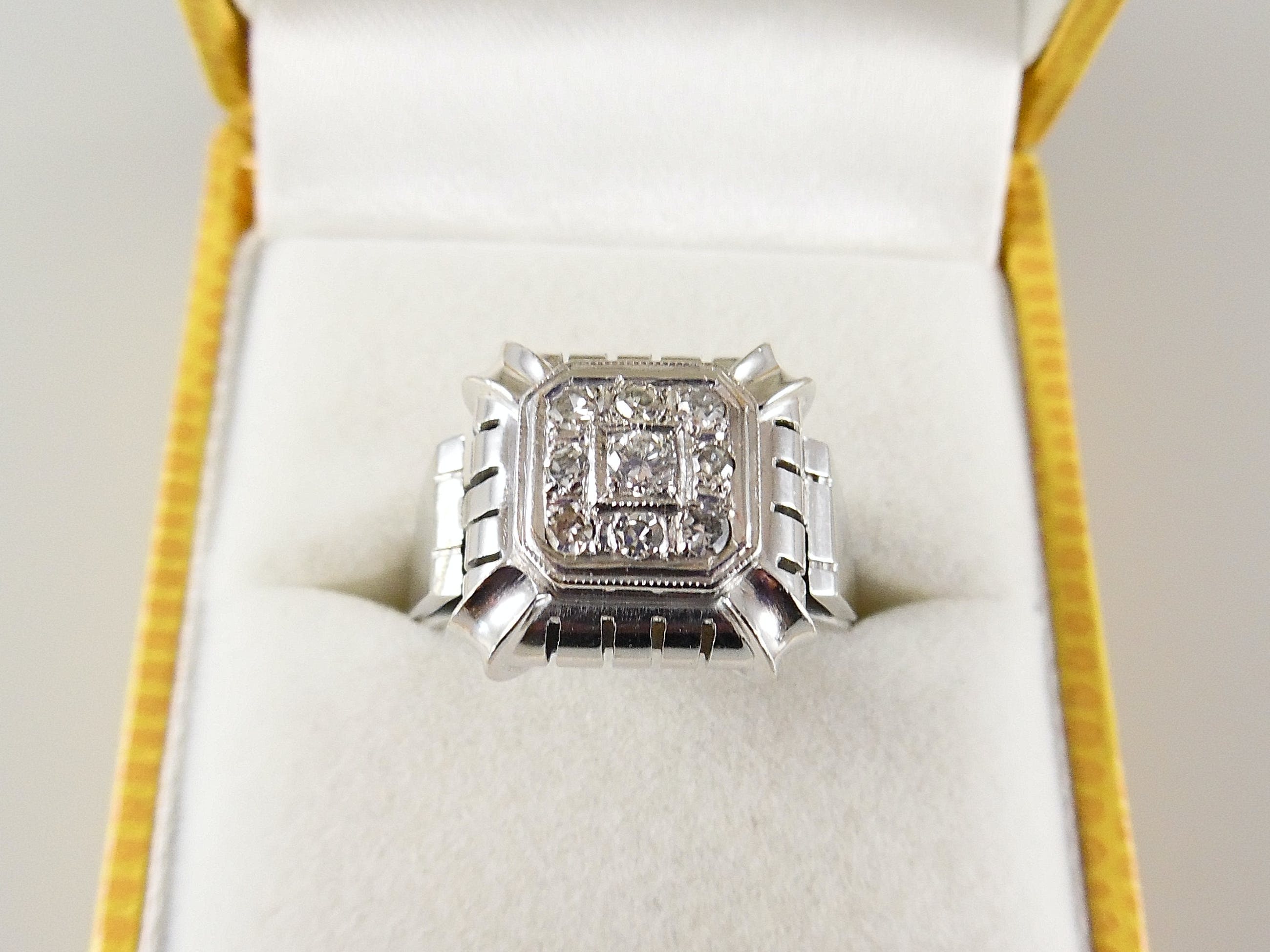Deze ring heeft bovenop een sierdeel van 14,3 x 13,2 mm en is 8,3 mm hoog. Zeer waarschijnlijk in de jaren '40/'50 ontworpen voor een heer, maar kan natuurlijk ook voor dames.