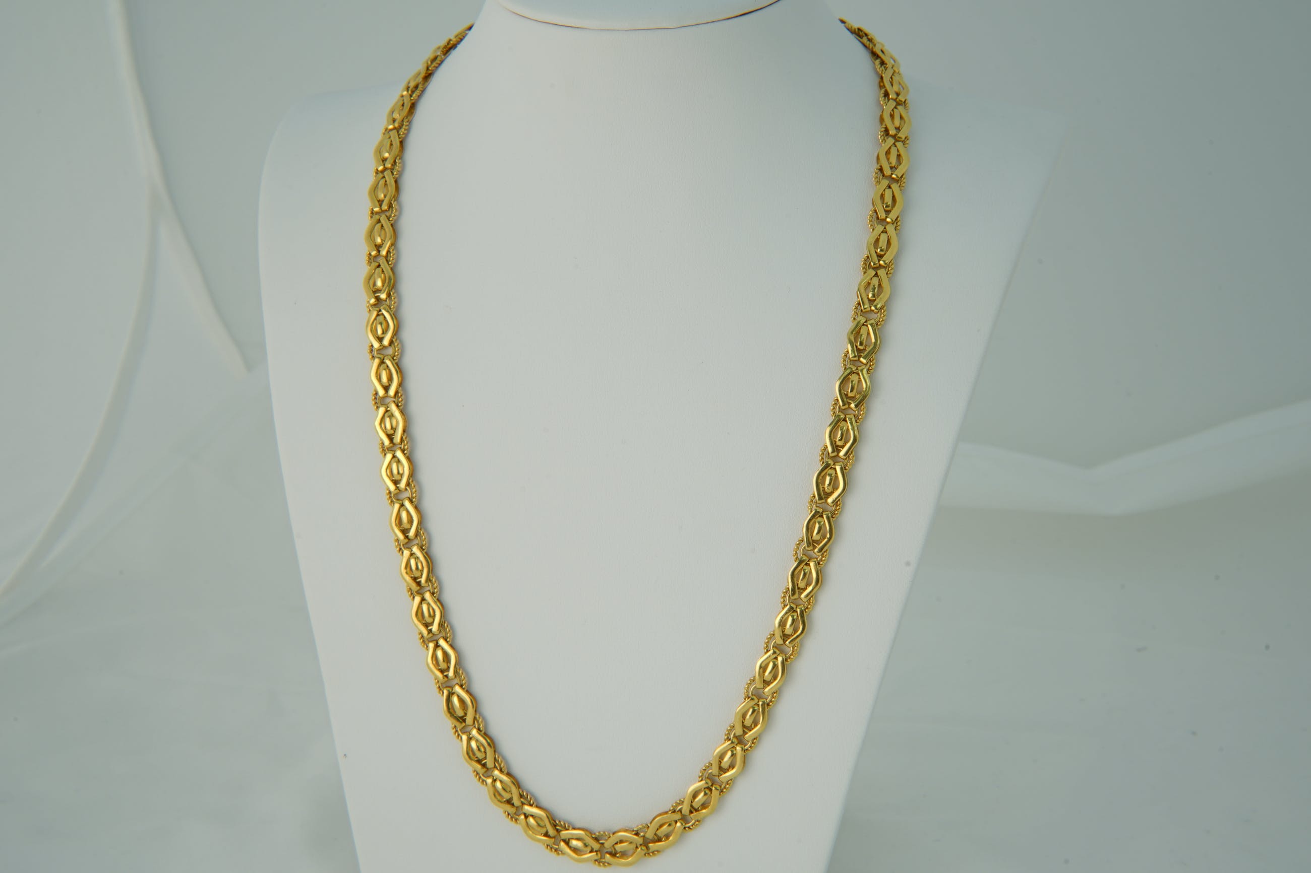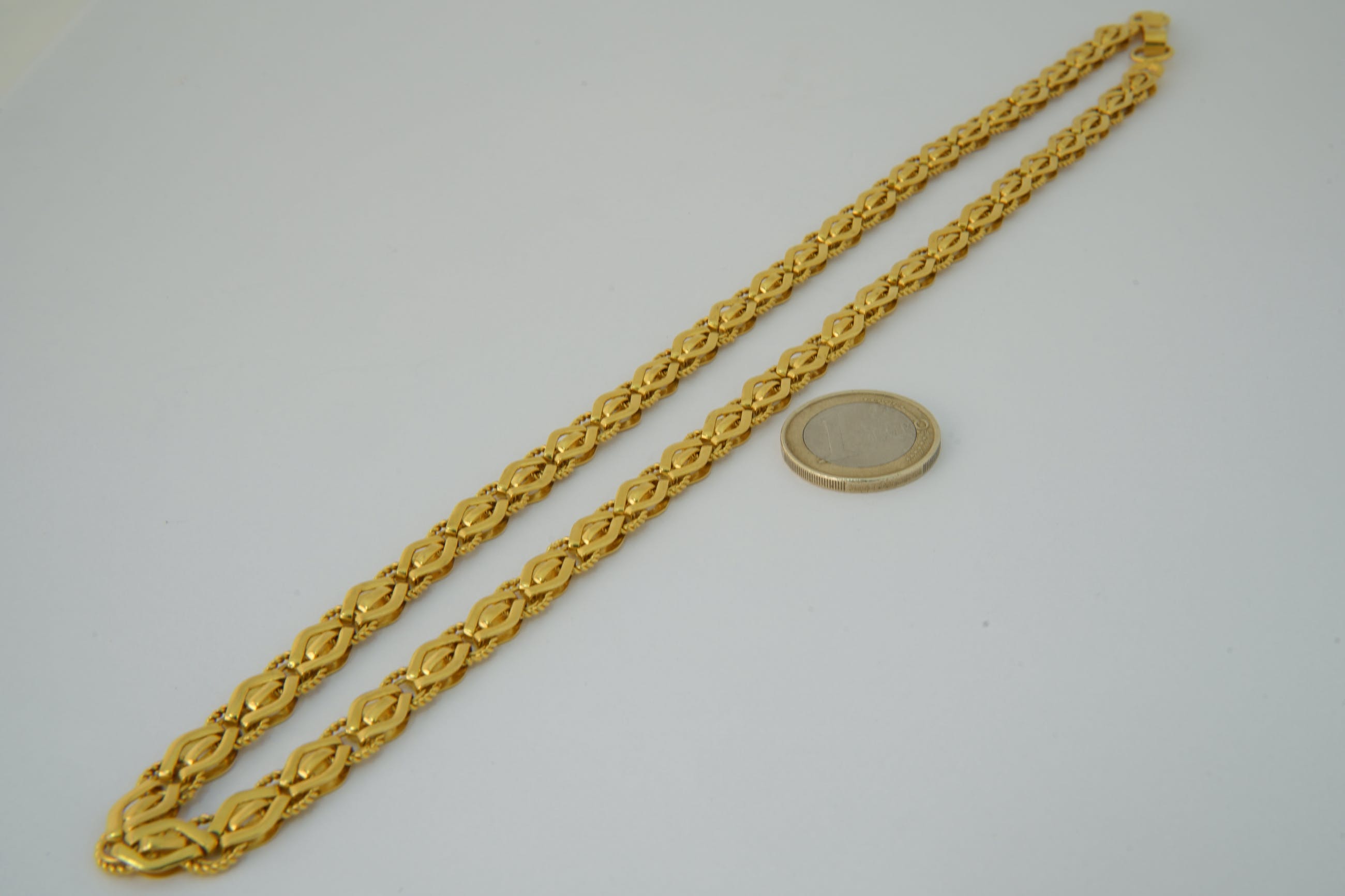 Bijzonder 18 krt. Geel gouden fantasie collier met ruitvormige gladde schakels daar tussen in gedraaide rondeschakels.  Lengte 550mm Breedte 7mm Dikte 3mm. 48.5 gram