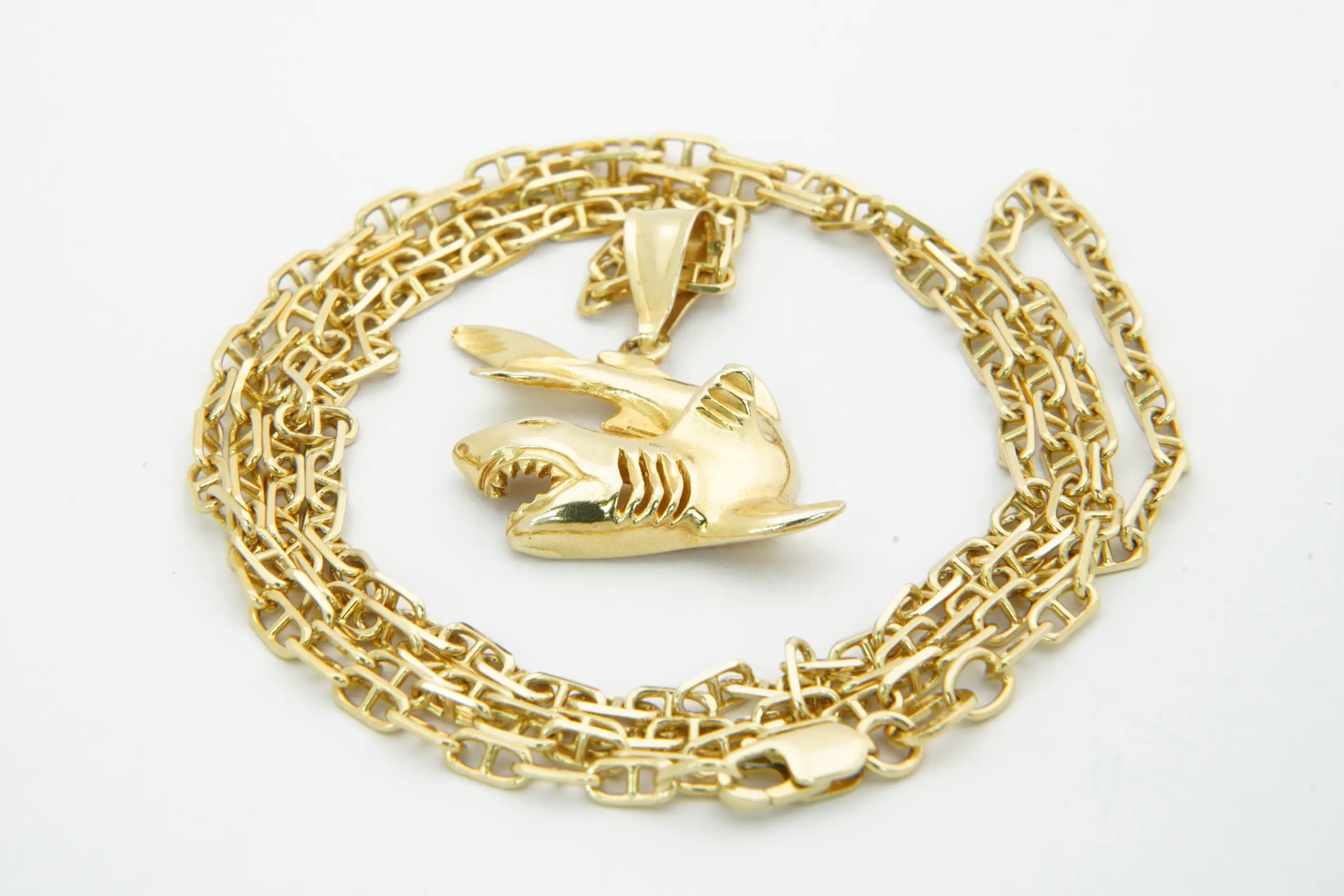 • U biedt op zo goed als nieuw 18 krt geel gouden "Anker" collier. (ca. 65 cm), met daaraan een 14 krt gouden Haai hanger.