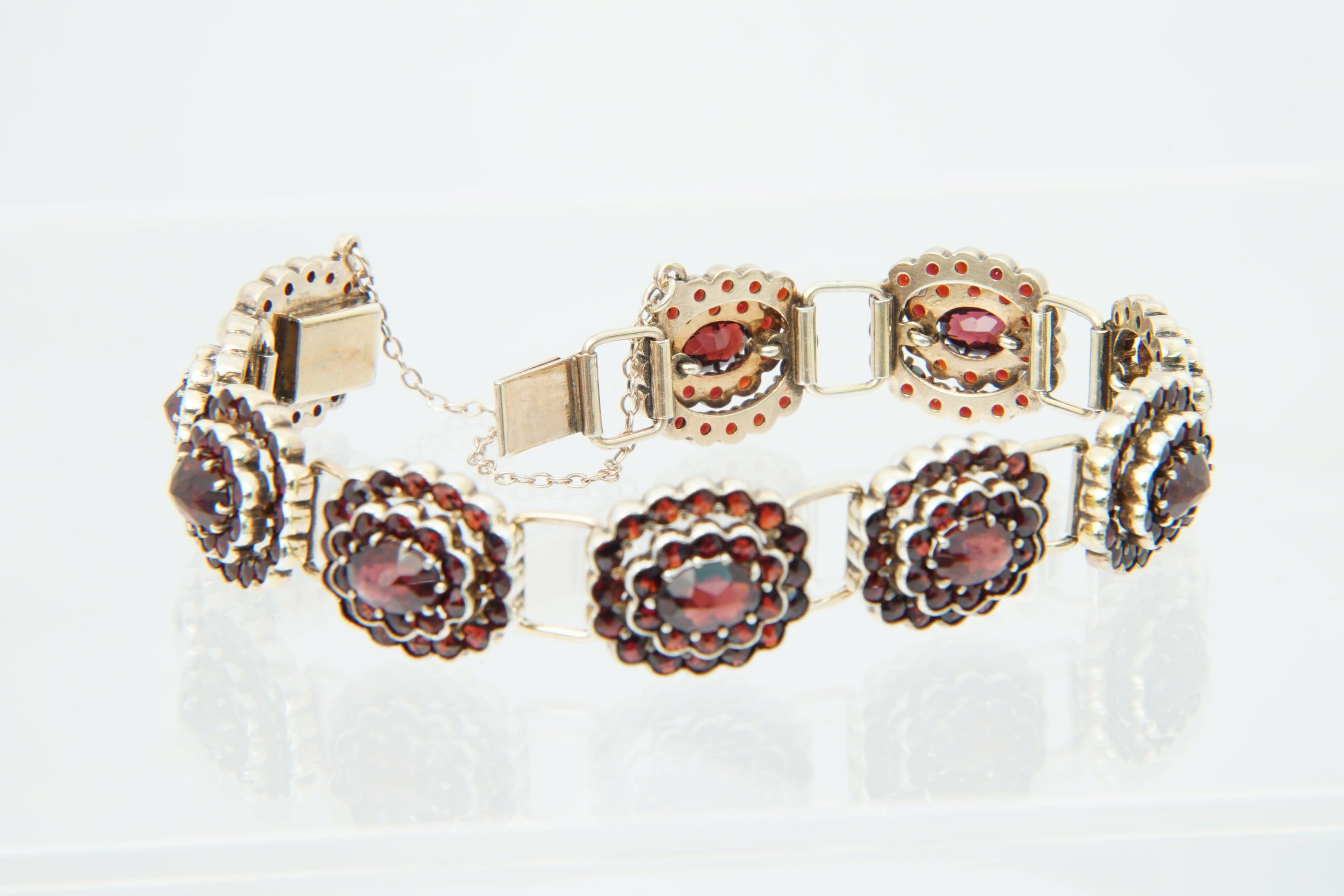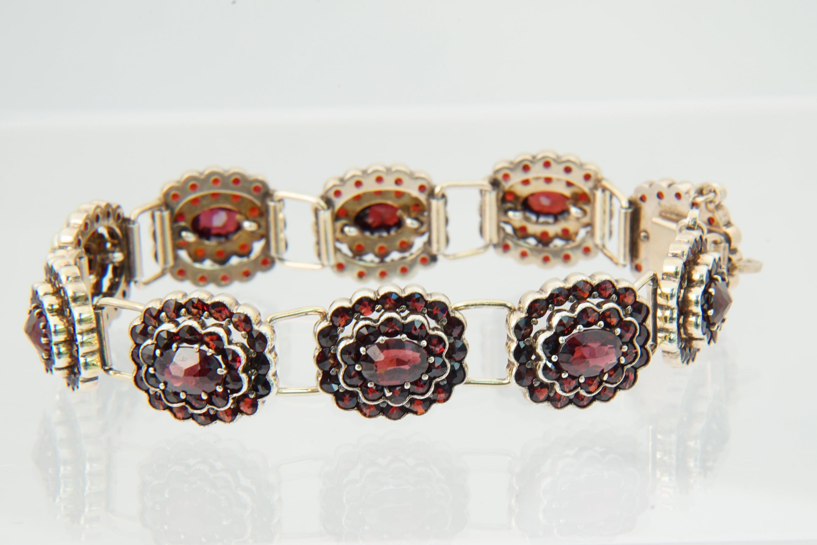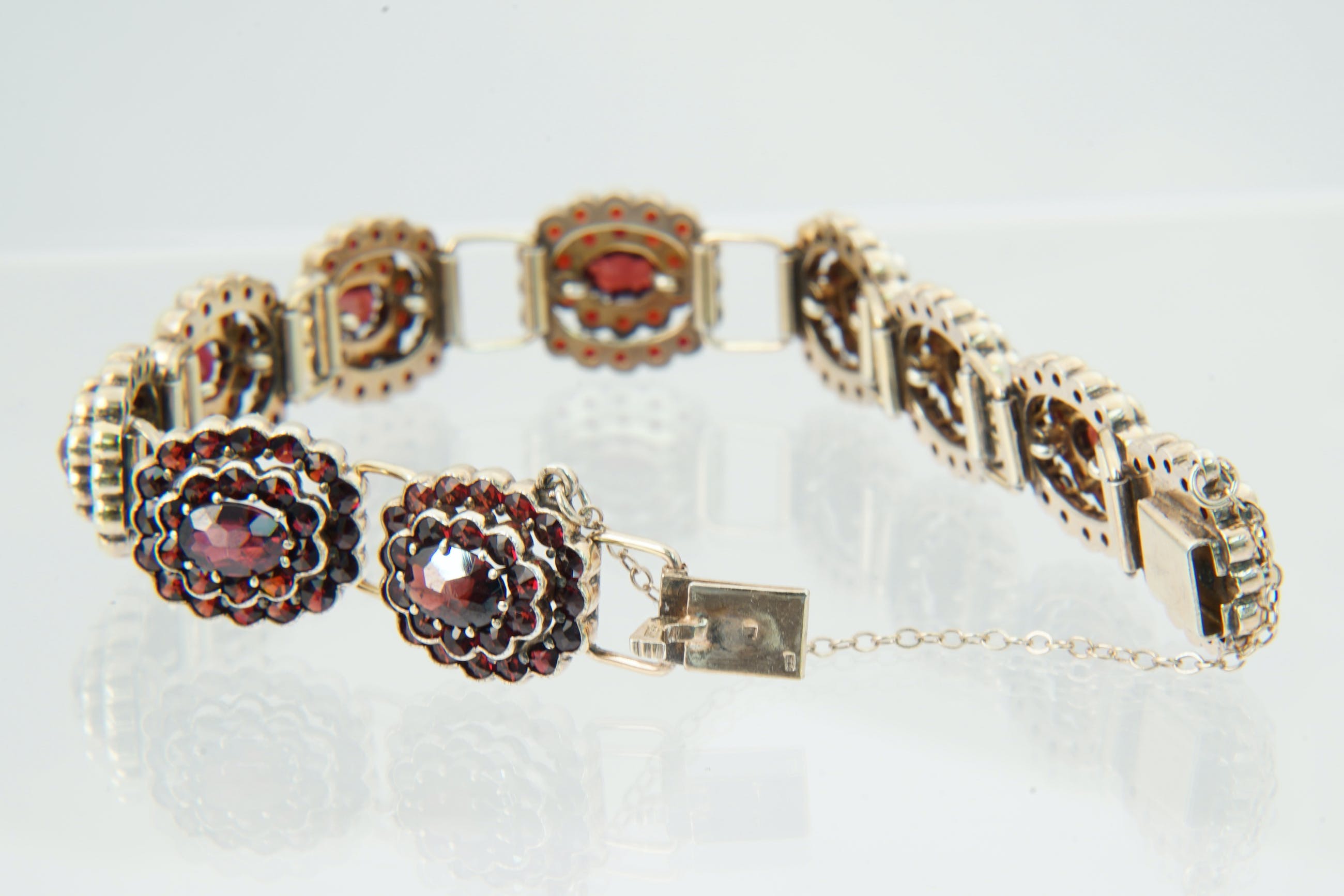 • U biedt op een bijzondere, omstreeks 1940 gemaakte 2e gehalte zilveren "bootjes" armband. De 10 los geschakelde "bootjes" bevatten ieder een grote centrale dieprode Granaat omringd door 2 gelaagde rijen van 26 granaatjes. Voorzien van solide bakslot en veiligheidskettinkje. Alle stenen in goede conditie. De armband zelf verkeert ook in goede conditie.