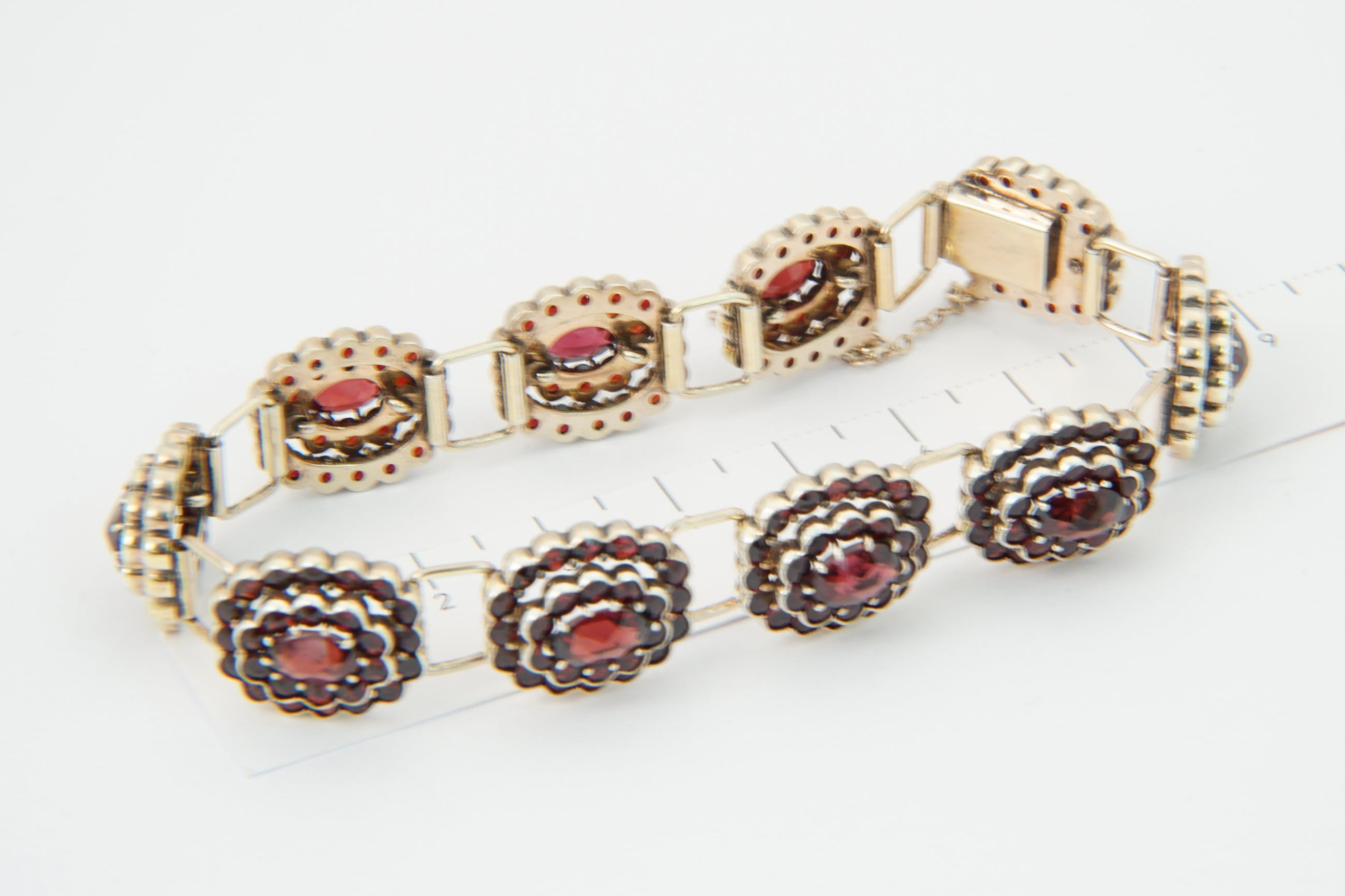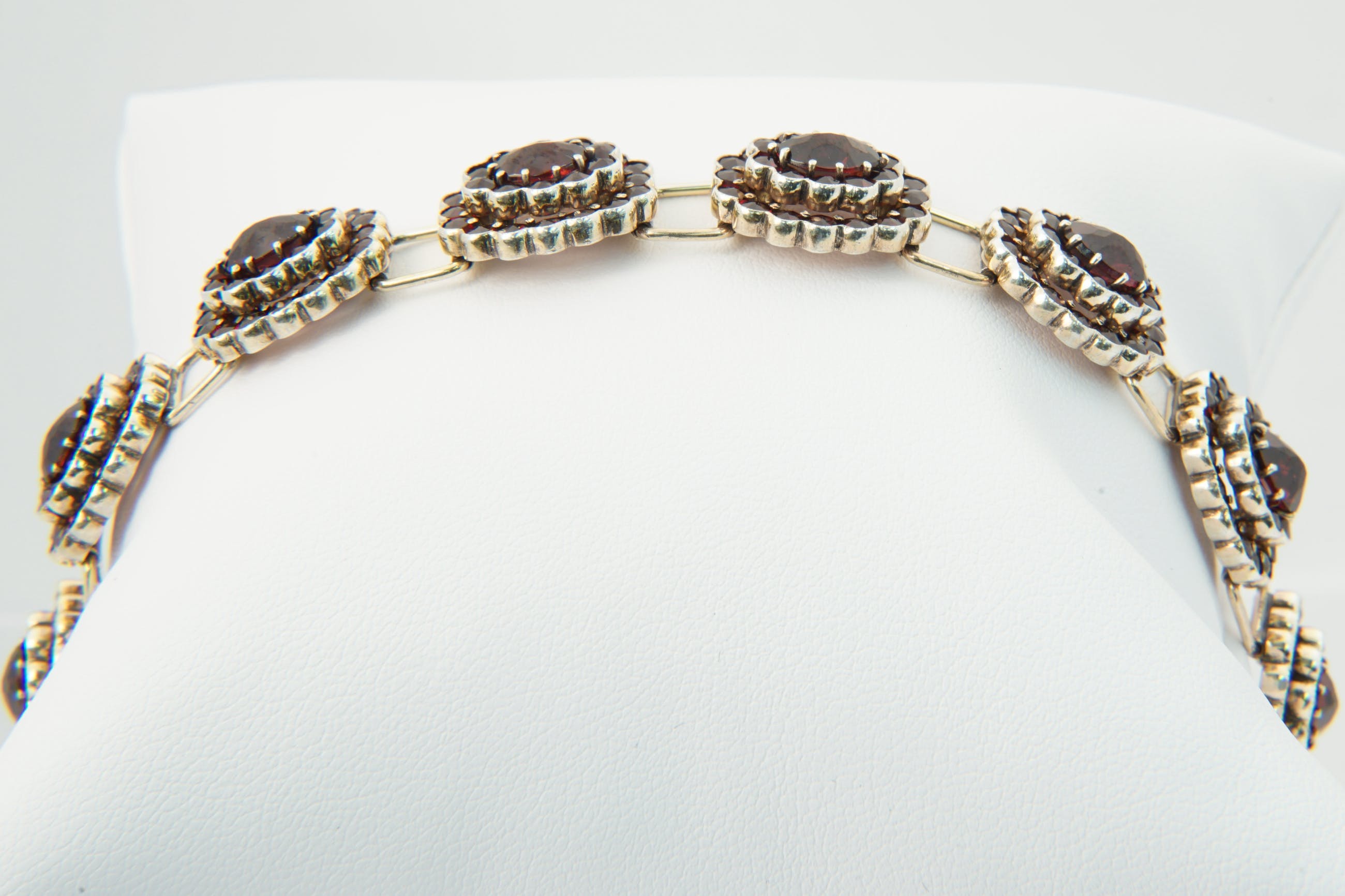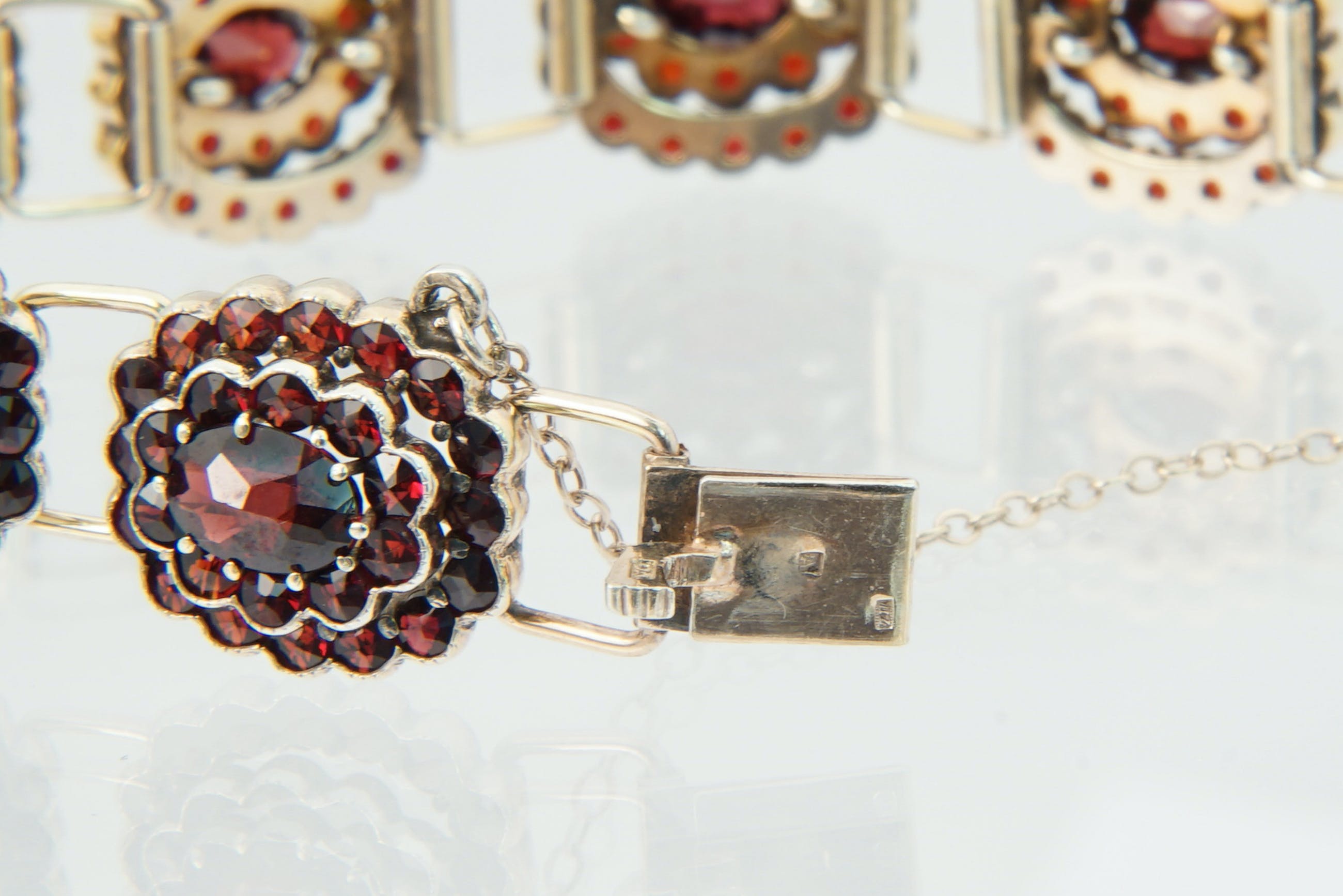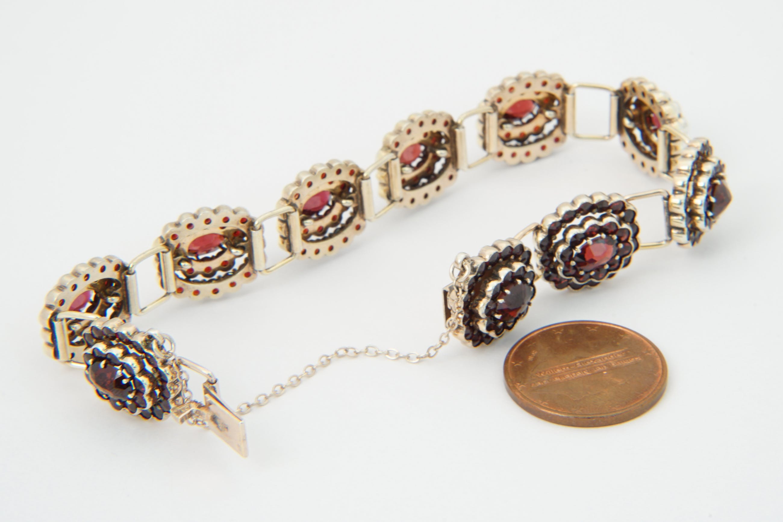 • U biedt op een bijzondere, omstreeks 1940 gemaakte 2e gehalte zilveren "bootjes" armband. De 10 los geschakelde "bootjes" bevatten ieder een grote centrale dieprode Granaat omringd door 2 gelaagde rijen van 26 granaatjes. Voorzien van solide bakslot en veiligheidskettinkje. Alle stenen in goede conditie. De armband zelf verkeert ook in goede conditie.