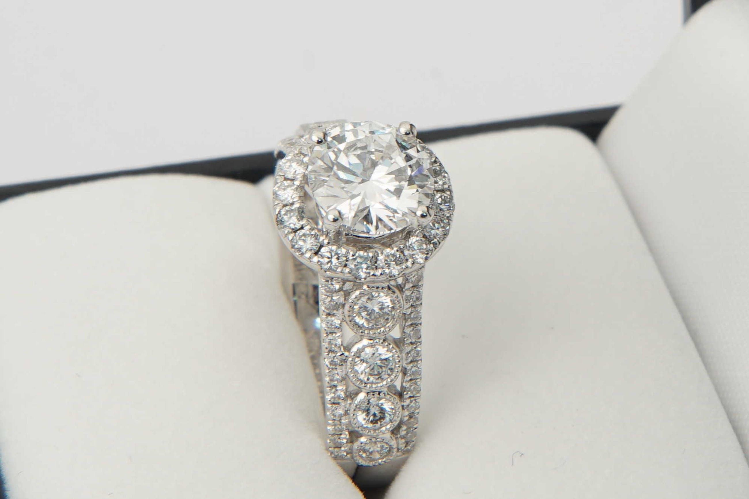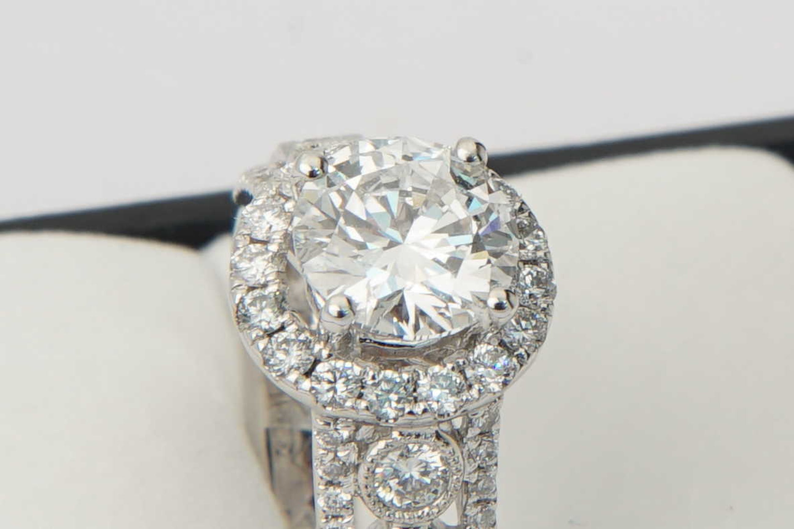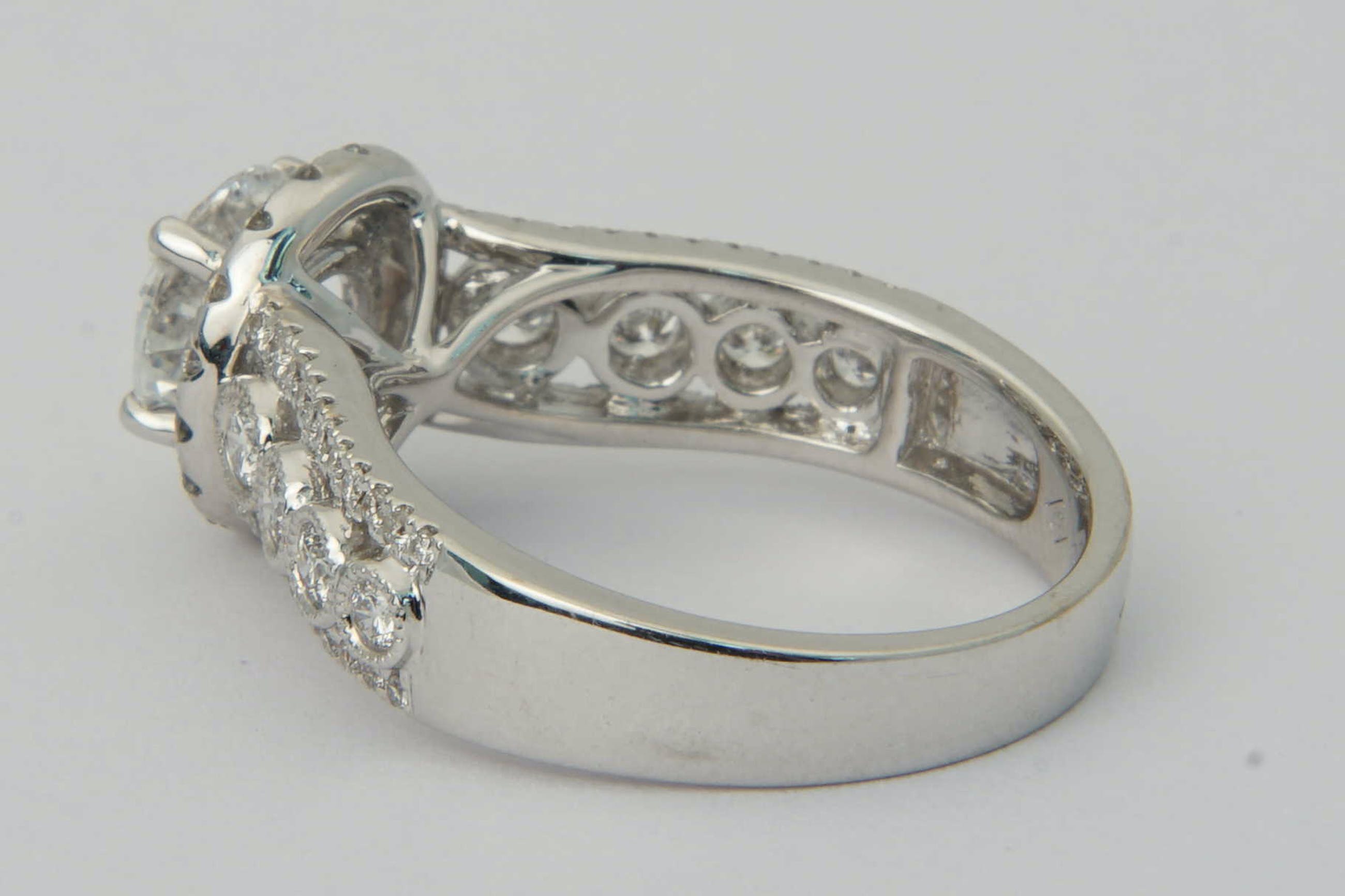 • U biedt op een exclusieve 18 karaats wit-gouden en diamanten dames Fantasie-ring.  Opvallend vormgegeven ring met centraal een briljant geslepen diamant van ca. 1.20ct - daaromheen een ring met daarin 17 separaat gezette briljanten totaal ca. 0.30ct. Op de scheen van de ring links en rechts van de centrale steen zijn 3 rijen briljanten geplaatst. De middelste rij bevat totaal 8 separaat gezette briljanten tot ca.0.30 ct. De buitenste rijen bevatten in totaal 44 separaat gezette briljantjes tot ca. 0.25 ct.