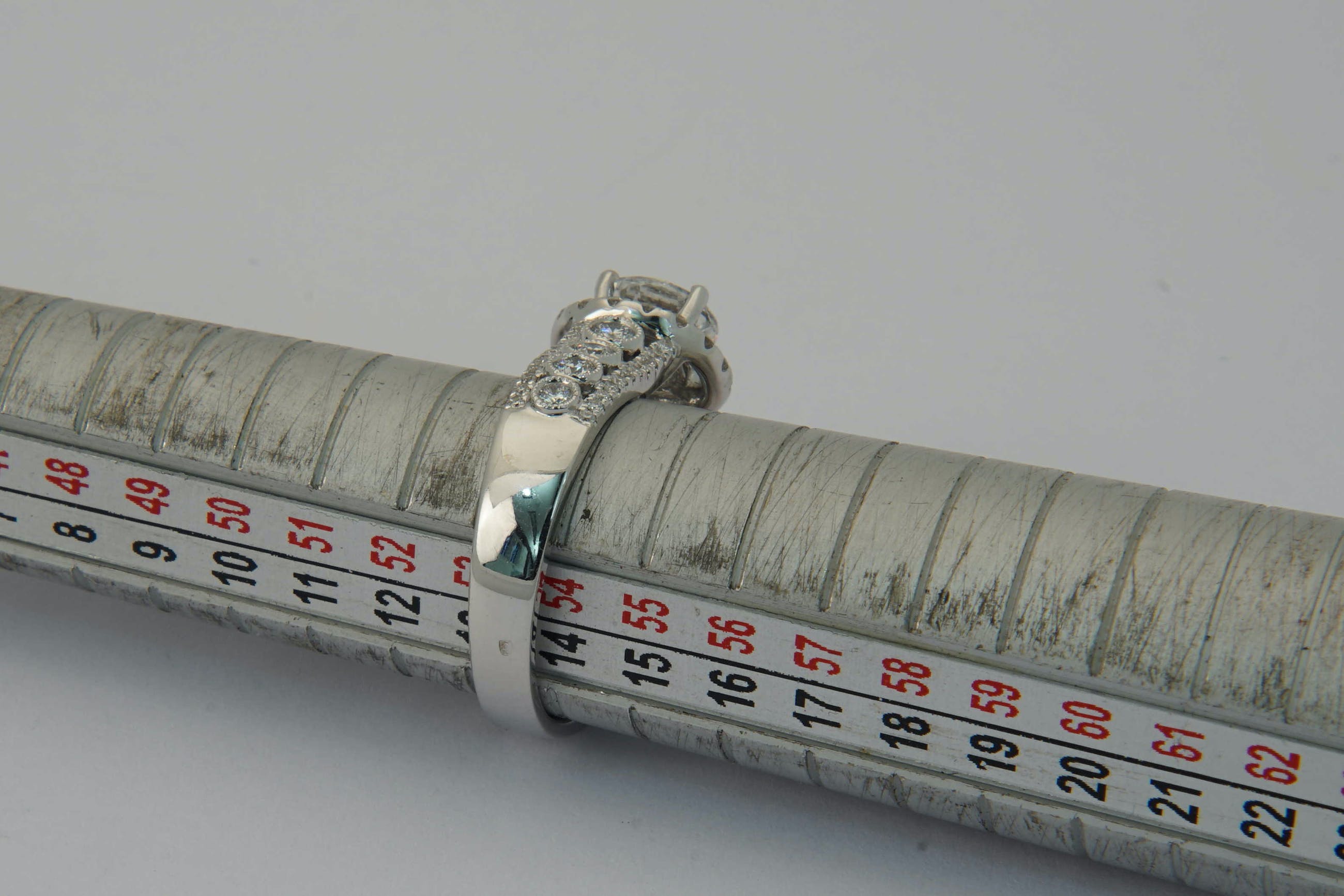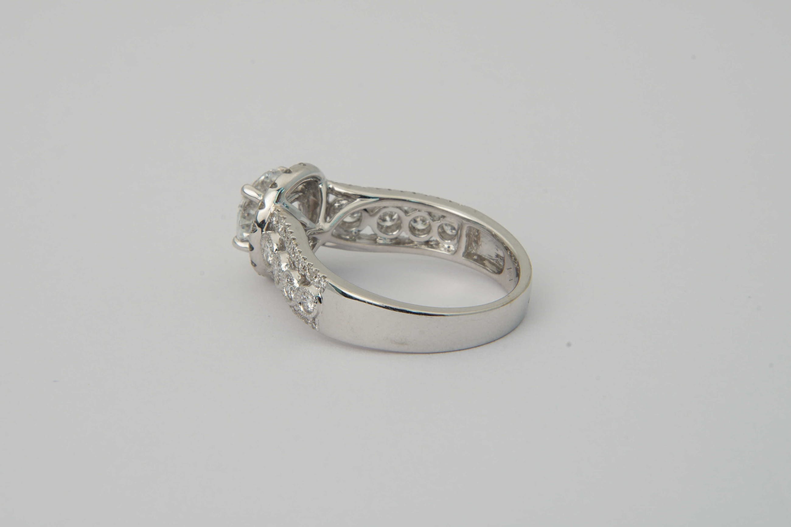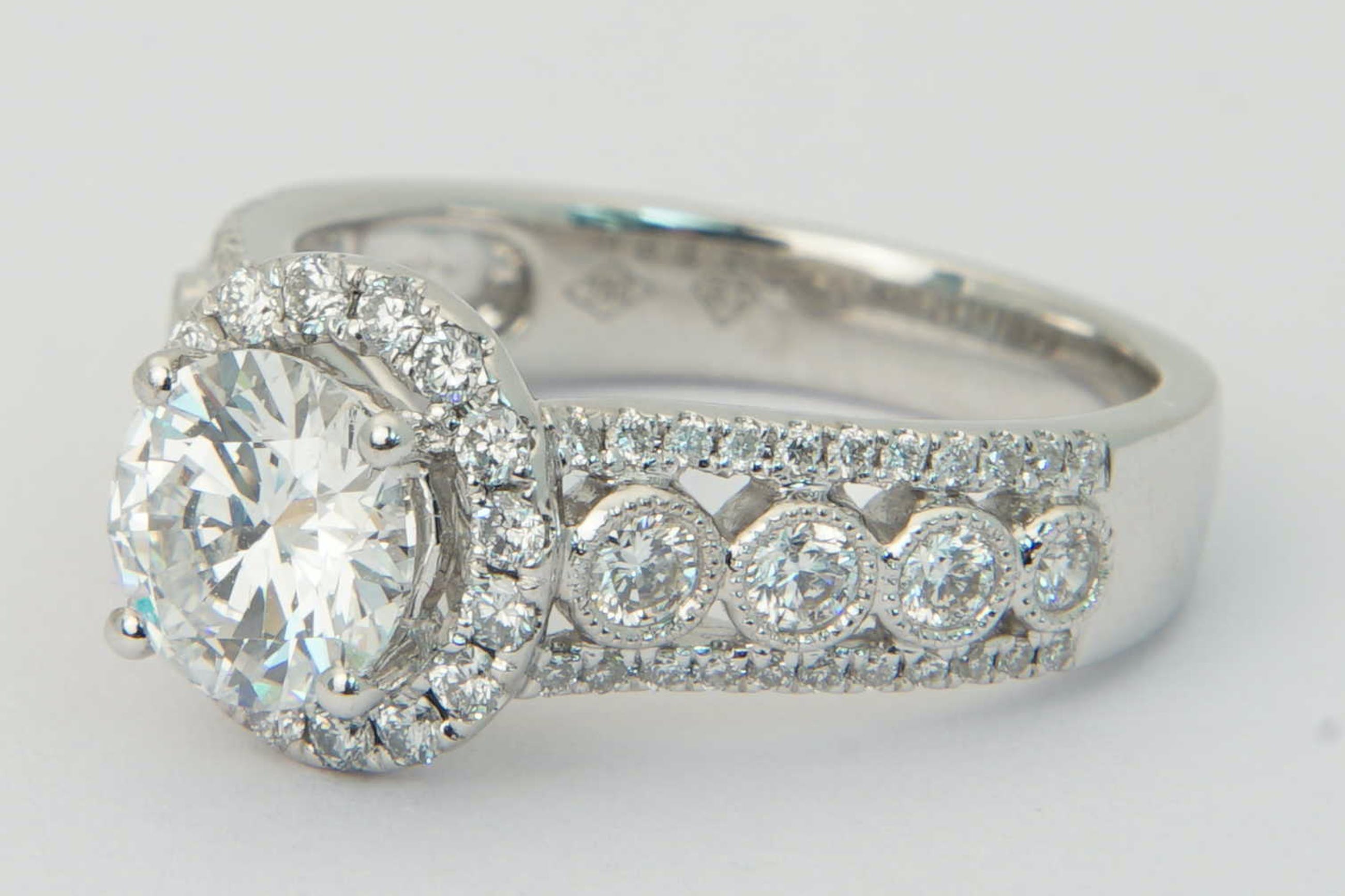 • U biedt op een exclusieve 18 karaats wit-gouden en diamanten dames Fantasie-ring.  Opvallend vormgegeven ring met centraal een briljant geslepen diamant van ca. 1.20ct - daaromheen een ring met daarin 17 separaat gezette briljanten totaal ca. 0.30ct. Op de scheen van de ring links en rechts van de centrale steen zijn 3 rijen briljanten geplaatst. De middelste rij bevat totaal 8 separaat gezette briljanten tot ca.0.30 ct. De buitenste rijen bevatten in totaal 44 separaat gezette briljantjes tot ca. 0.25 ct.