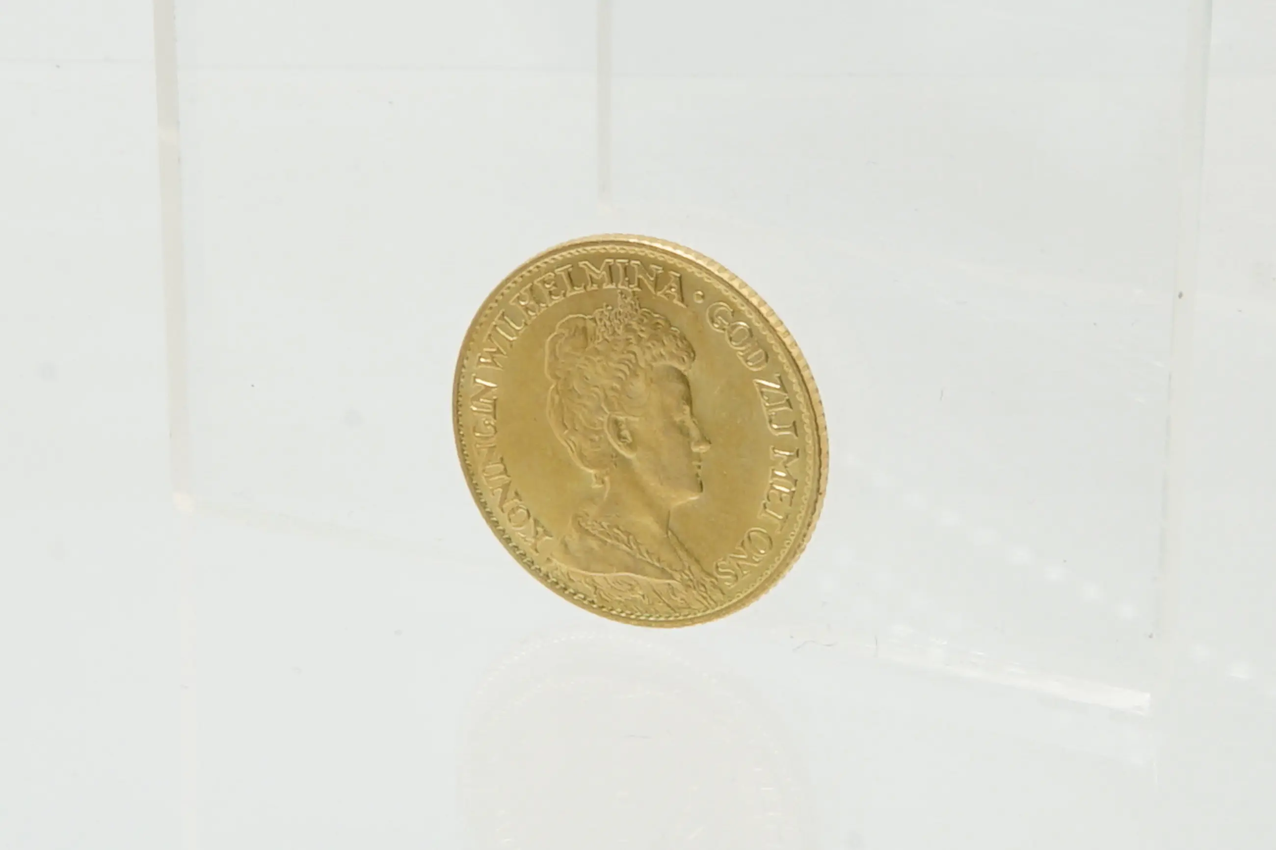 • U biedt op een origineel , (900/1000) geel-gouden in 1917 door de Koninklijke Munt  geslagen Hollandse Wilhelmina 10 gulden munt, het zg. "tientje". De munt verkeert in goede conditie.