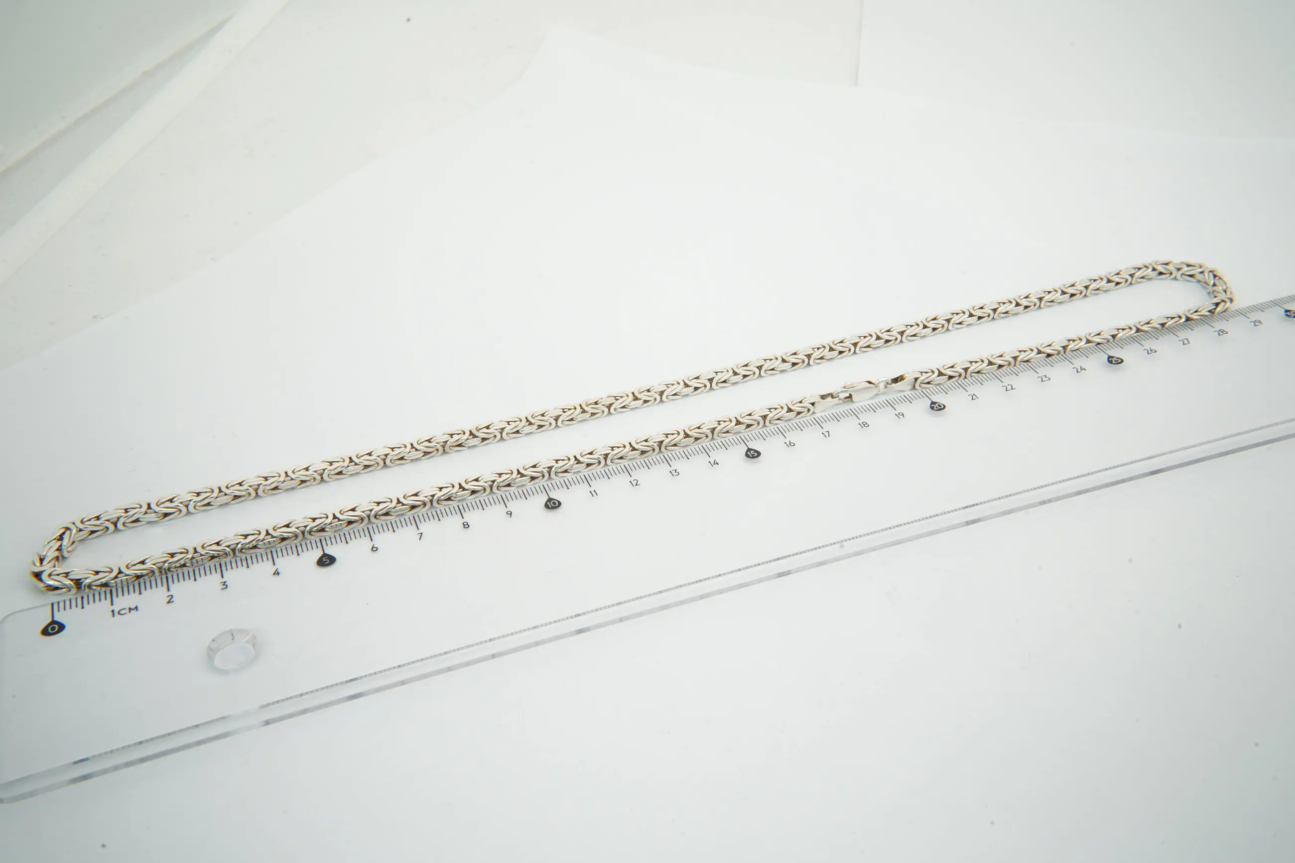 • U biedt op een massief 1e (0.925) gehalte Zilveren zg. "Konings" collier. Dit model heeft vierkante schakels.  De ketting verkeert in goede, strakke conditie en is voorzien van een solide karabijnsluiting.