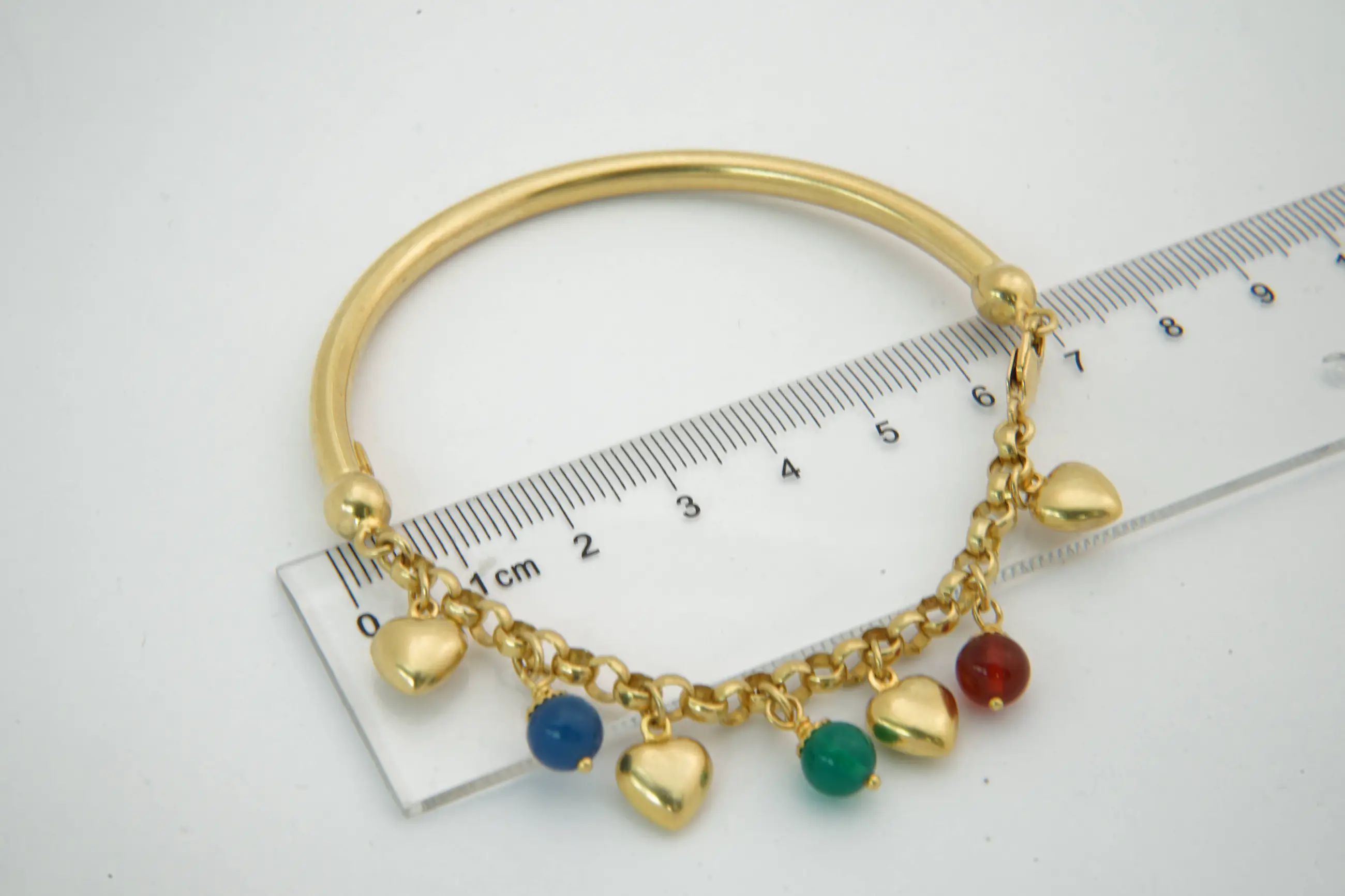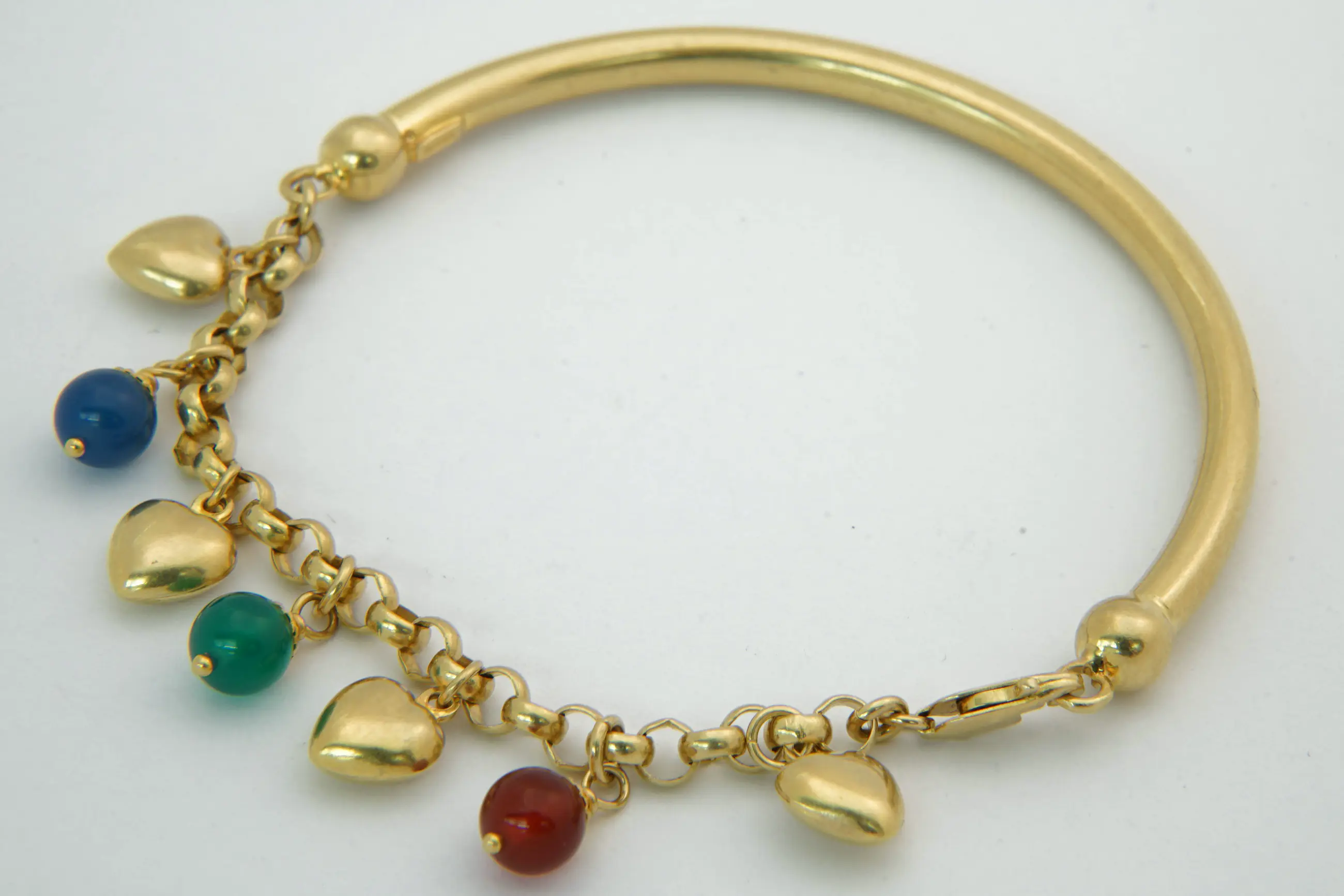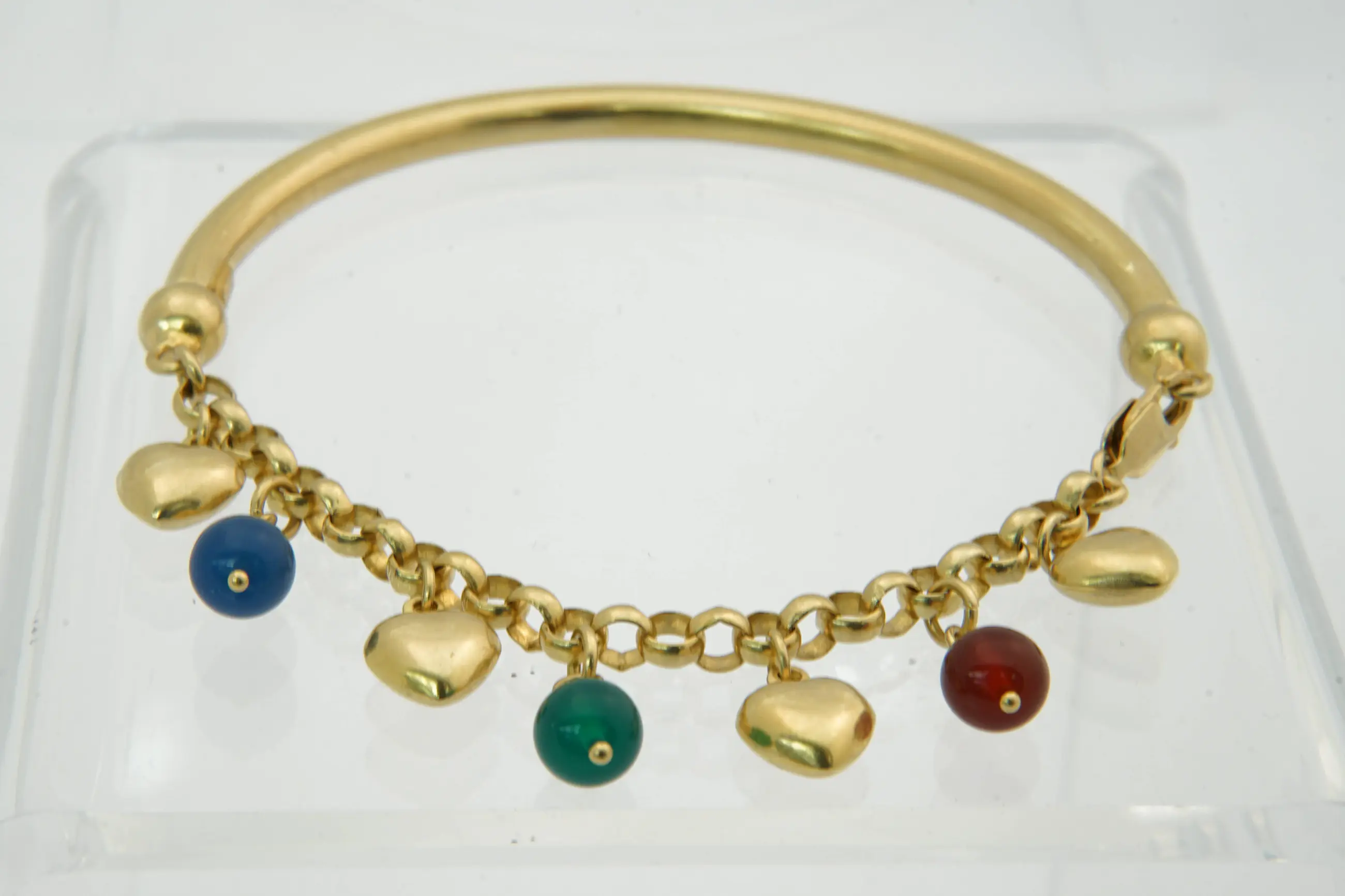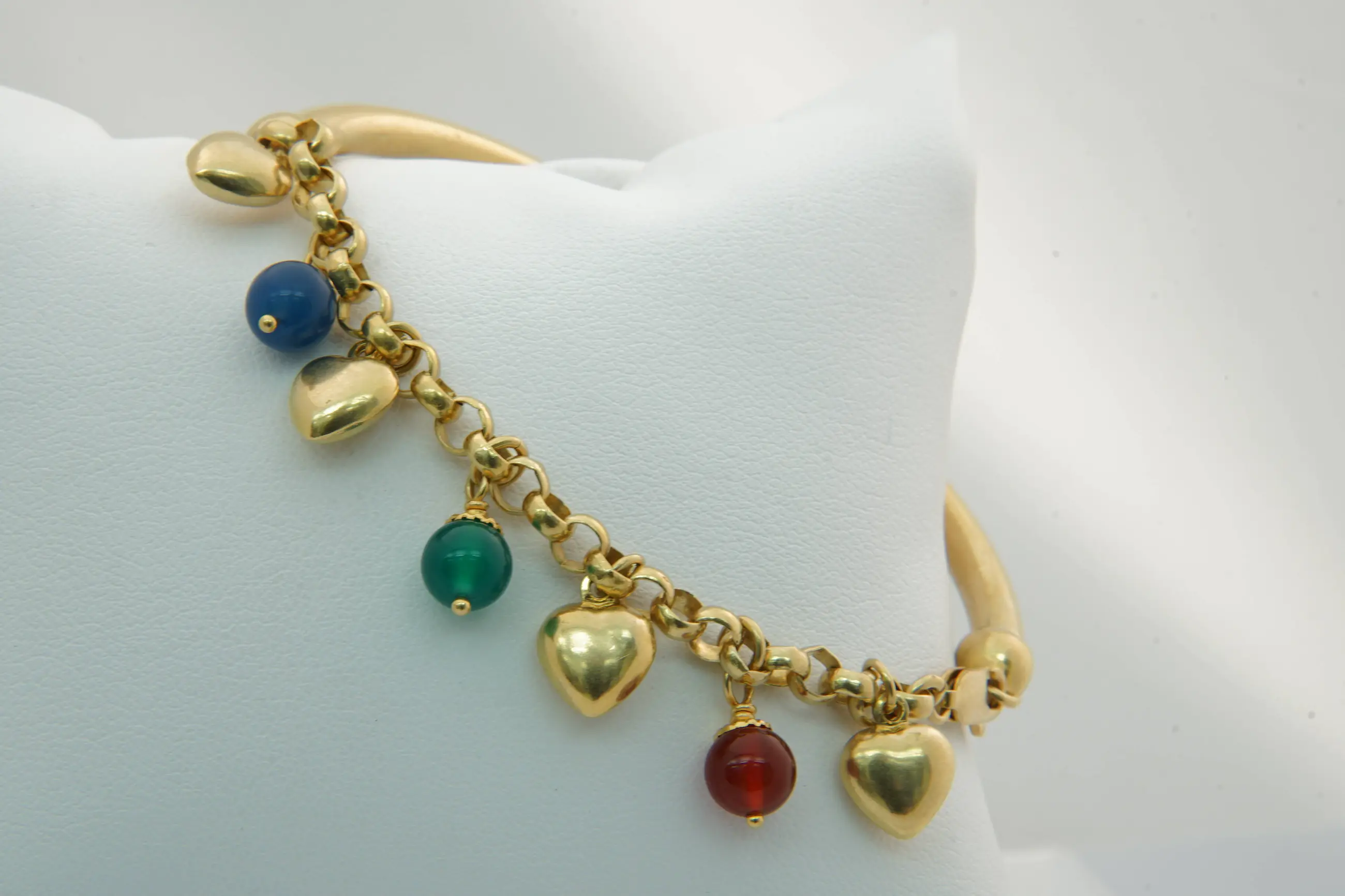• U biedt op een mooie 18 karaats geel gouden armband met in totaal 7 hangertjes. Verkeert in goede staat en voorzien van solide karabijnslot.