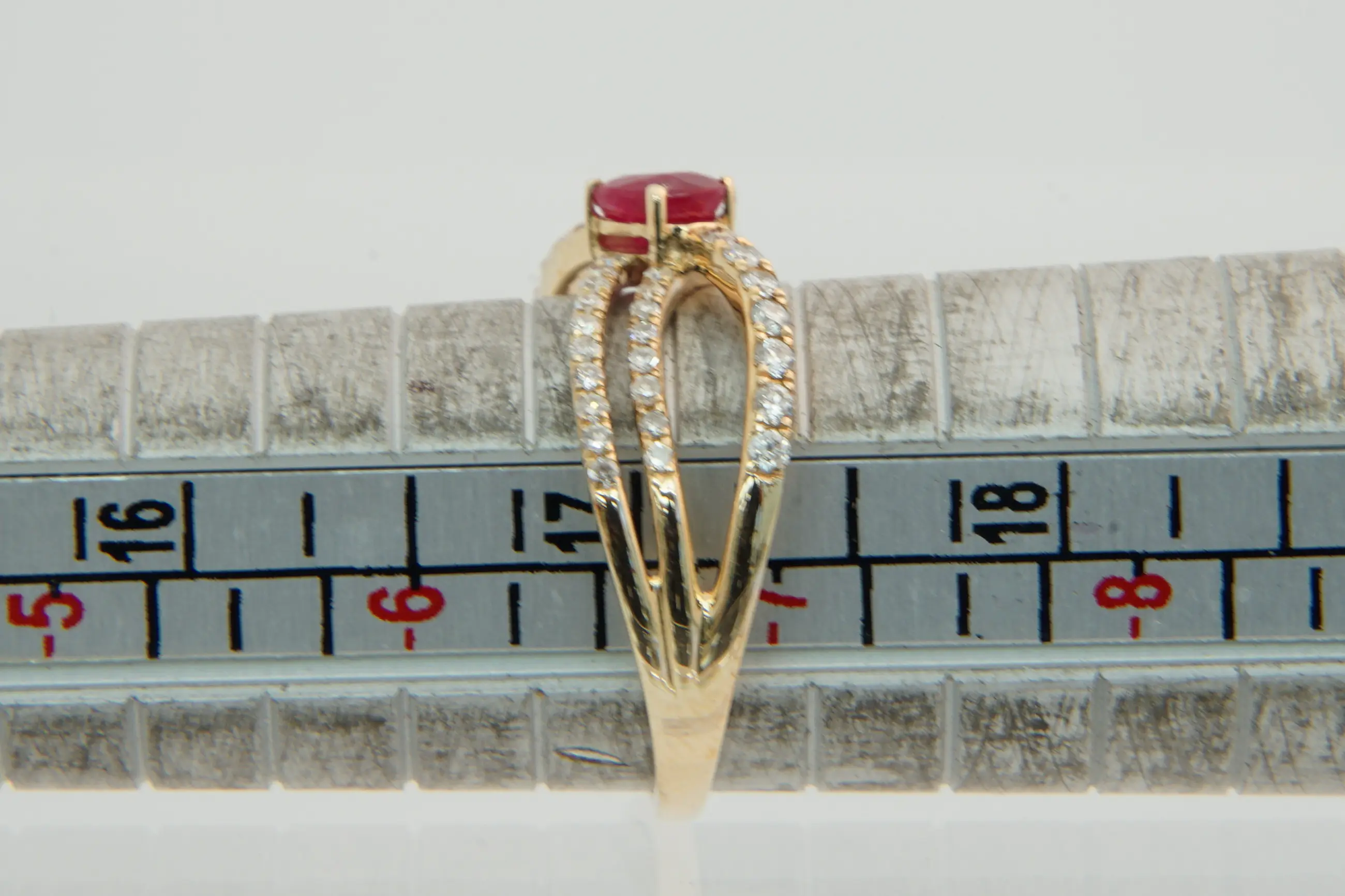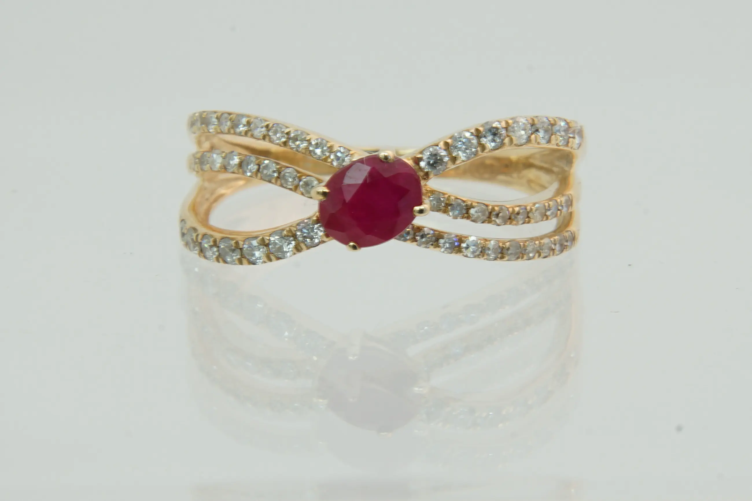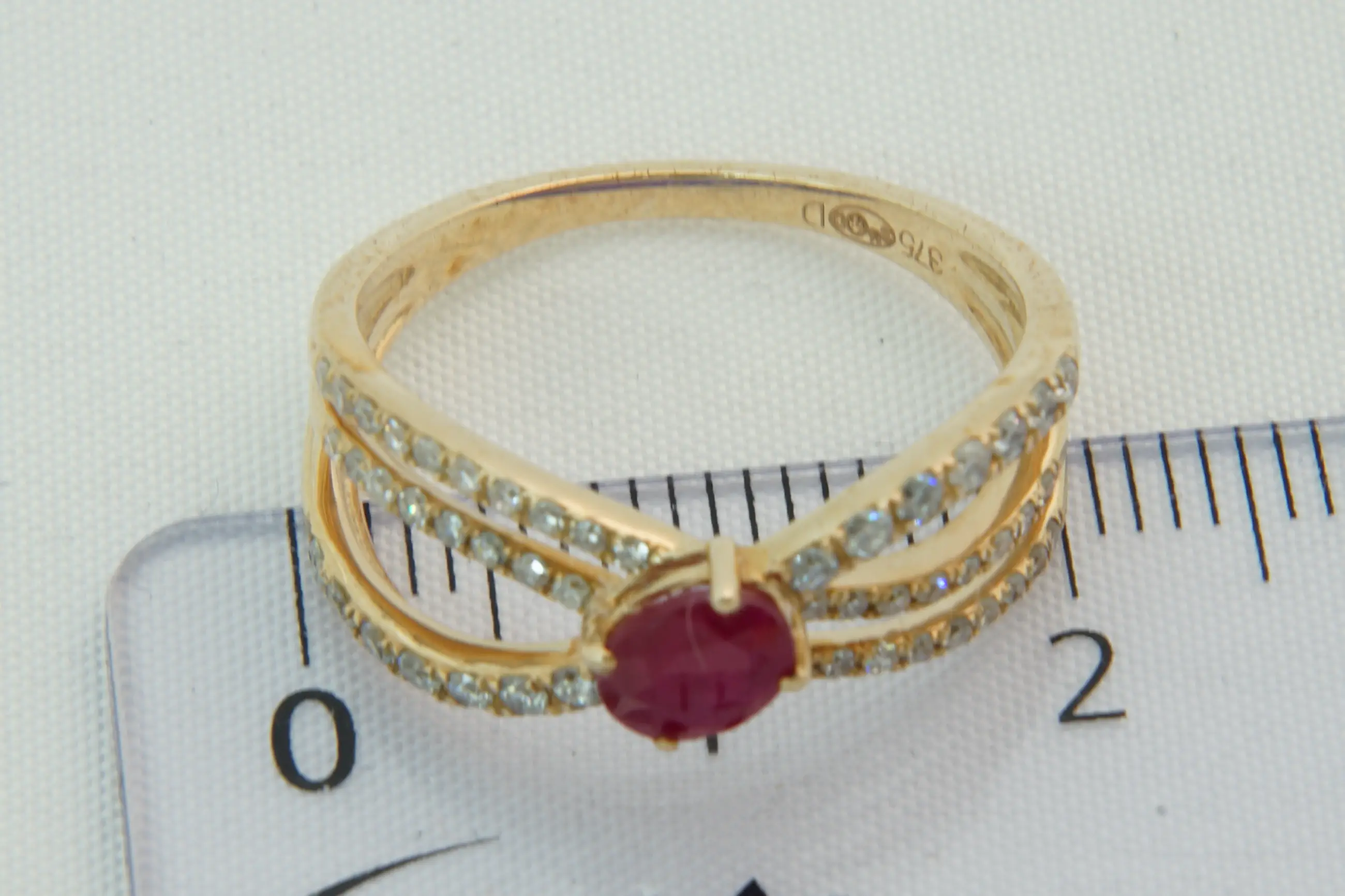 • U biedt op een mooie geel 9 karaats (bwgg) ring met  50 separaat gezette diamantjes (36x achtkant en 14x briljant) met een totaal diamantgewicht van ca. 0.35ct. Bovenop de "cross over" ring is een gefacetteerde ovale rode steen gezet. De ring verkeert in zeer goede conditie.