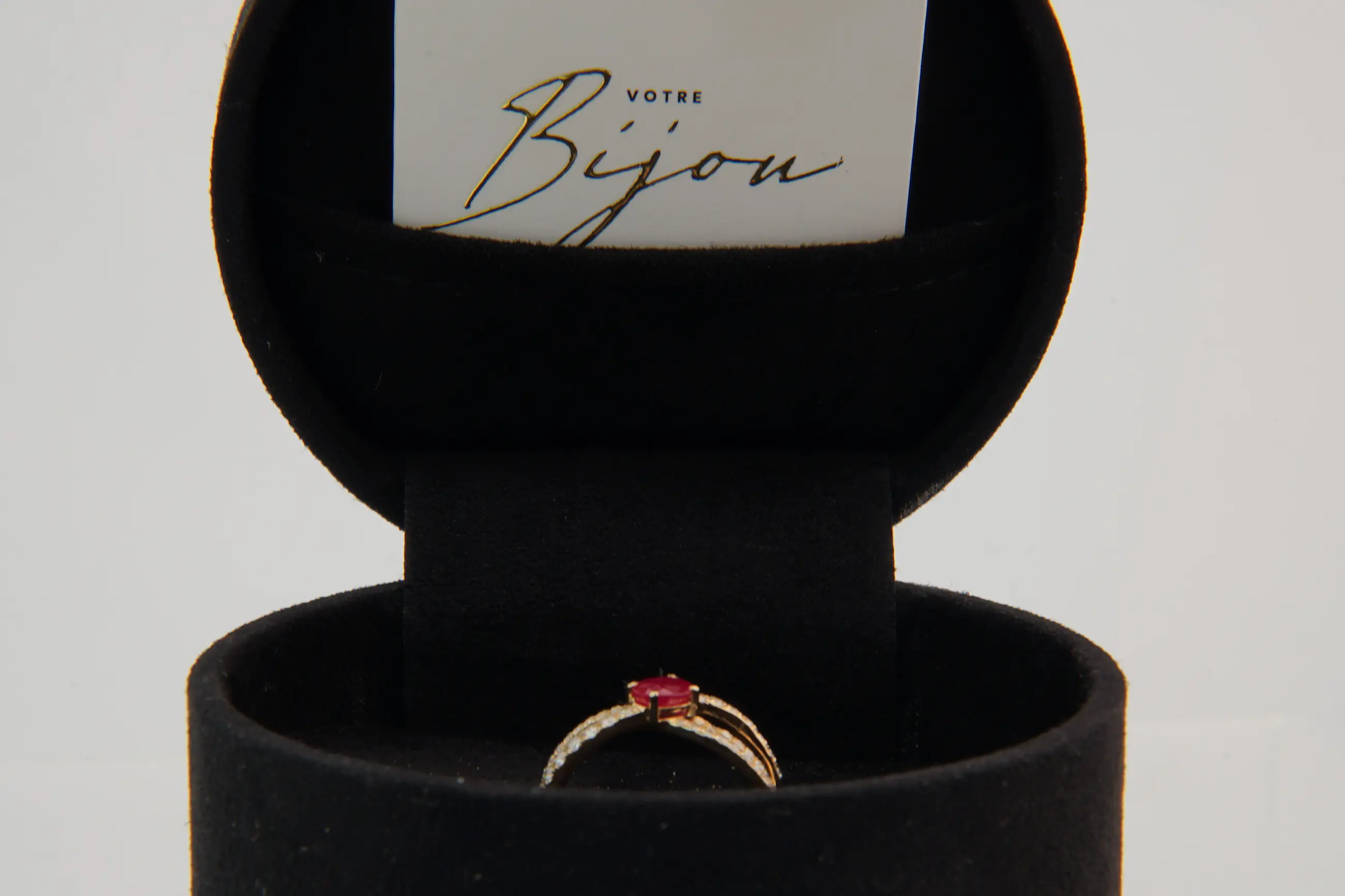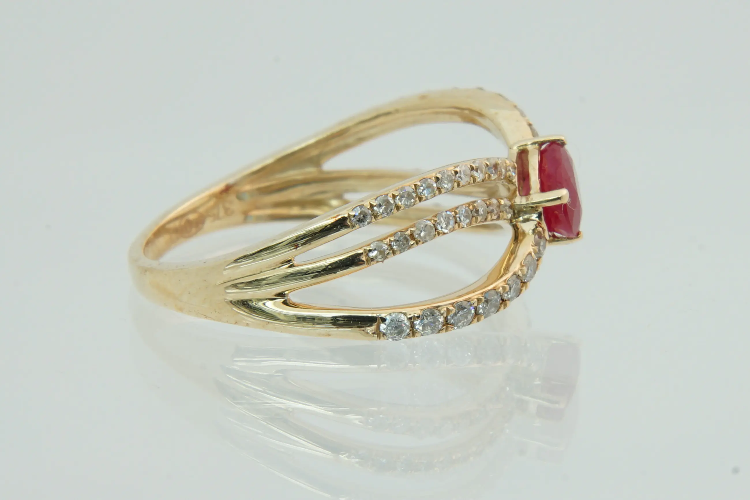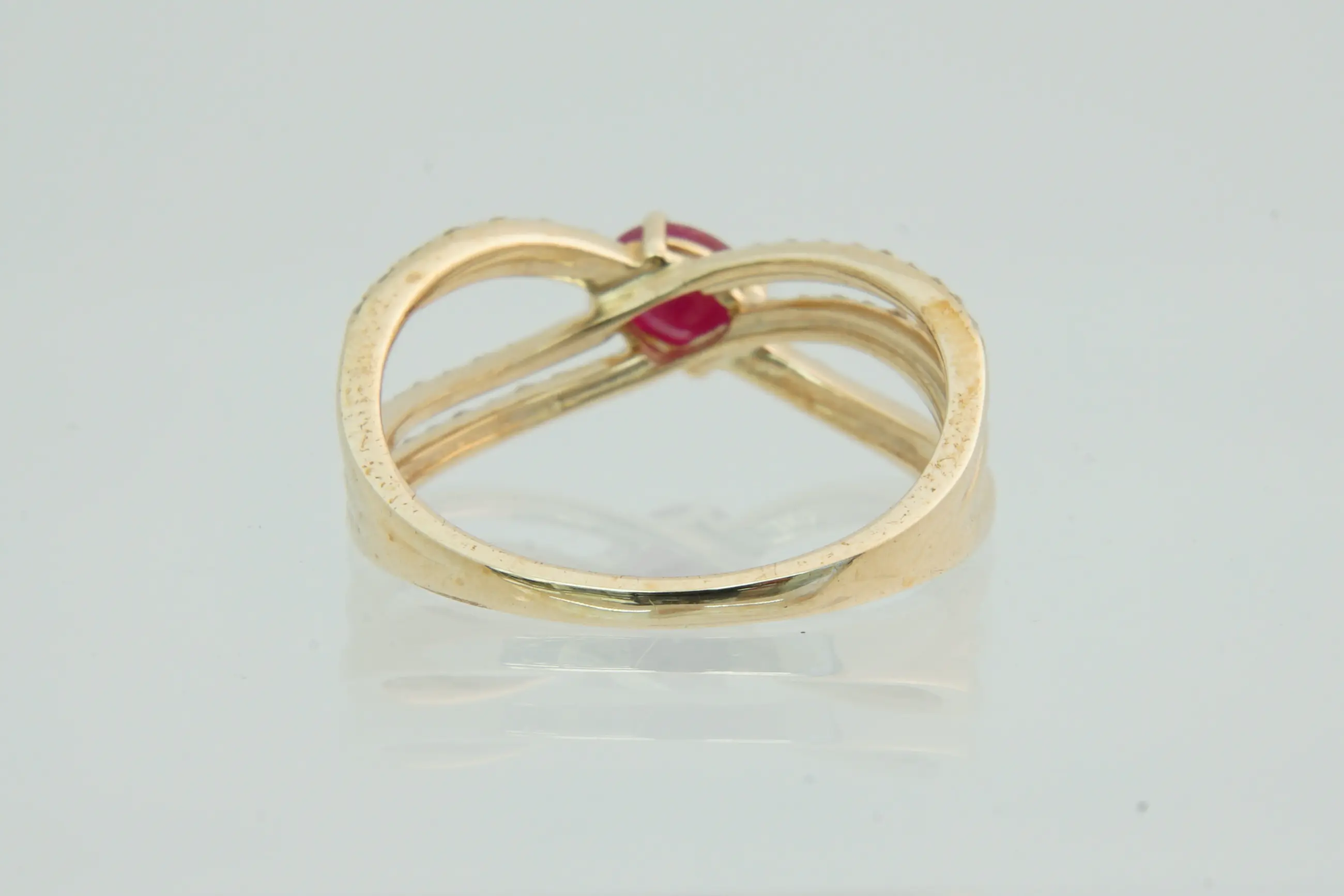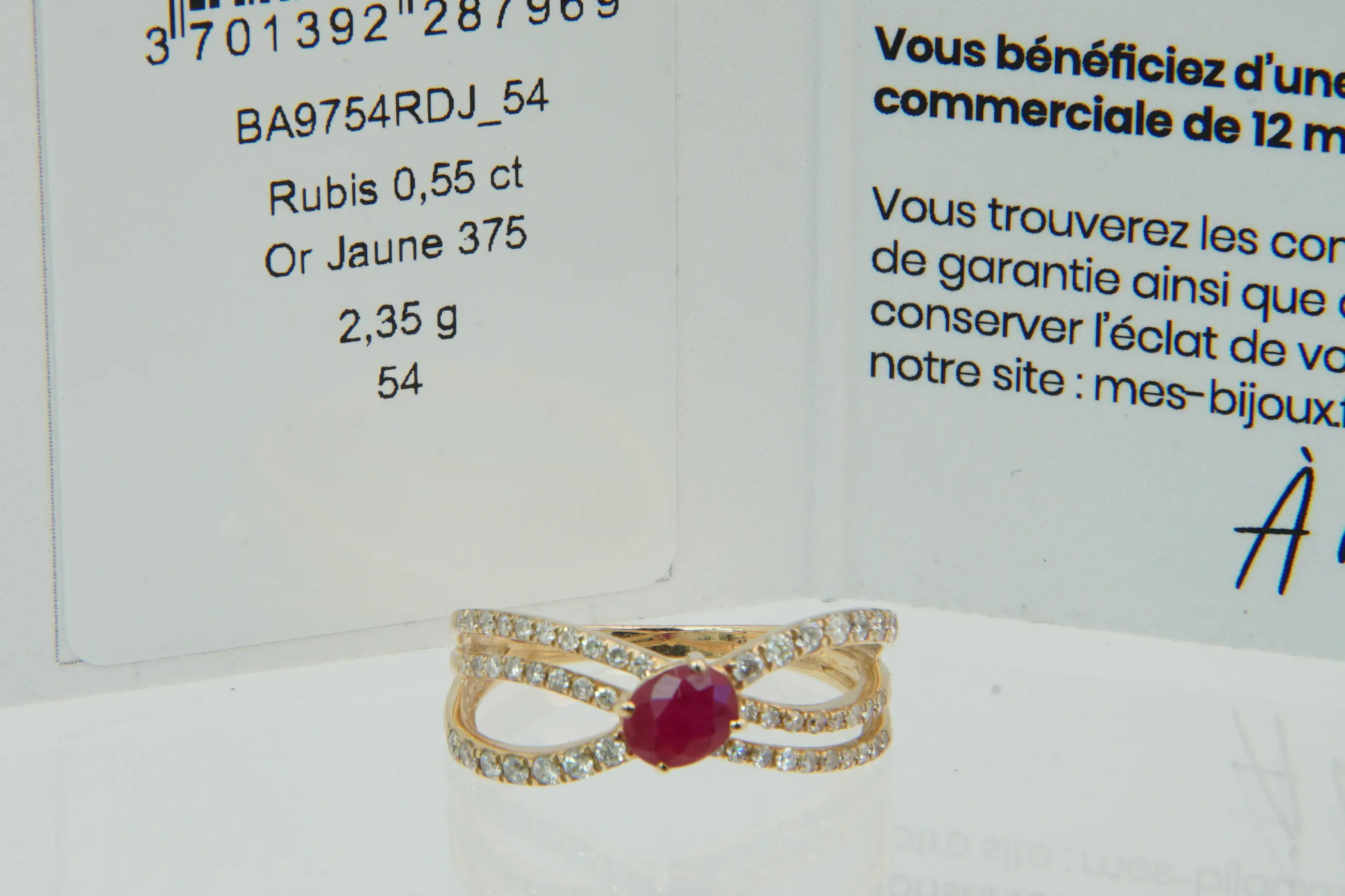 • U biedt op een mooie geel 9 karaats (bwgg) ring met  50 separaat gezette diamantjes (36x achtkant en 14x briljant) met een totaal diamantgewicht van ca. 0.35ct. Bovenop de "cross over" ring is een gefacetteerde ovale rode steen gezet. De ring verkeert in zeer goede conditie.
