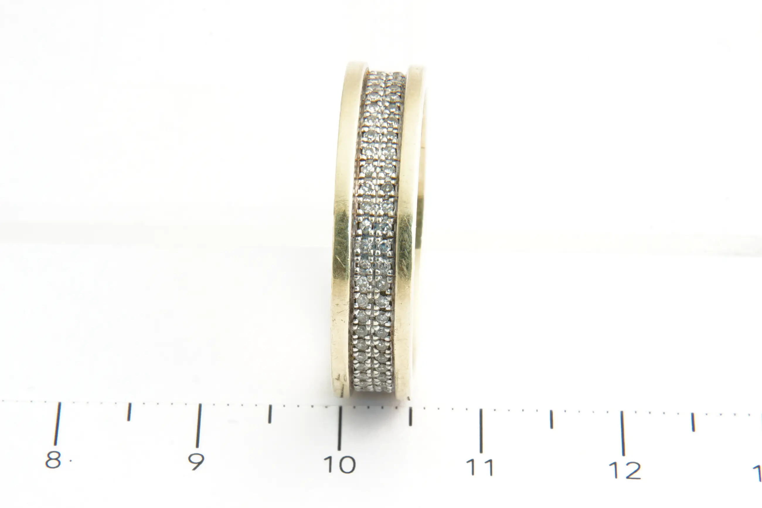 • U biedt op een grote 14 karaats bicolor gouden ring met ca. 100 achtkant geslepen diamantjes totaal ca 0.40crt, separaat gezet in twee witgouden, verzonken, dubbele rijen. De geelgouden scheen is licht gematteerd.