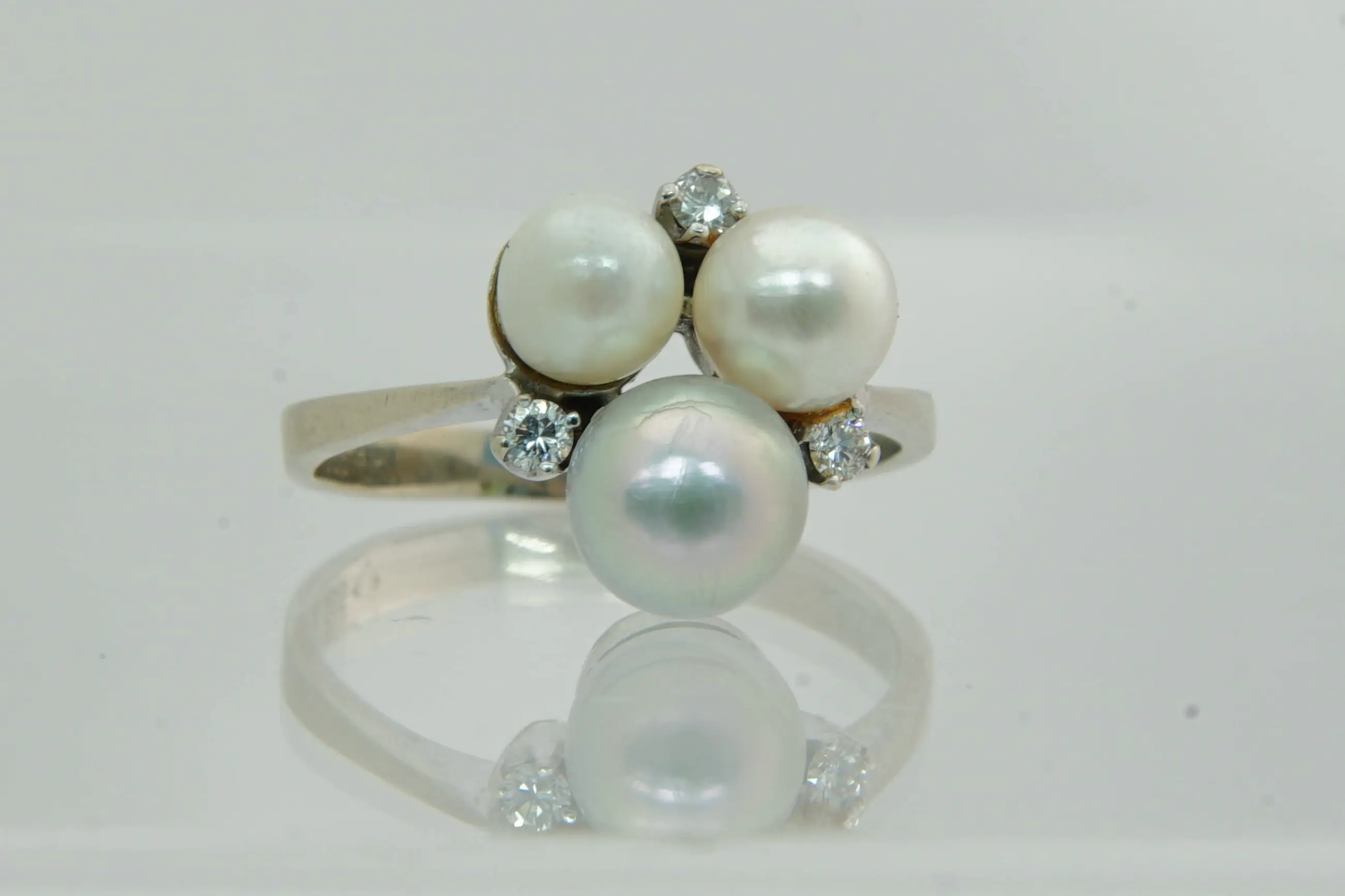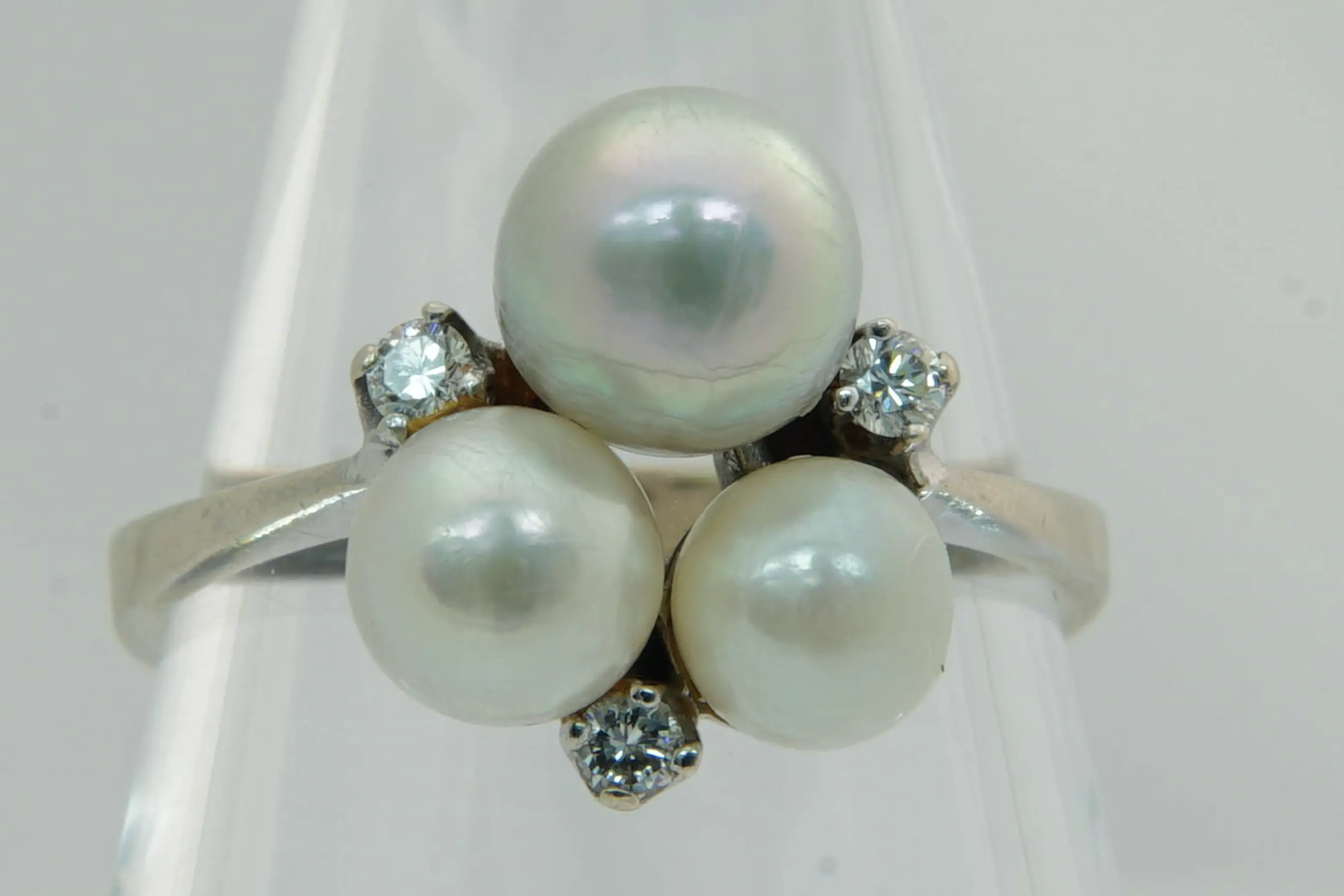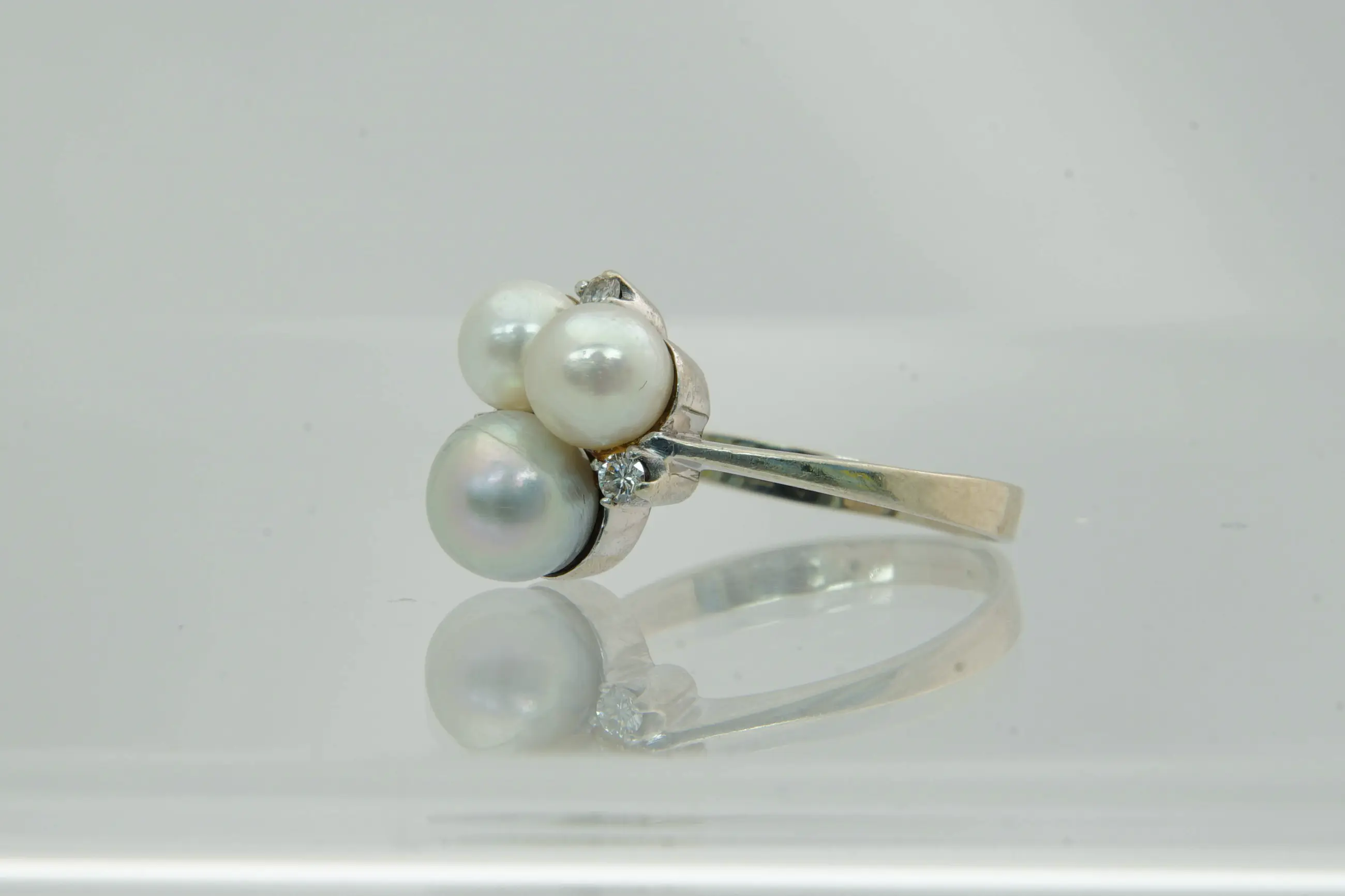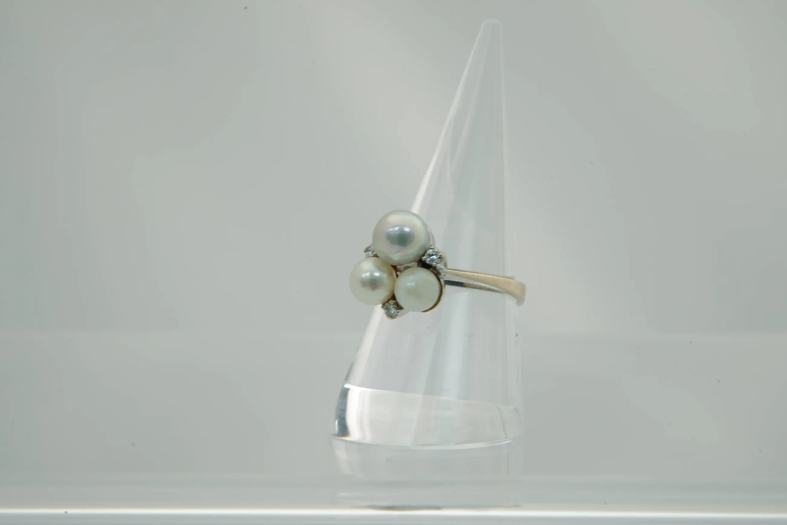 • U biedt op een fraaie 14 karaats witgoud en diamanten entourage ring met in totaal 3 separaat gezette briljant geslepen diamantjes en 3 parels. De ring verkeert in zeer goede conditie.
