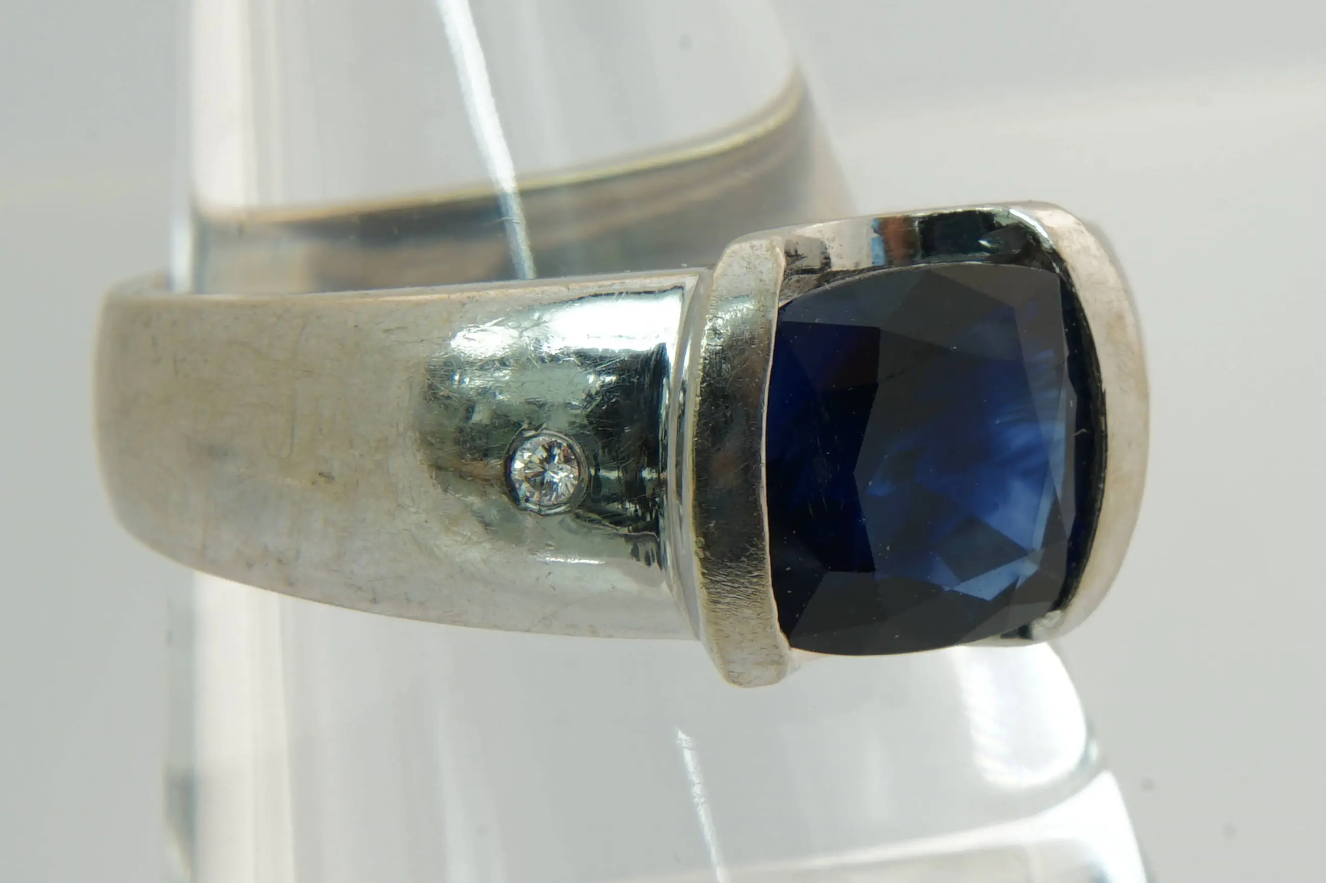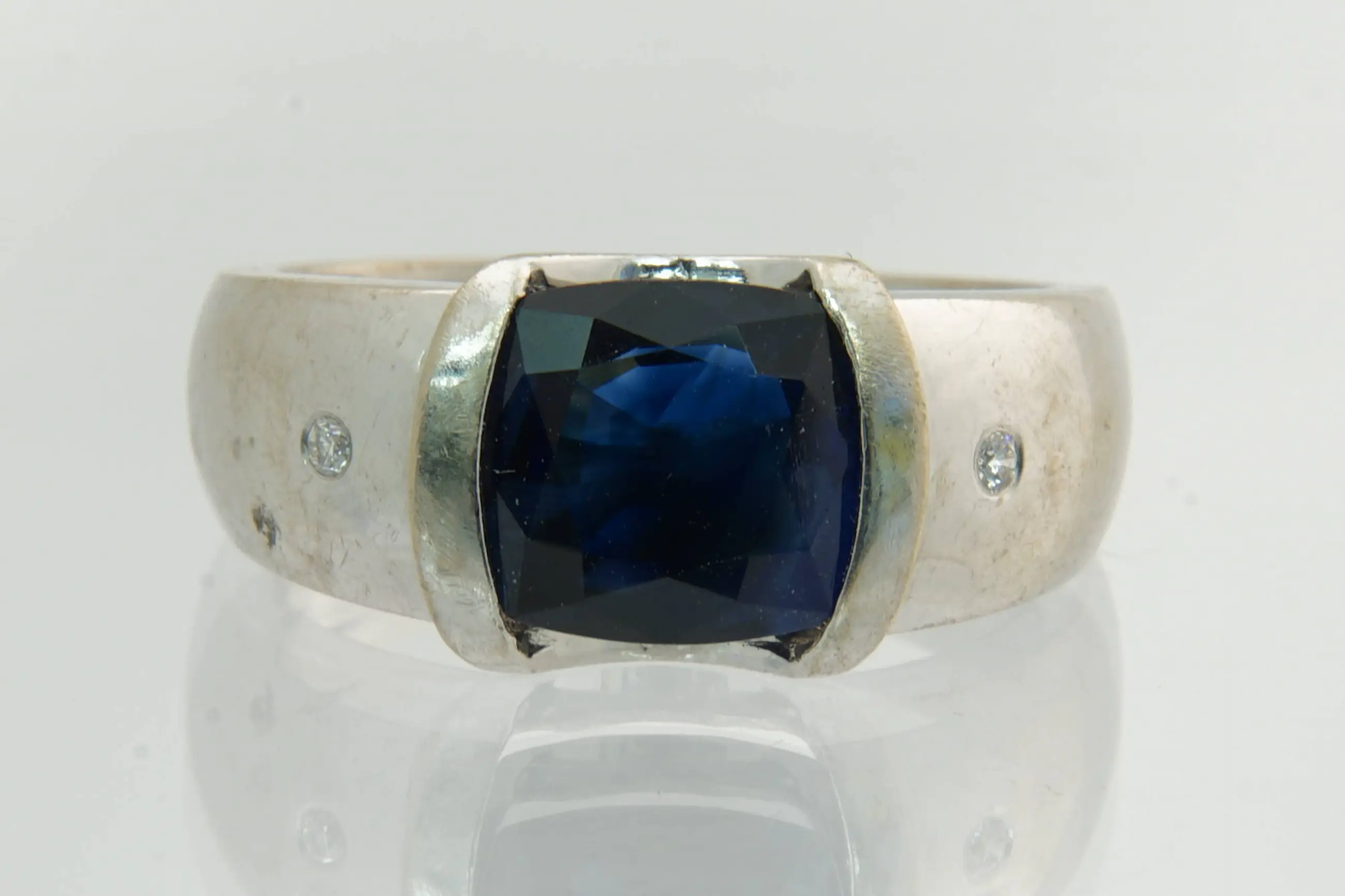 • U biedt op een 14 karaat wit gouden ring met ca 0.04 crt briljant geslepen diamant. Midden steen is een cushion geslepen blauwe saffier van ca 3.80 crt.
