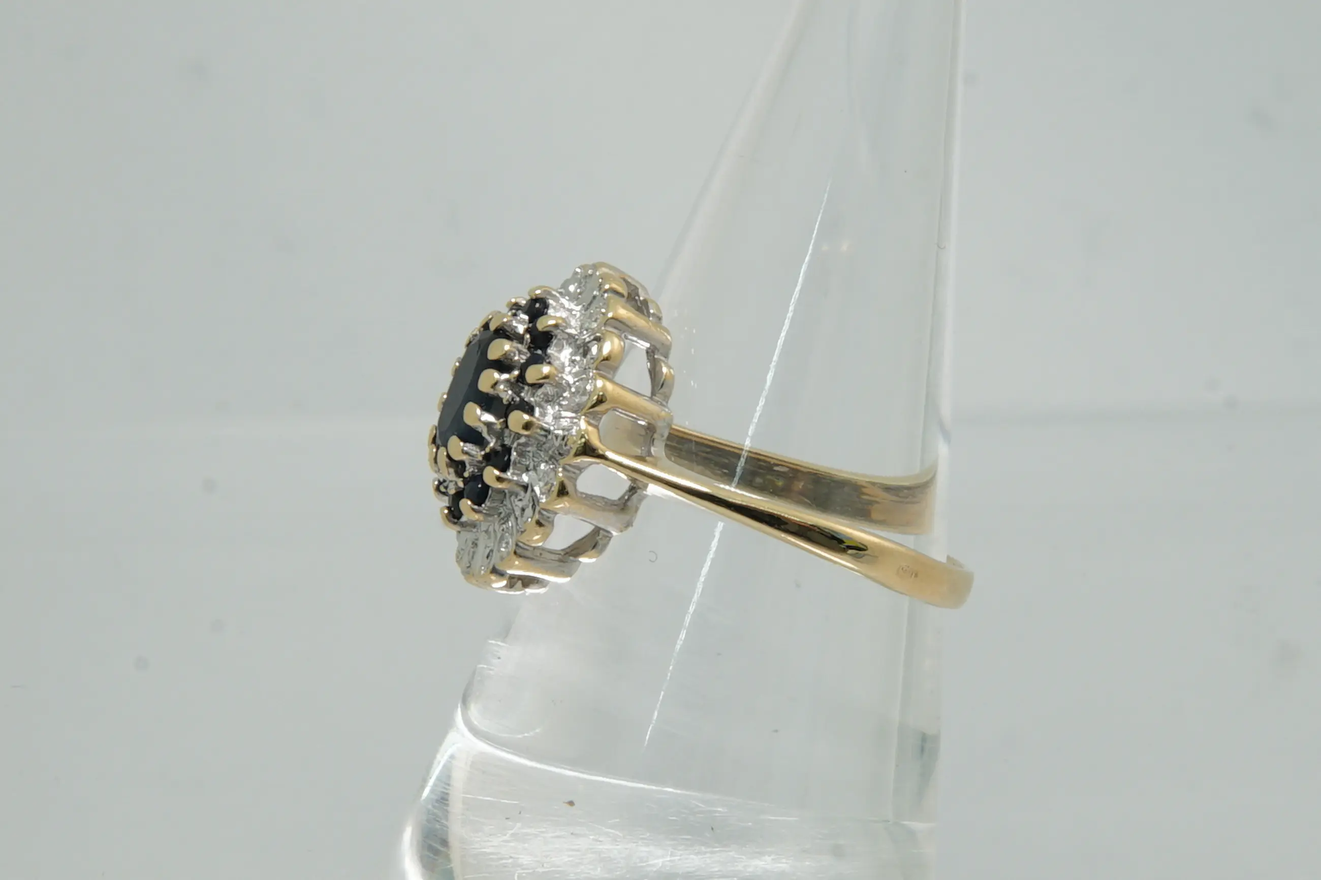 72 -  Klassiek model 14krt gouden entourage ring met diamant en saffier kopen? Bied vanaf 230!