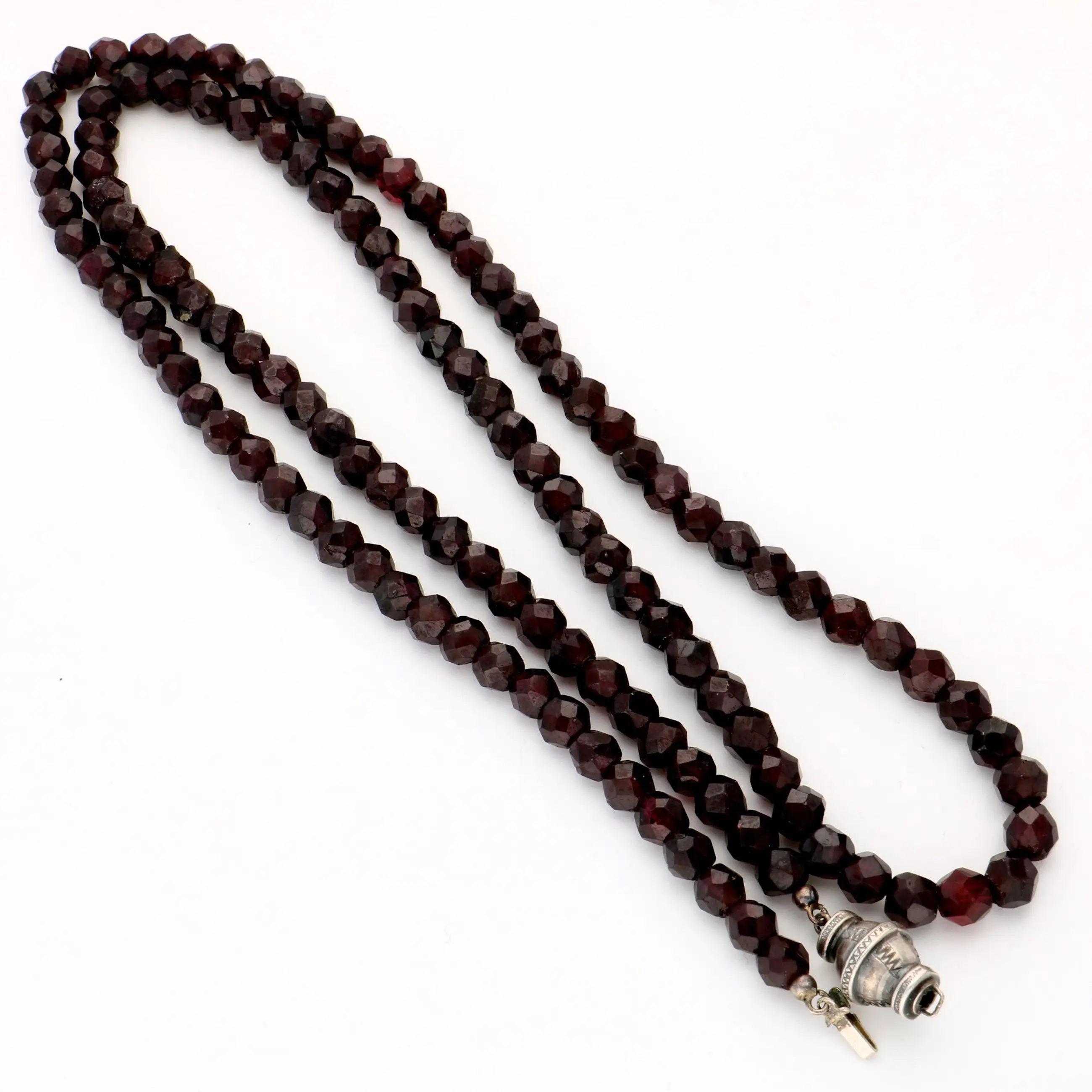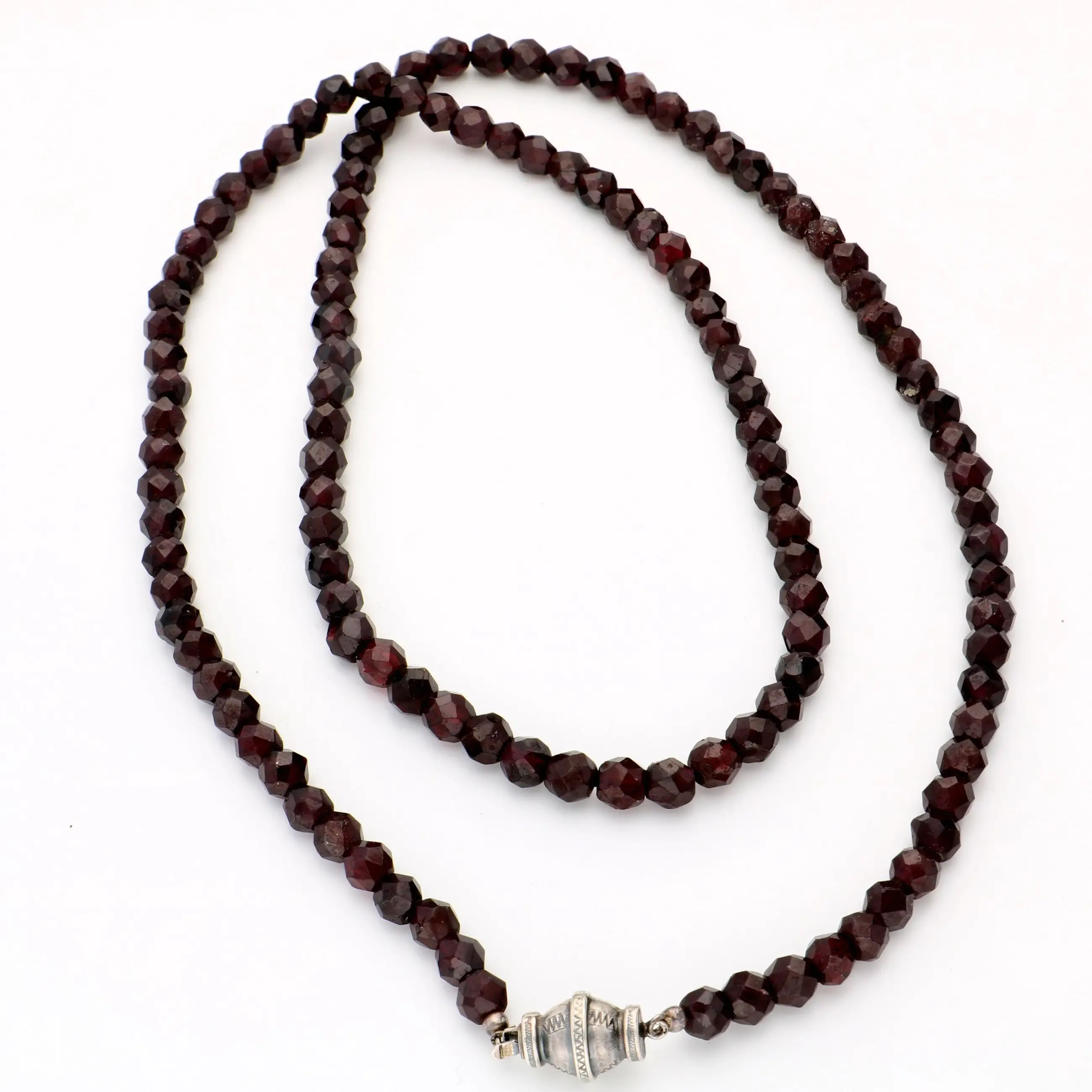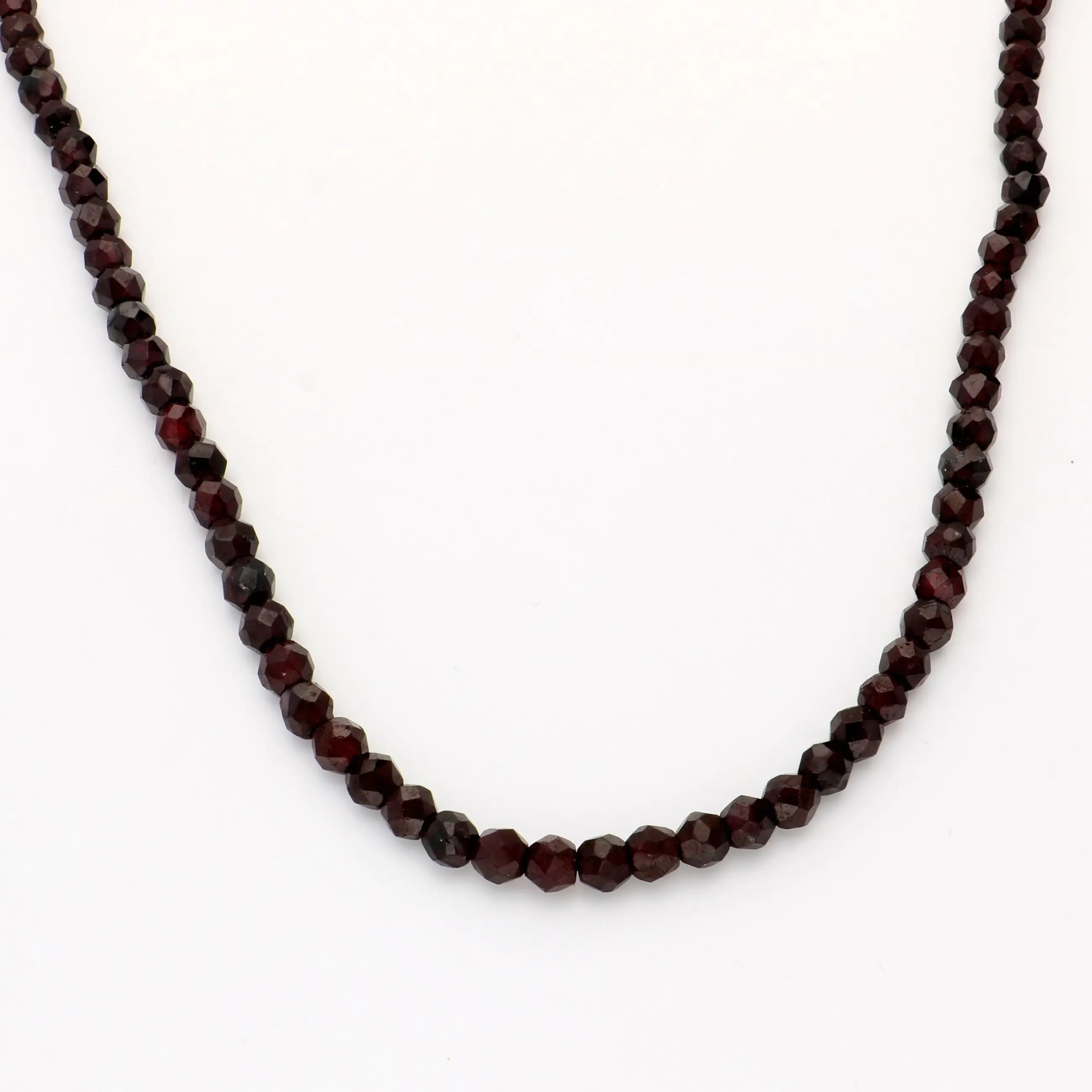 835/1000 zilveren collier bezet met granaten, de granaten zijn geregen op rode rijggaren. Het collier is voorzien van een zilveren bolsluiting. Diameter granaten ca. 6 mm. Kwaliteit: Dit sieraad is door onze expert getoetst op zilvergehalte en echt bevonden. Voor eigen indruk, zie foto’s.