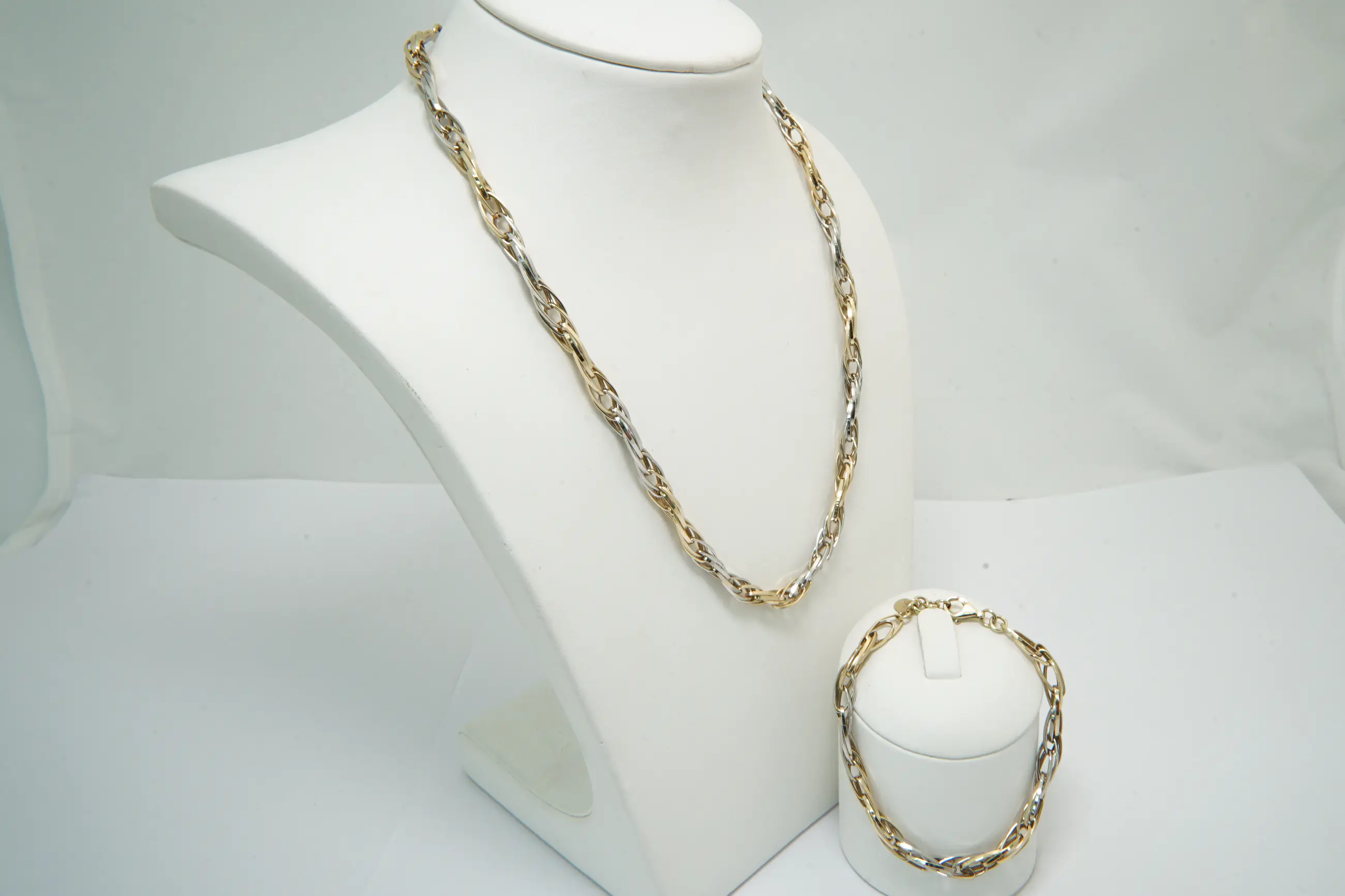 • U biedt op een fraaie 14 karaats bicolor gouden SET (collier & armband) met langwerpige fantasieschakel.  Beide sieraden verkeren in zeer goede conditie.