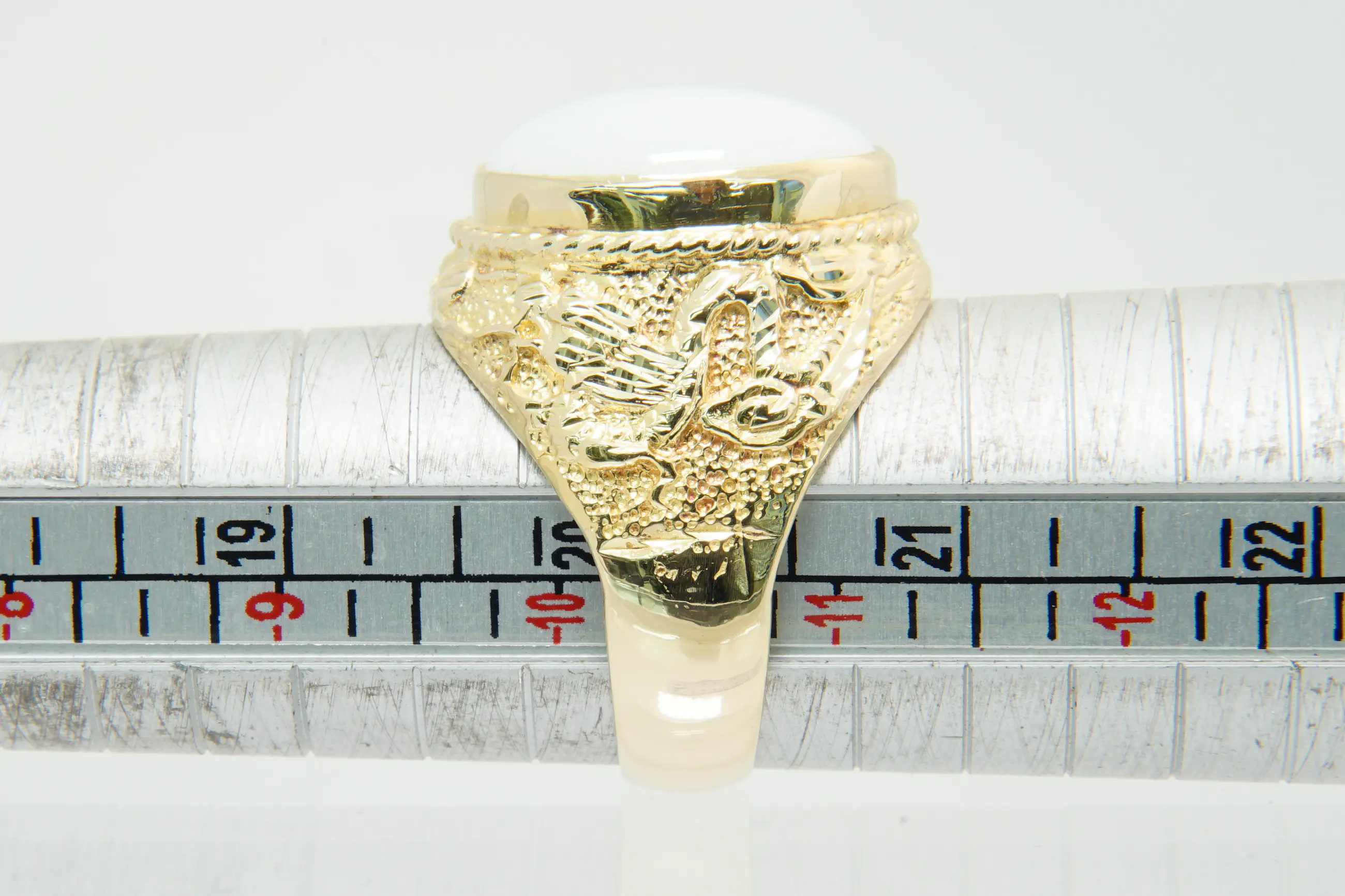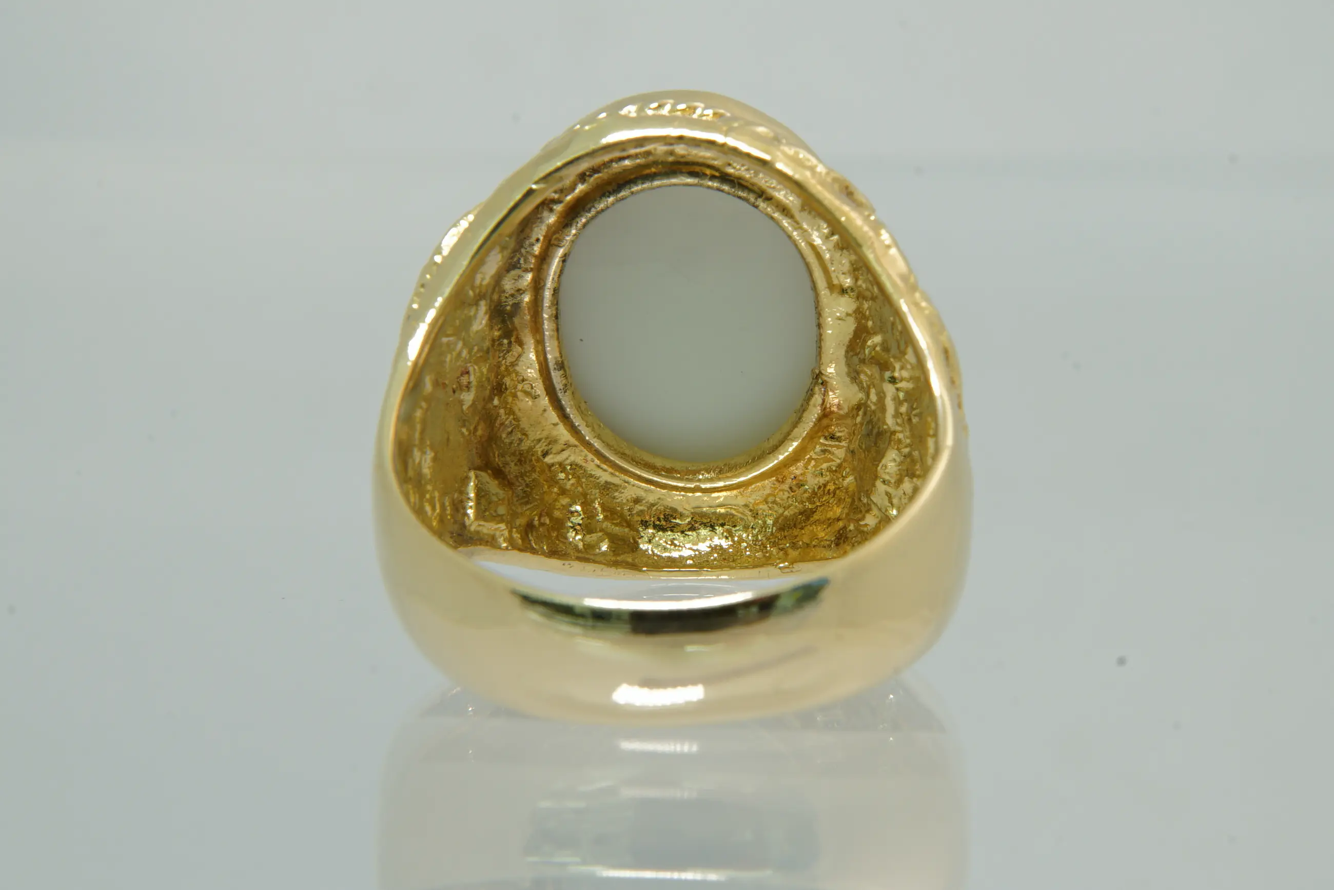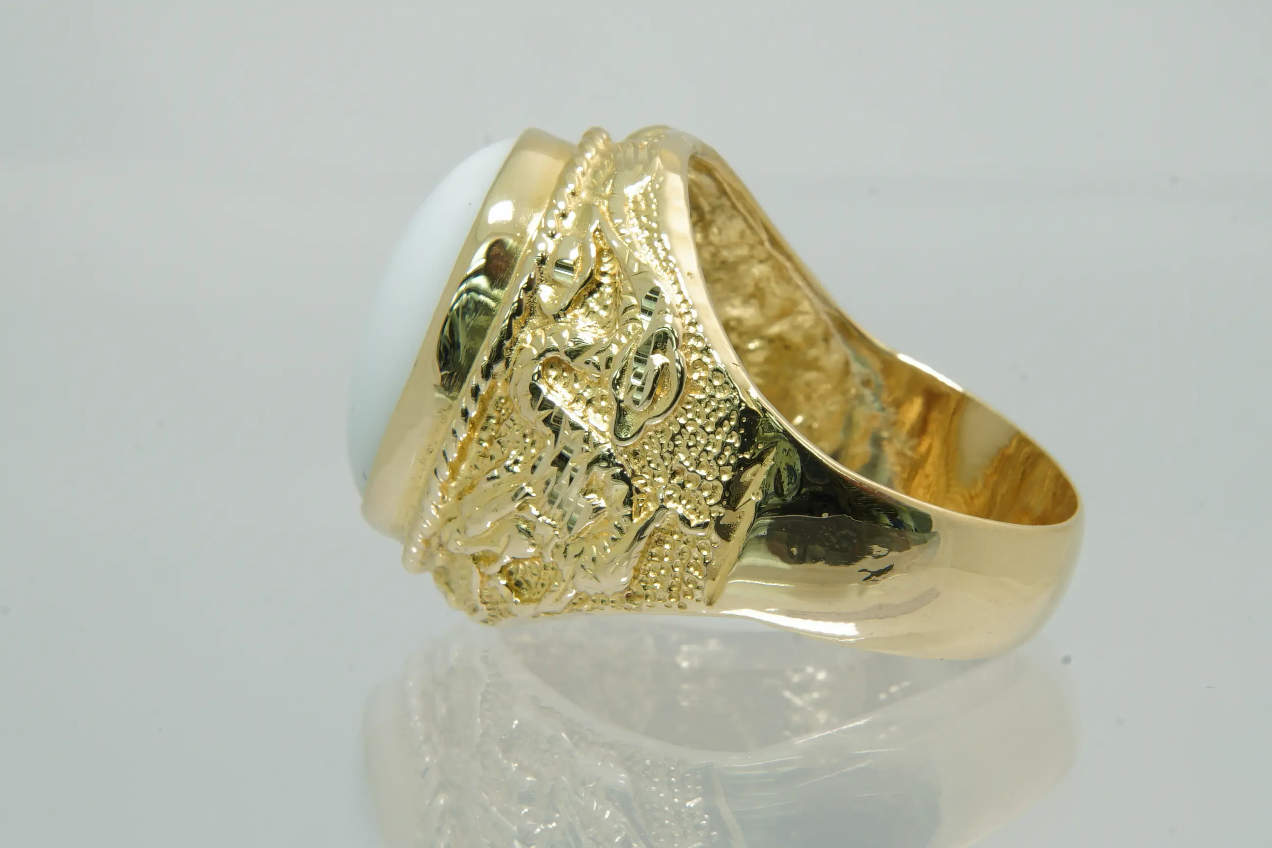 • U biedt op een relatief grote, mooi bewerkte, Surinaamse, 18 karaats geel gouden ring. De ring verkeert in een zeer goede conditie en bevat een ovalen, cabuchon geslepen witte steen.