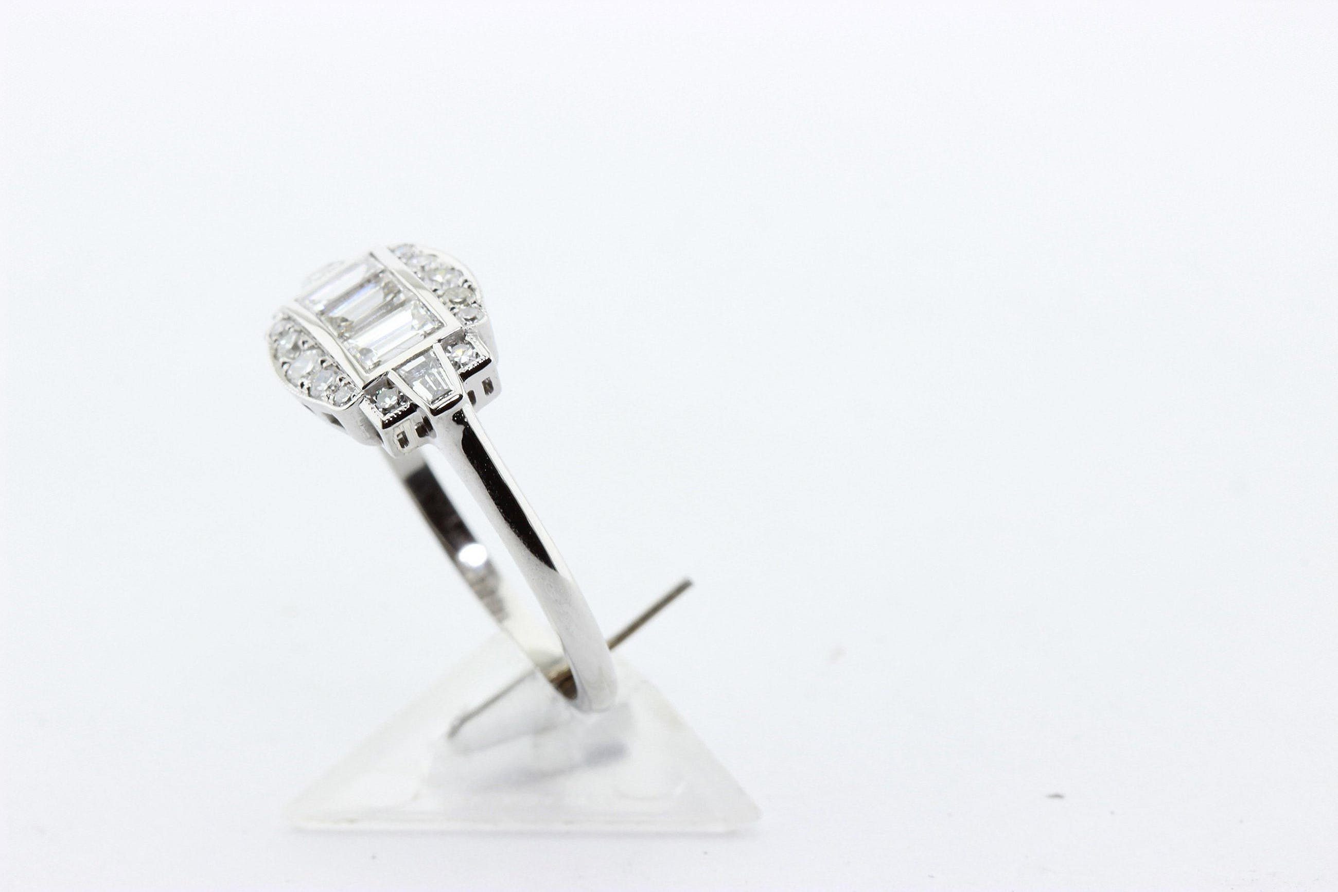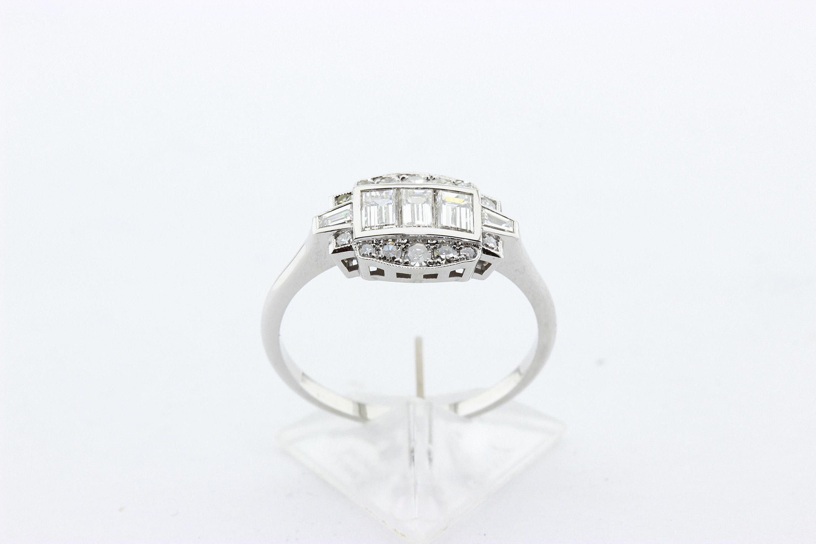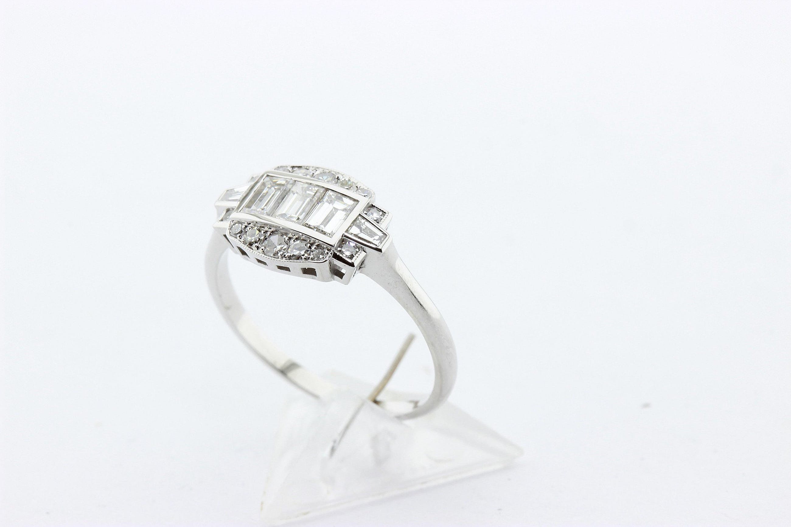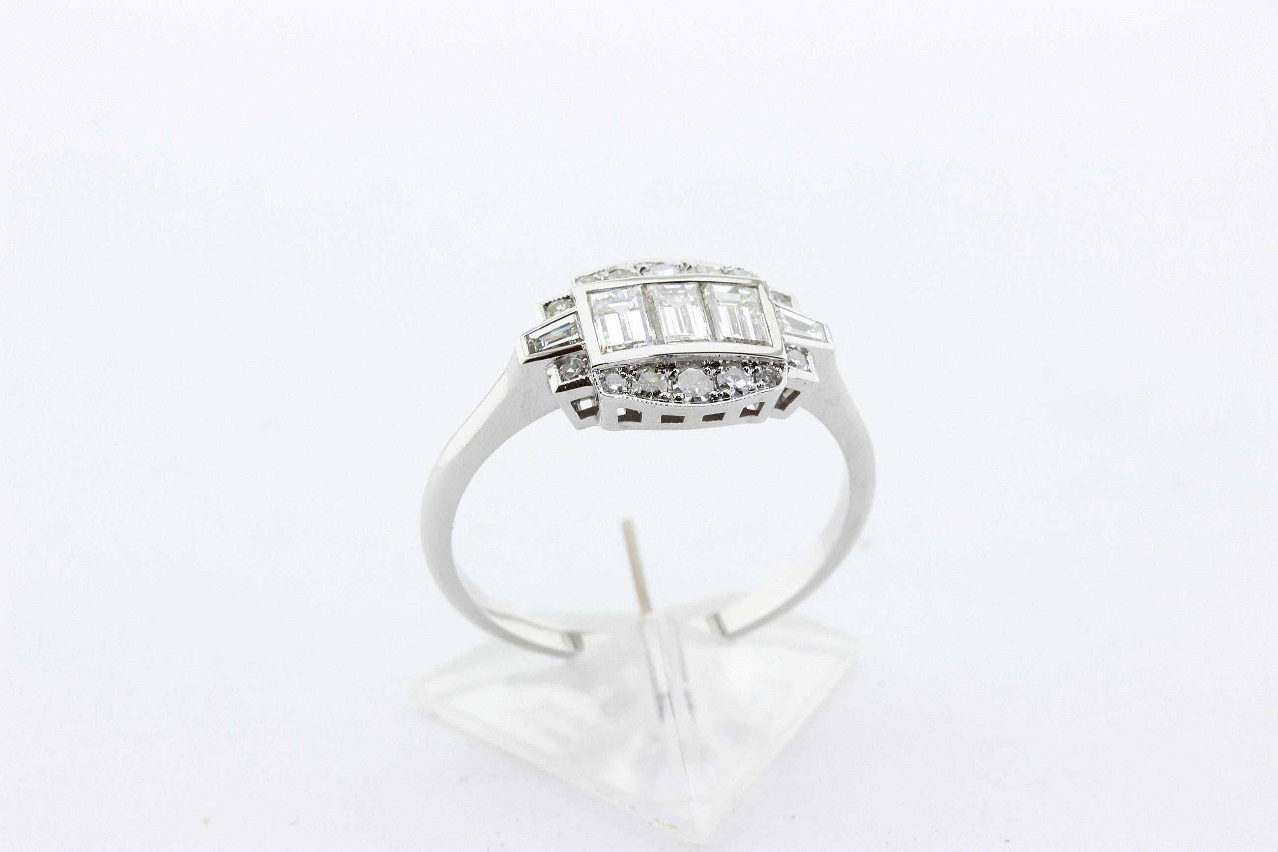 14 karaats witgouden Art-deco stijl plaatring gezet met 3 baquette geslepen diamanten met een gewicht van 0,65 crt. Kleur E/F en kwaliteit VVS en 10 als 8/8 geslepen diamanten met een gewicht van 0,14 crt. Kleur G en kwaliteit VS. en 2 als tapered baquette geslepen diamanten. Ringmaat 18