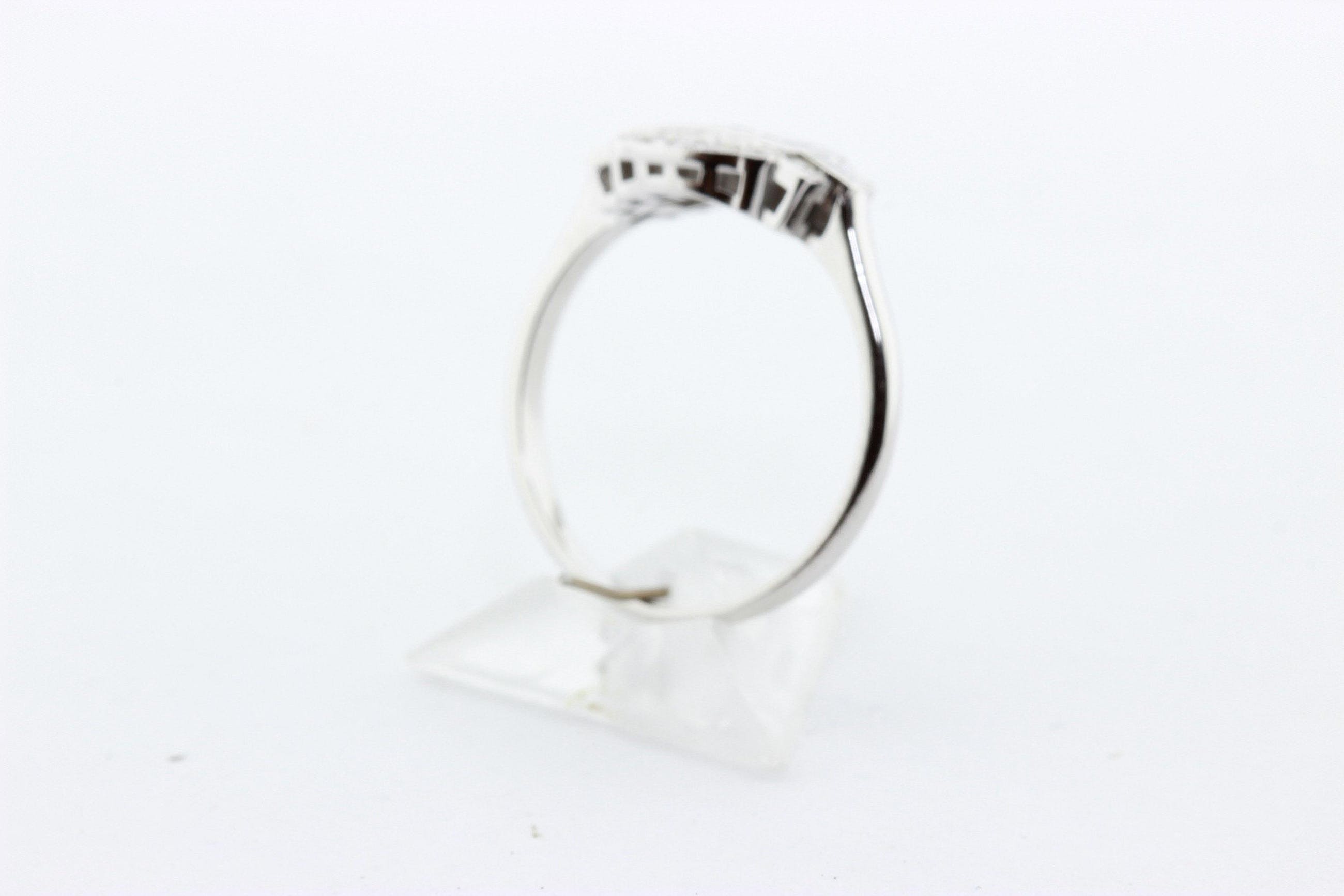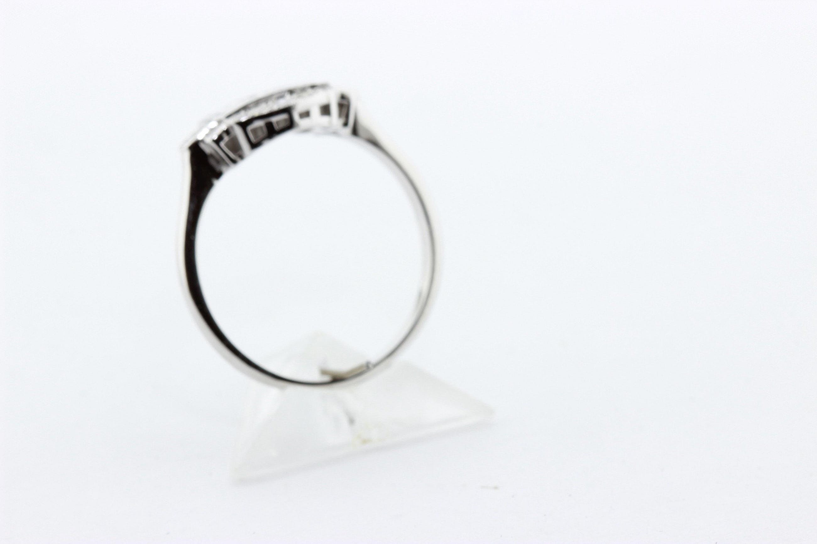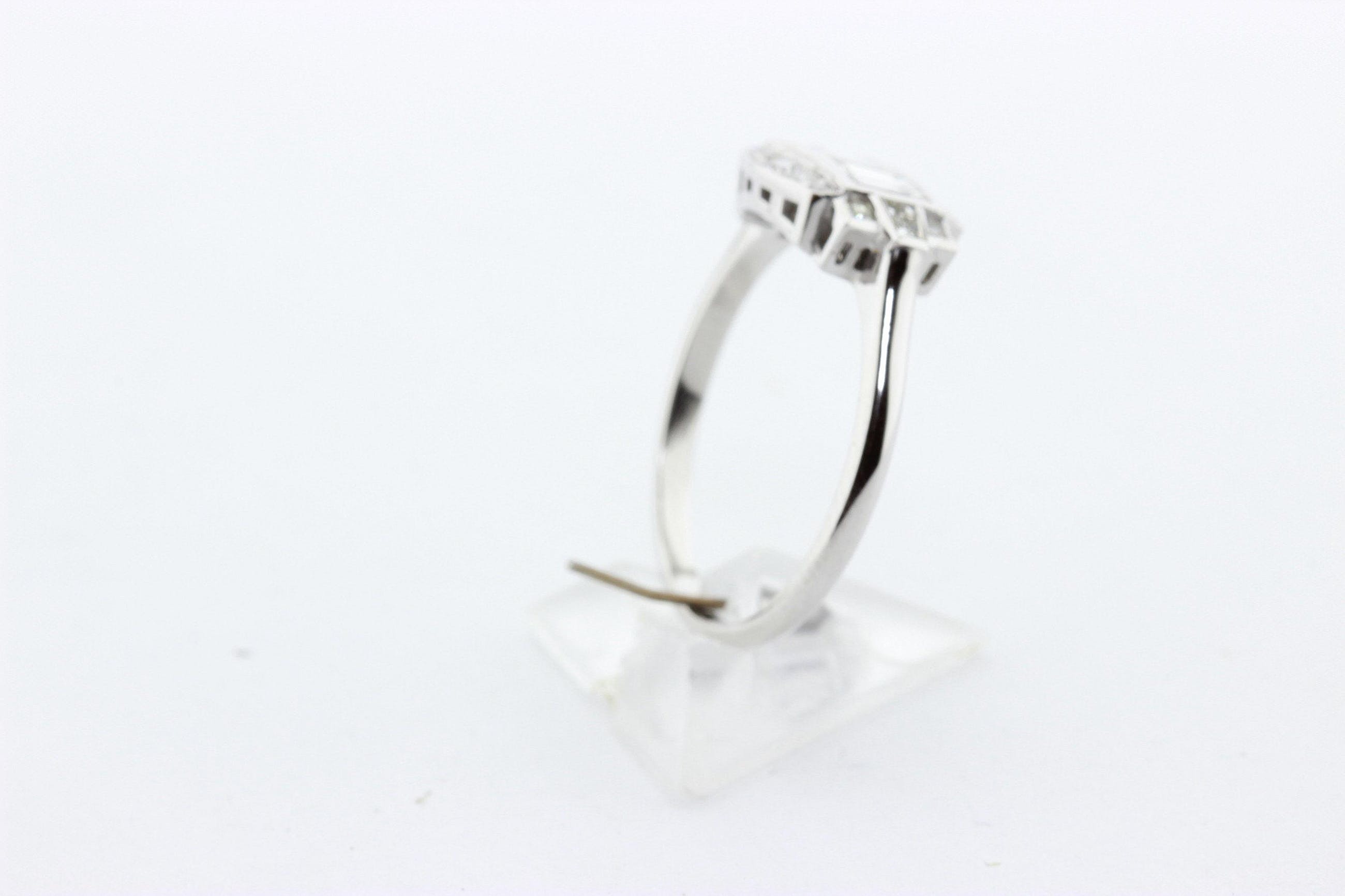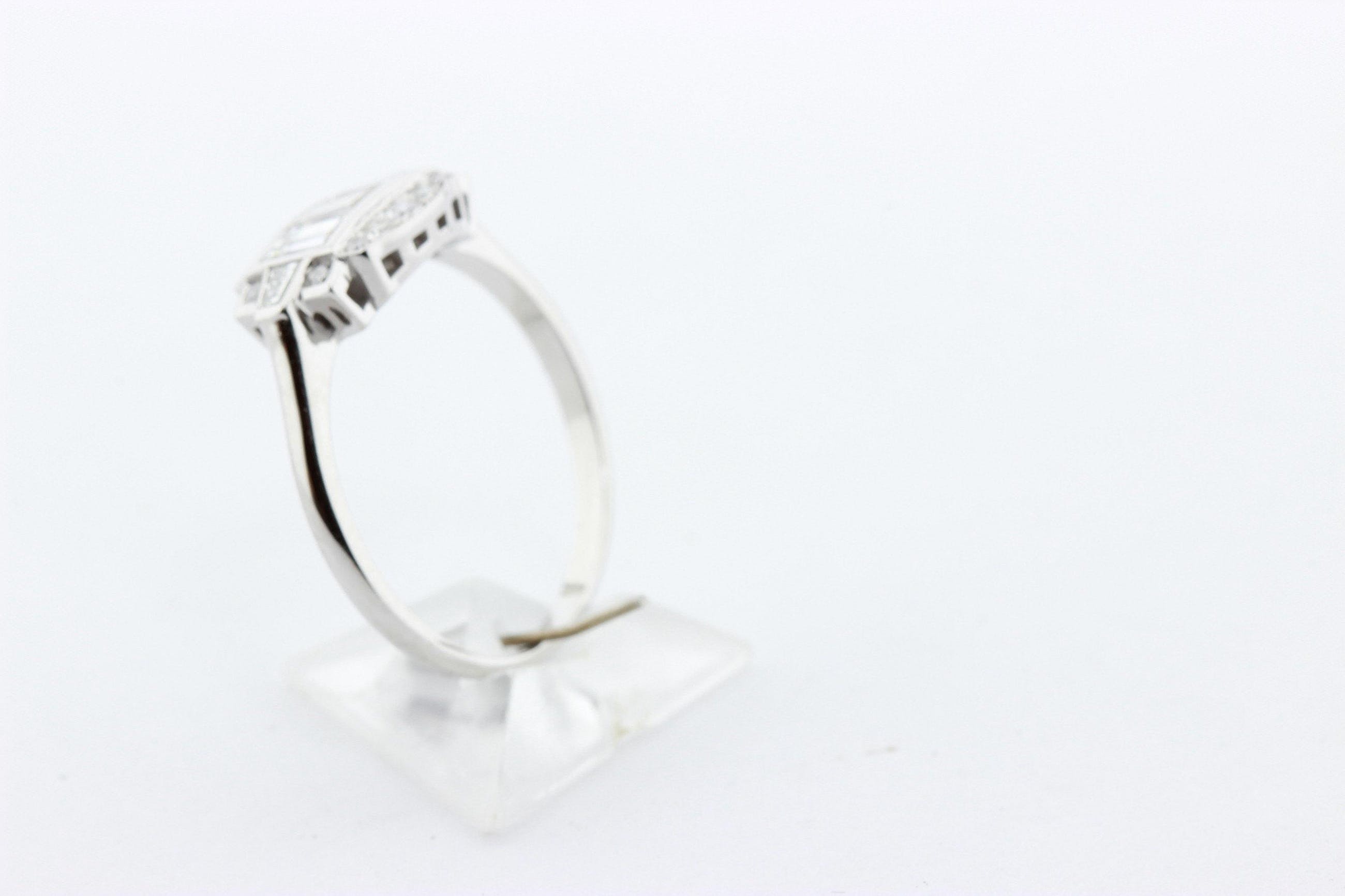 14 karaats witgouden Art-deco stijl plaatring gezet met 3 baquette geslepen diamanten met een gewicht van 0,65 crt. Kleur E/F en kwaliteit VVS en 10 als 8/8 geslepen diamanten met een gewicht van 0,14 crt. Kleur G en kwaliteit VS. en 2 als tapered baquette geslepen diamanten. Ringmaat 18
