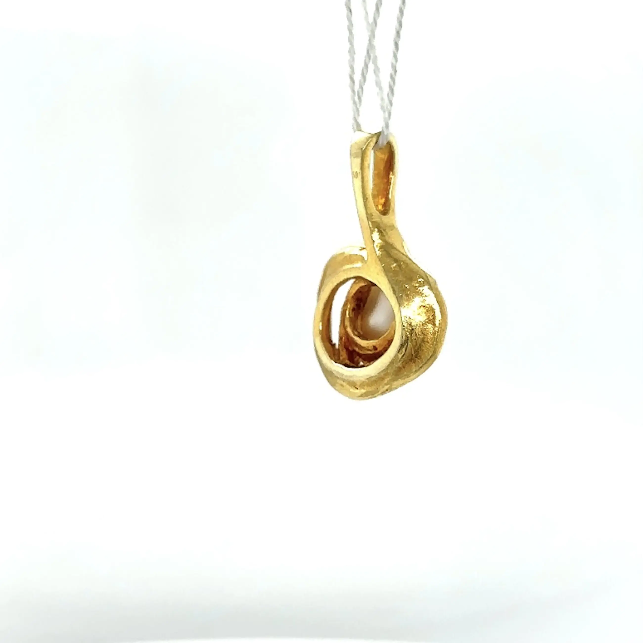Dieser Anhänger wurde sehr detailverliebt designt, so wurde die Perle sehr harmonisch in den Anhänger eingearbeitet. Um diese Perle wurden nun schöne Goldstrukturen gefertigt, welche die Perle sehr ansprechend ummanteln. Die Kanten sind dabei auf Hochglanz poliert, während die Innenräume elegant mattiert wurden.