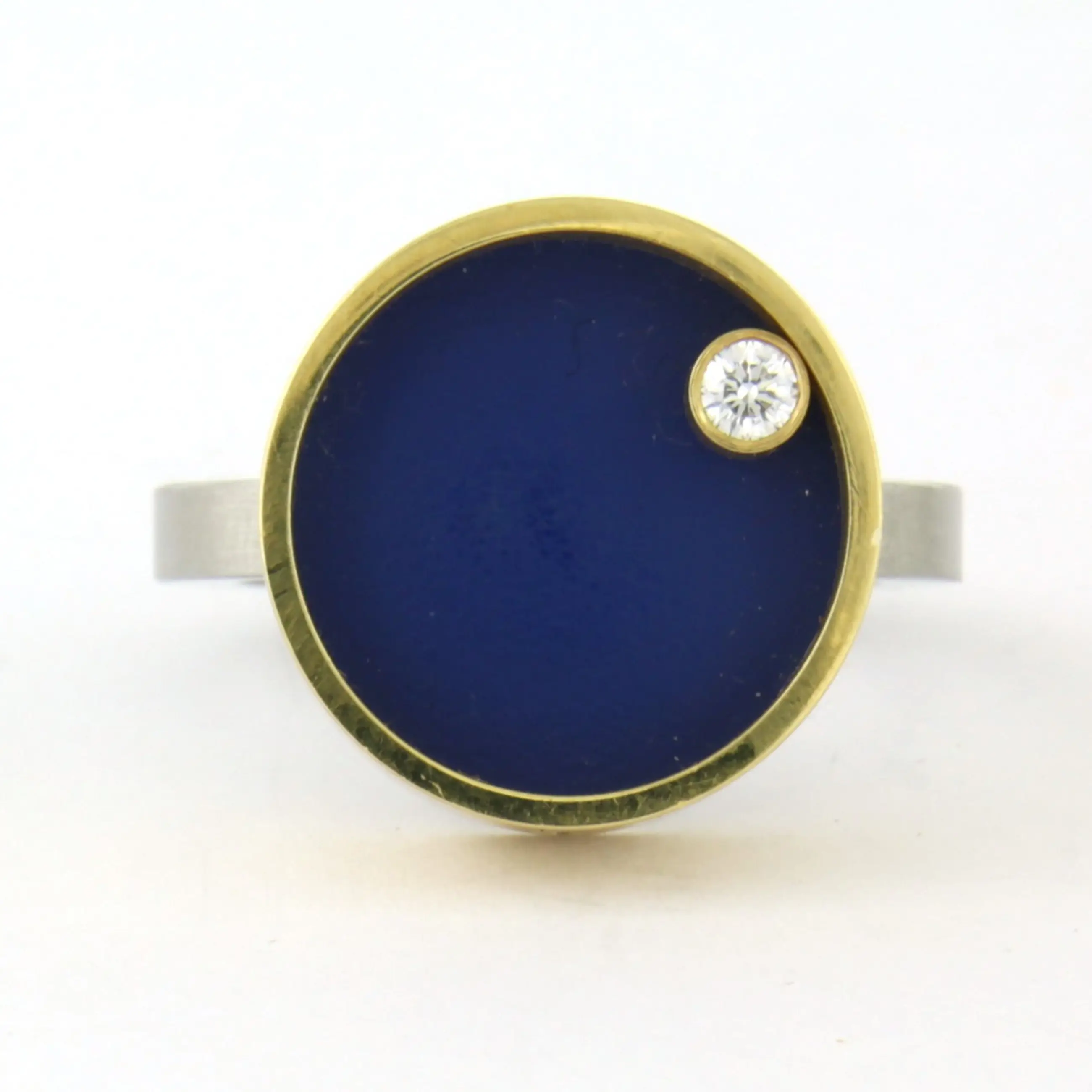 CARL DAU – stalen ring met een 18k geel gouden bovenzijde bezet met briljant geslepen tot. 0.10ct versiert met blauwe emaille – F/G - VS/SI - ringmaat 19.25(60)