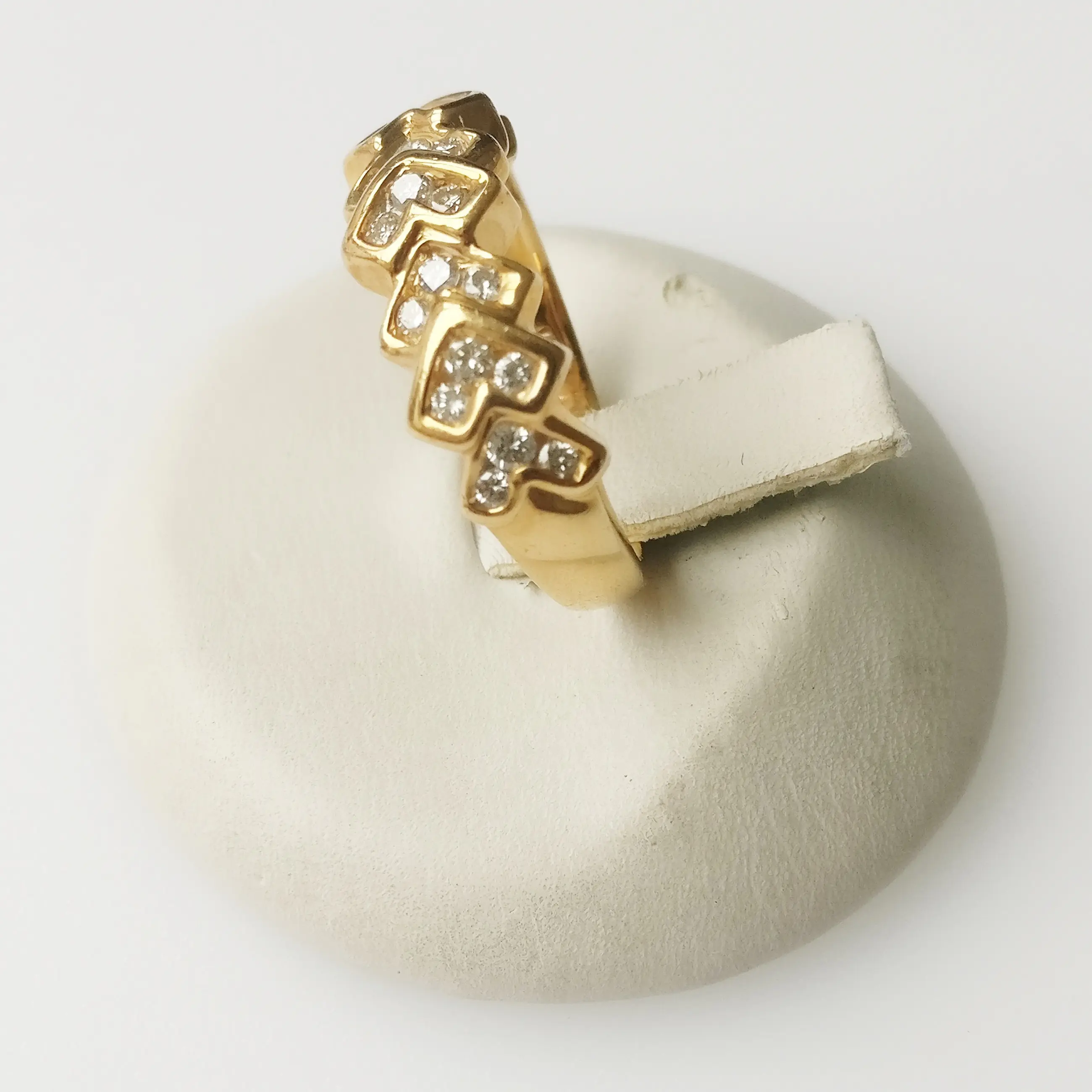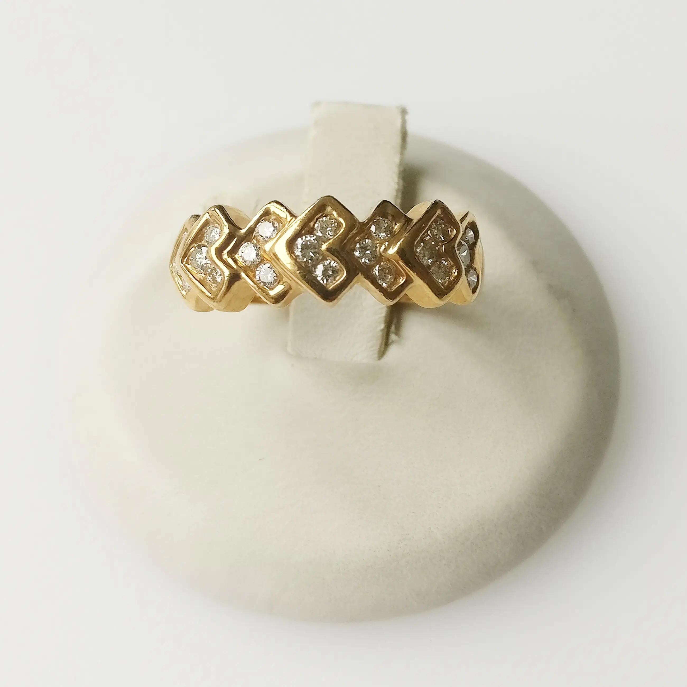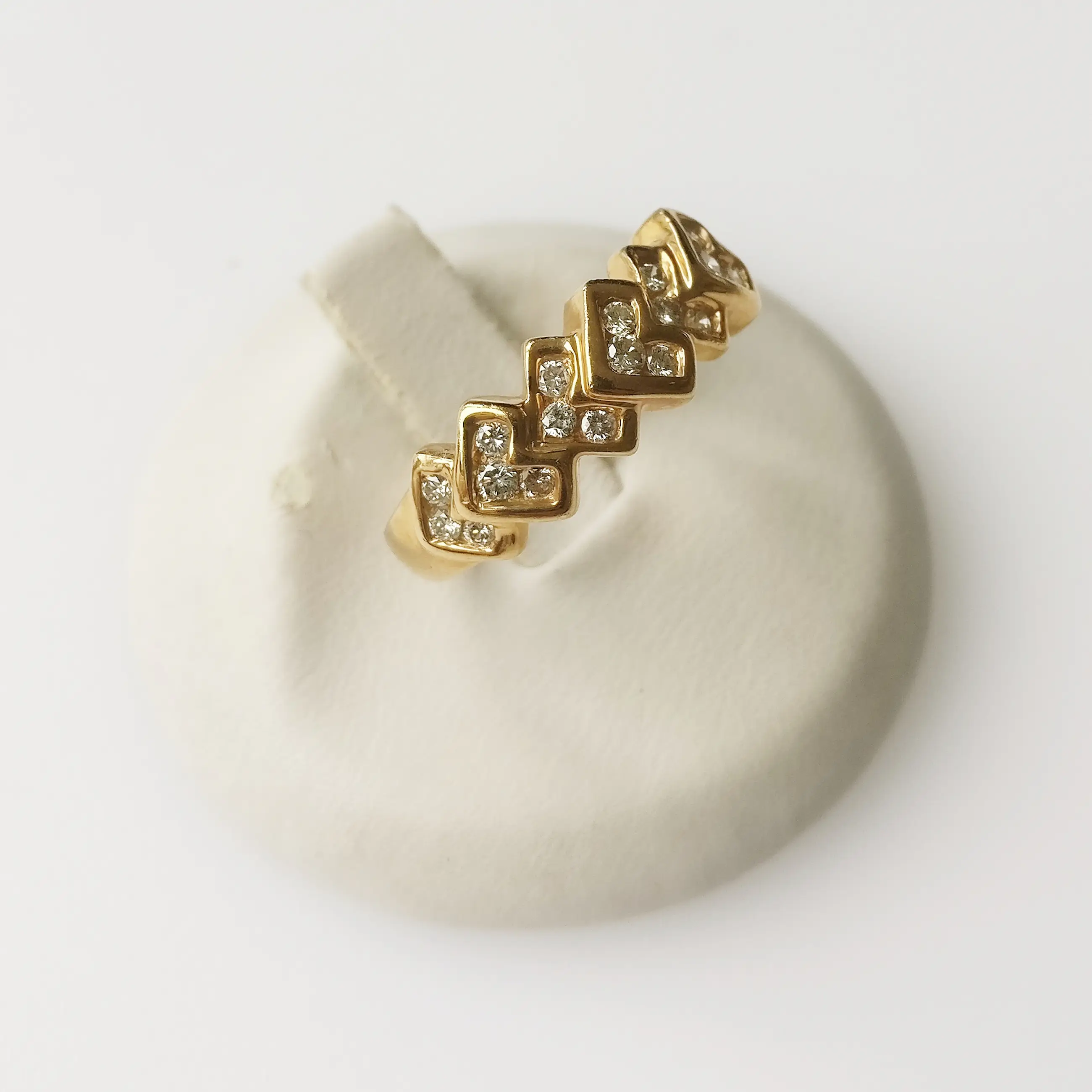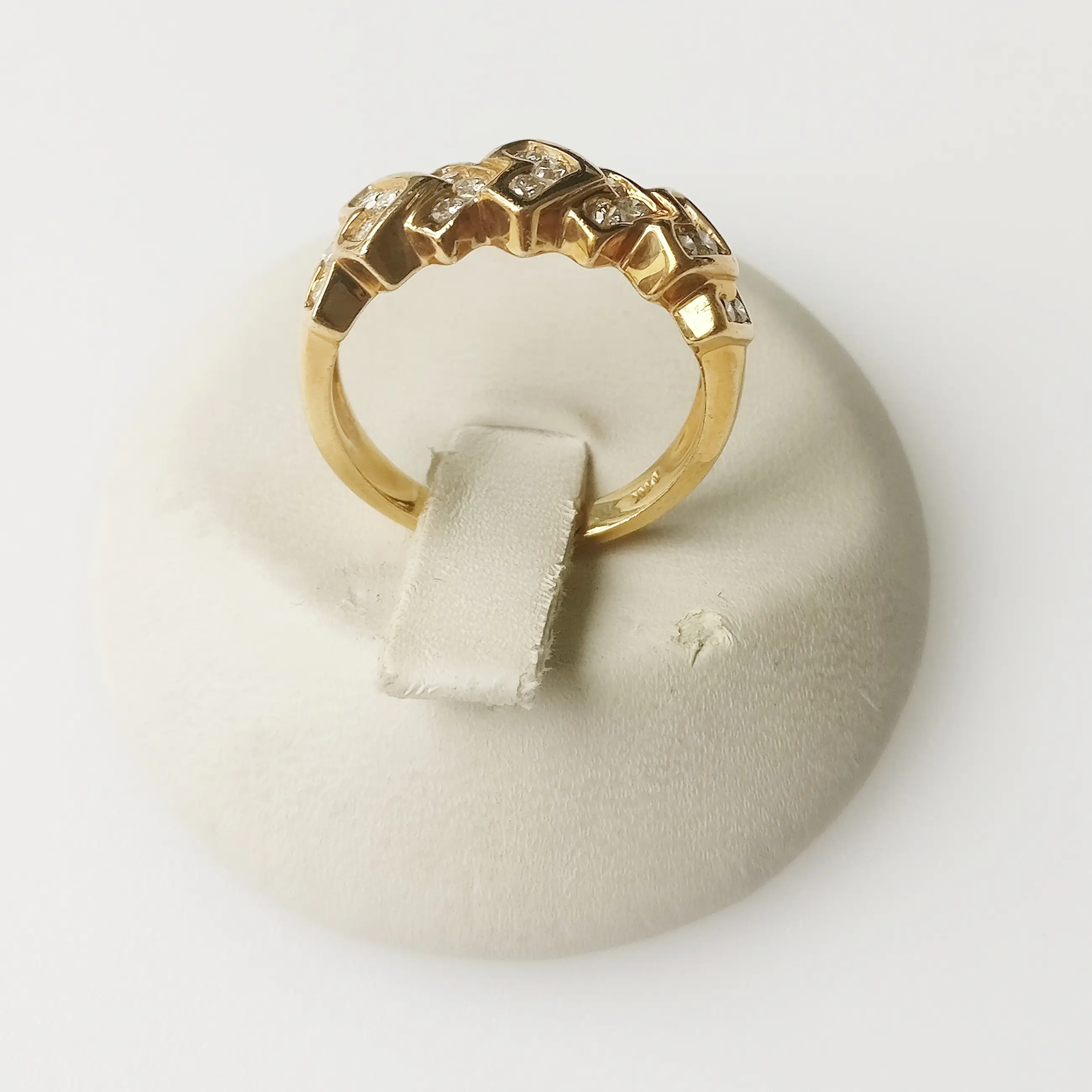 Diamanten ring in 14 karaat geelgoud Brutogewicht: 4,83 gram Bezette met 21 natuurlijke diamanten met een totaal gewicht van 0,70 ct, EF VVS-kwaliteit.