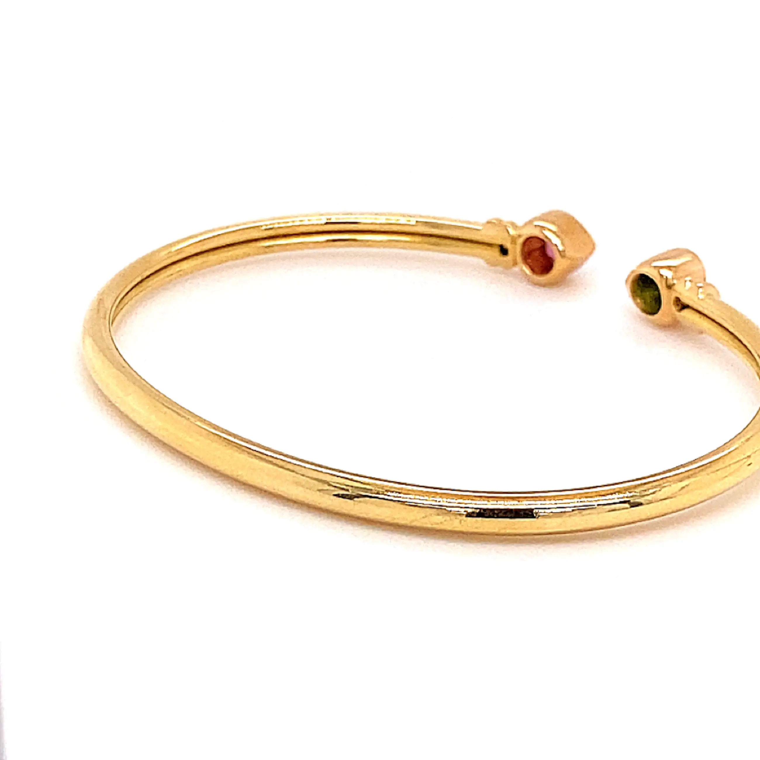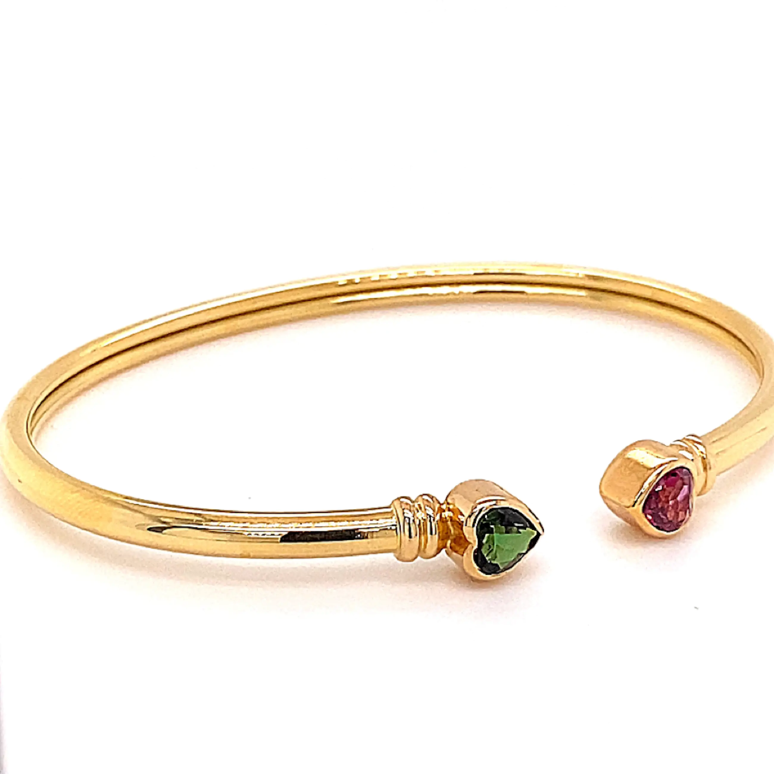 Der Armreif wird durch zwei atemberaubende Edelsteine veredelt. Ein Herz aus Granat mit einem Gewicht von 0,46 carat strahlt in einem intensiven und leuchtenden rosa-rot-Ton. Das Turmalinherz mit 0,44 carat beeindruckt mit seiner lebendigen grünen Farbe und perfekten Reinheit. Beide Edelsteine zeichnen sich zudem durch ihre ideale Transparenz aus, die ihnen einen faszinierenden Glanz verleiht.