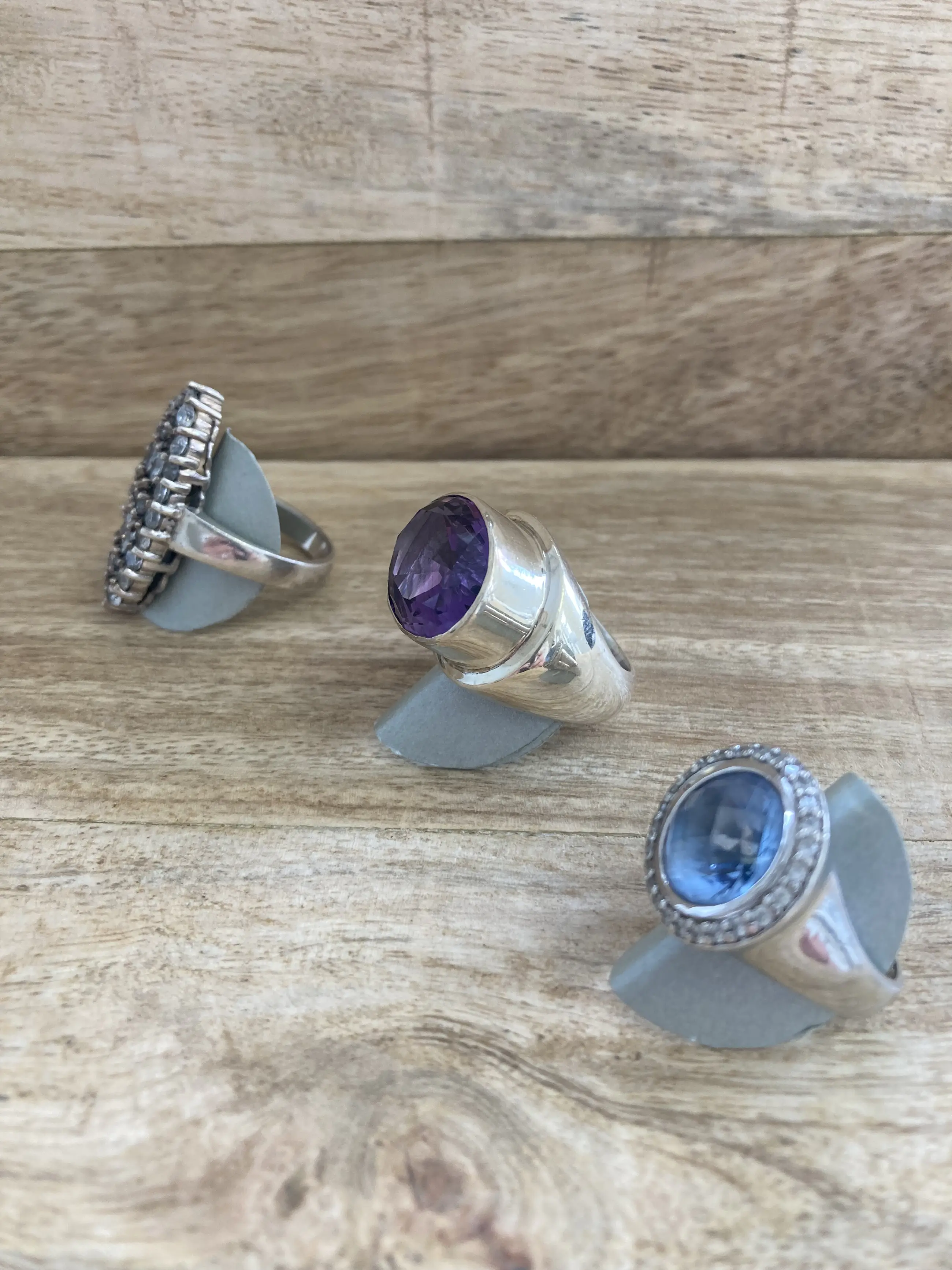Een lotje van drie zilveren ringen met kleursteen, amethist,  blauw en wit gekleurde zirkonia.