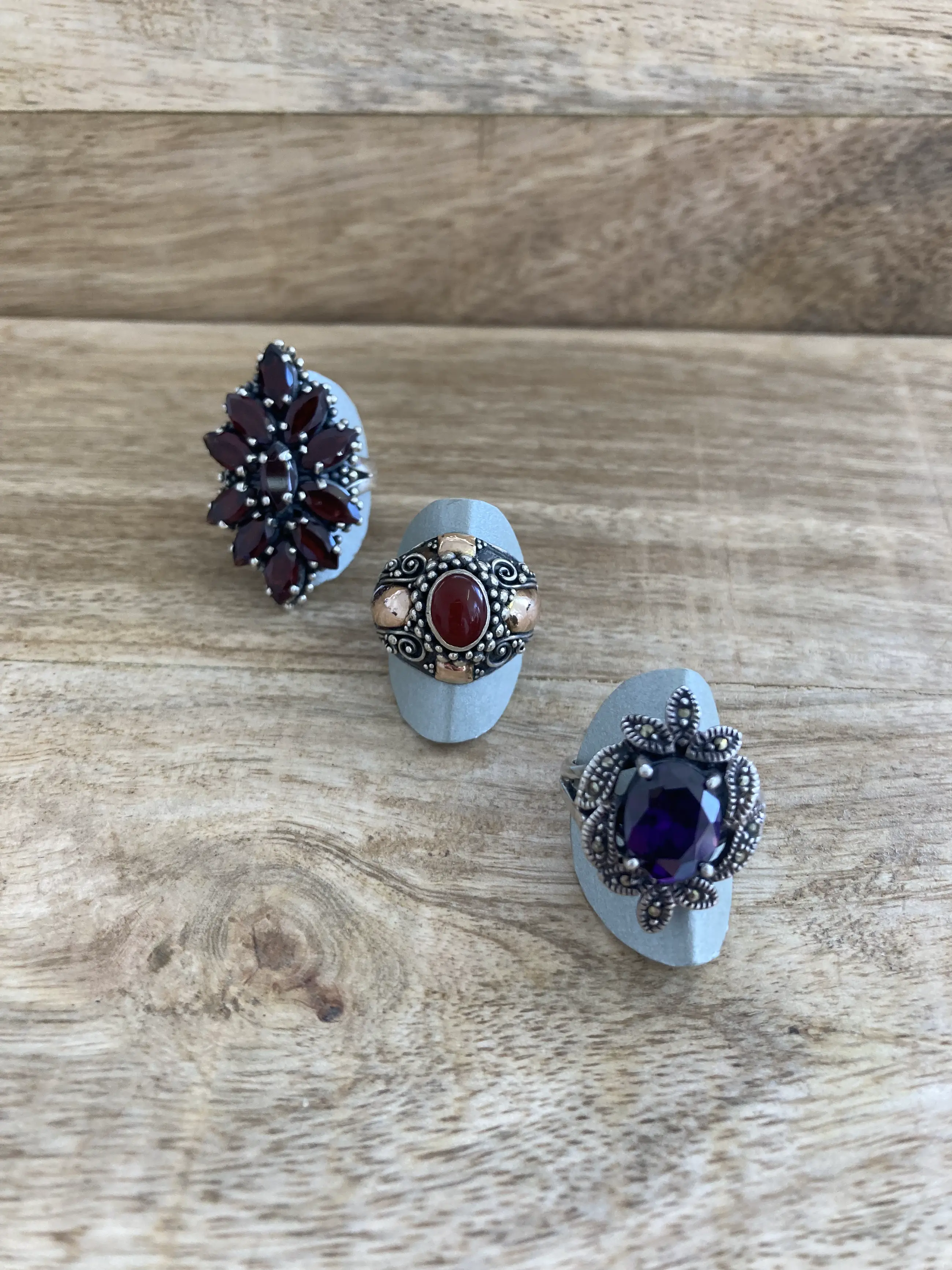 Een lotje van drie zilveren ringen met kleurstenen, carneool met goud verguld, granaten, amethist en markasietjes.