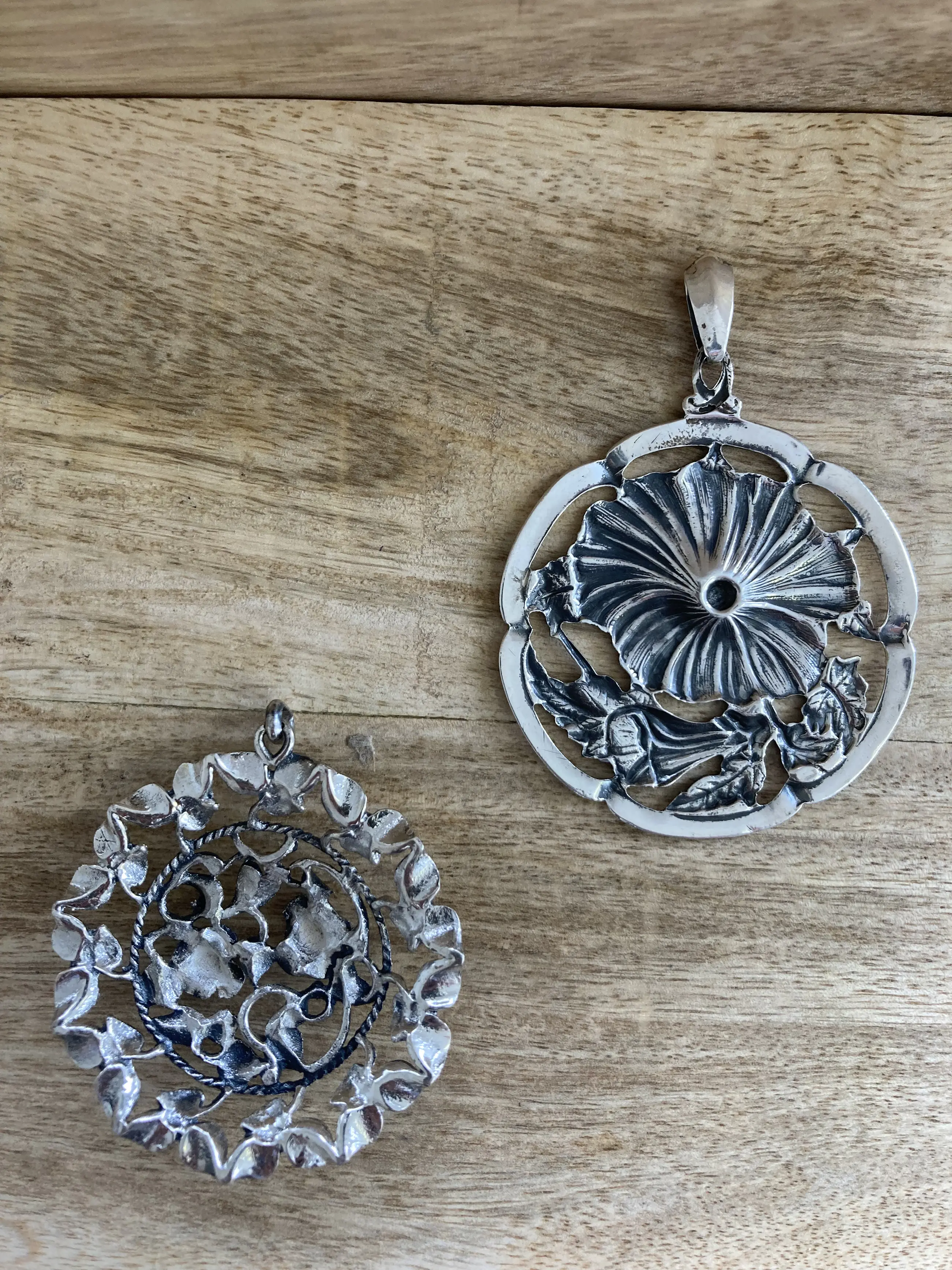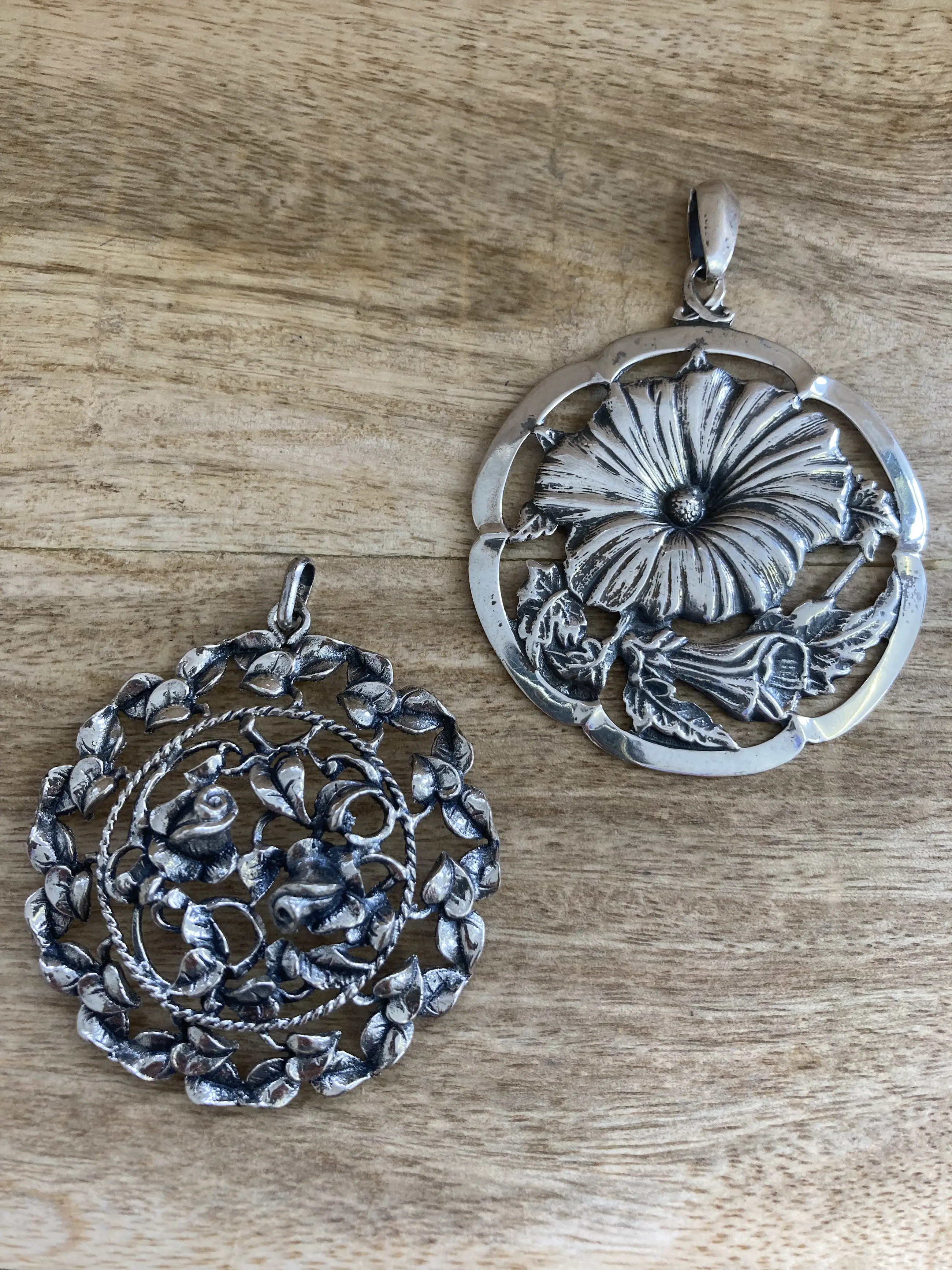 Een Lotje van twee zilveren hangers met bloemmotief.