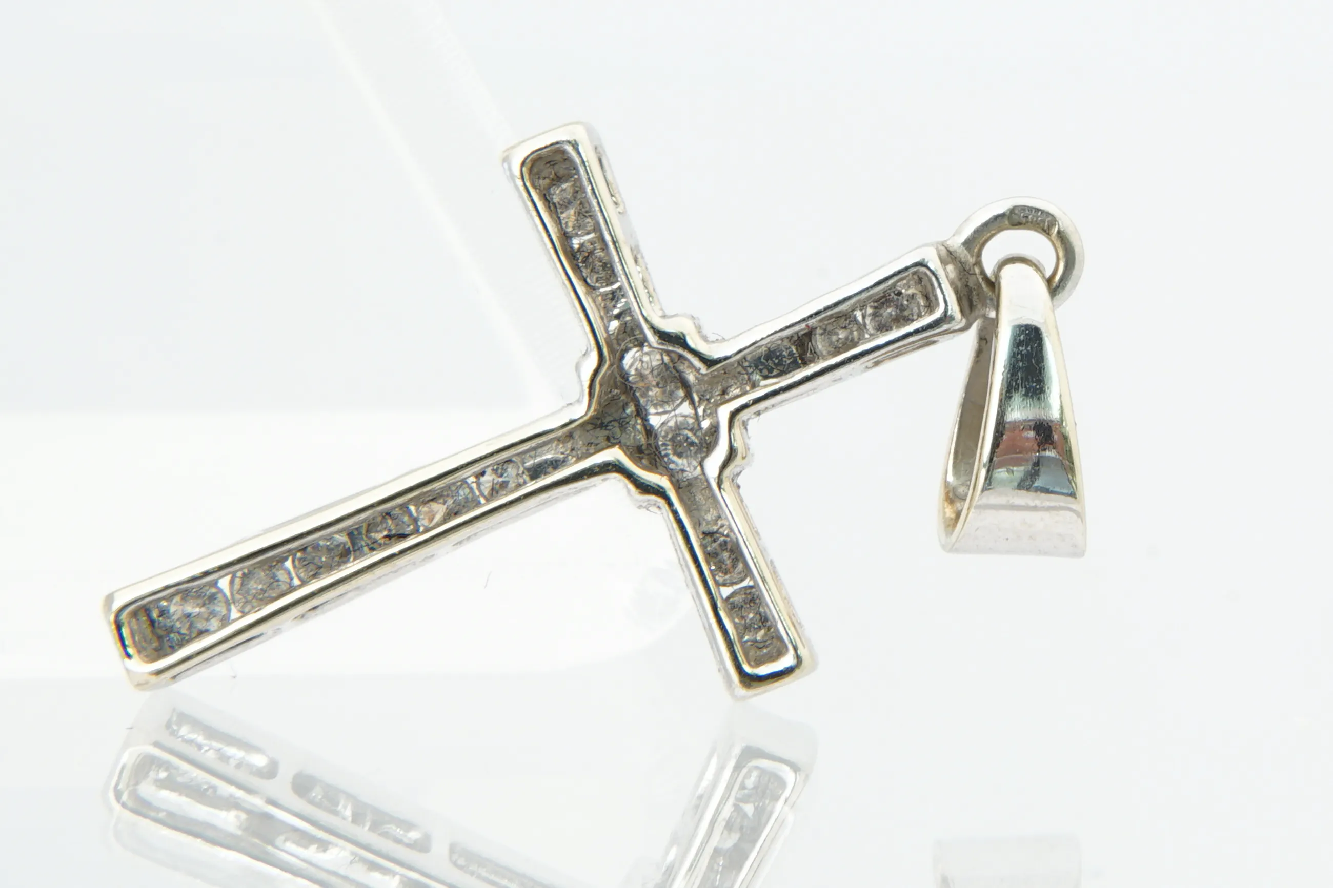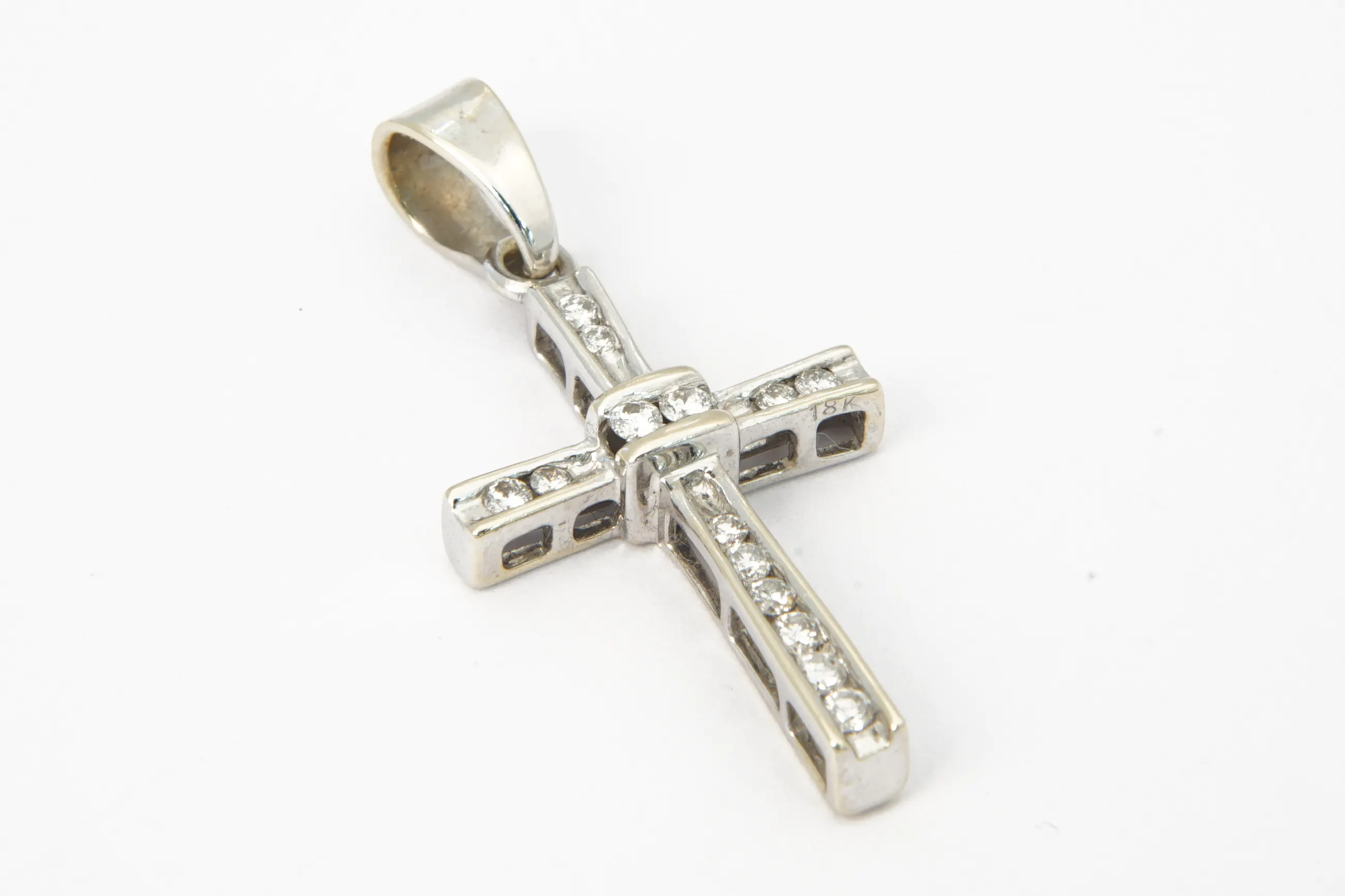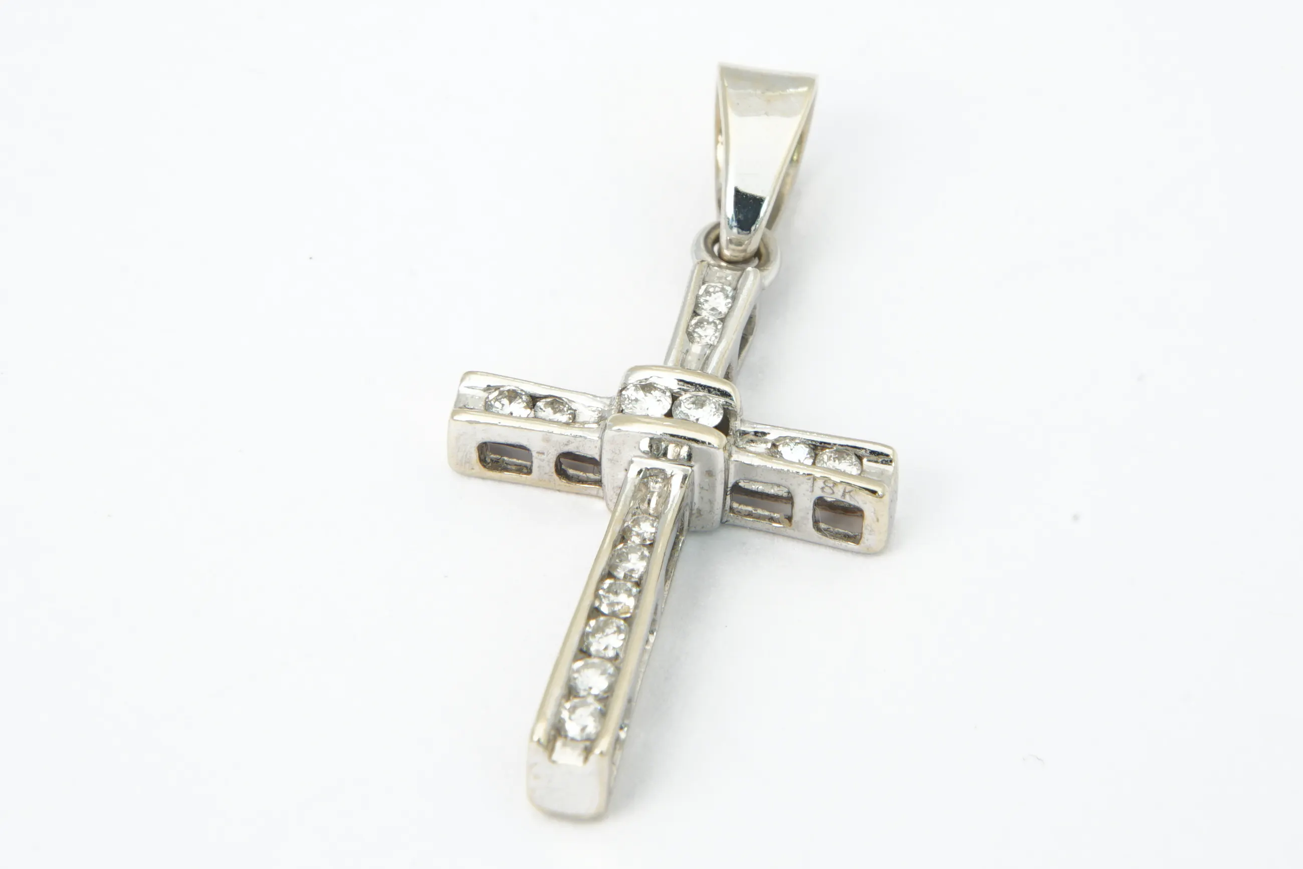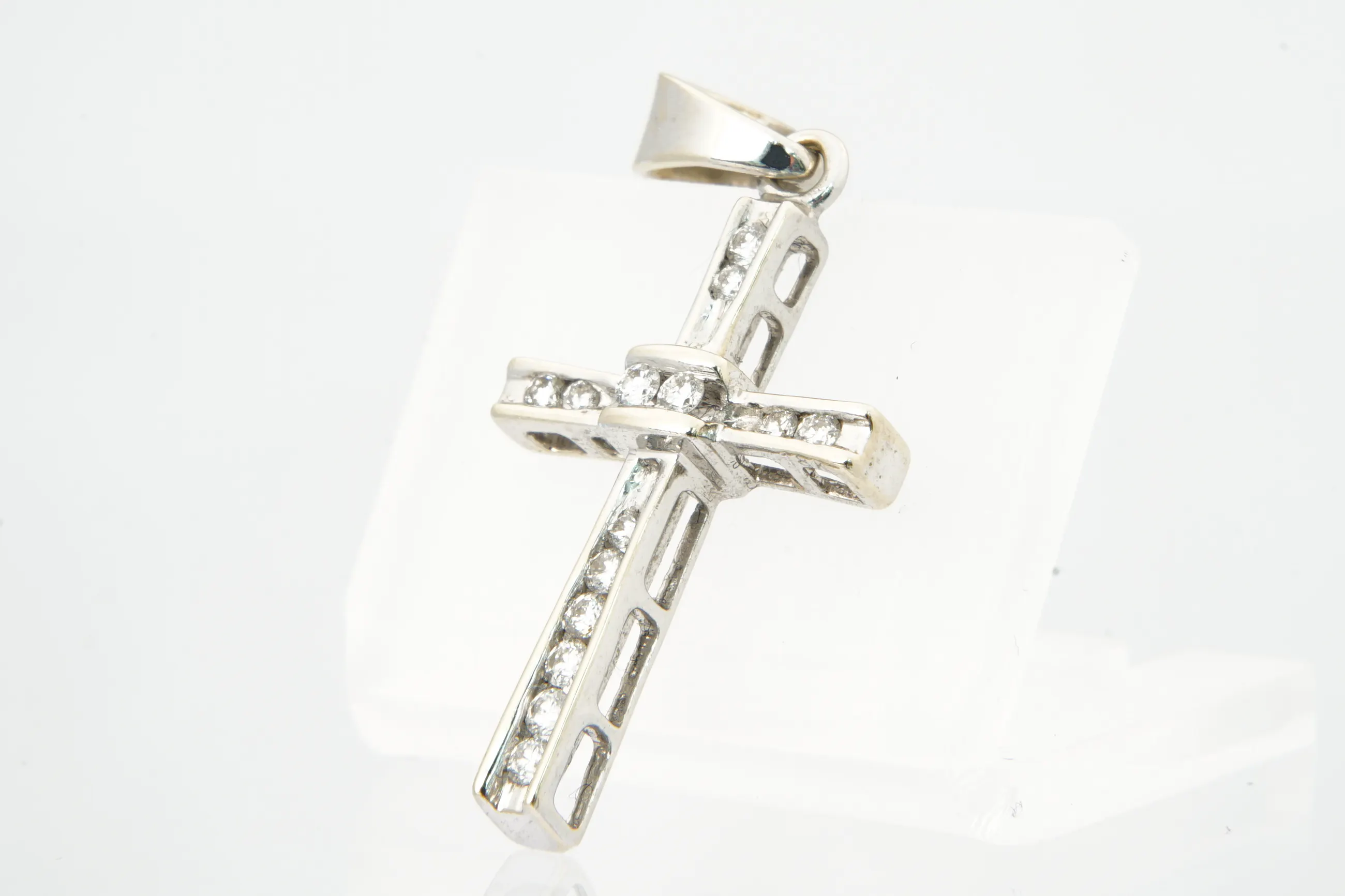 U biedt op een fraaie 14 karaats Wit-gouden Kruis-hanger met 14 separaat gezette briljant geslepen diamantjes.  Totaalgewicht aan diamant ca. 0.20ct. Hanger verkeert in goede conditie.