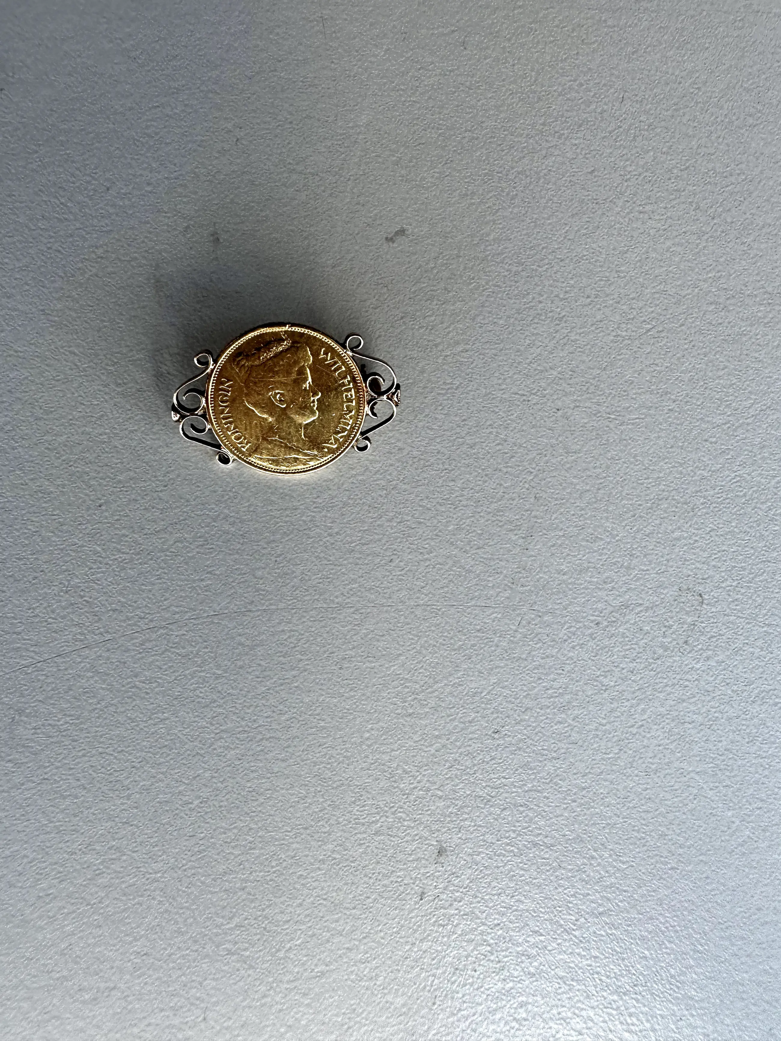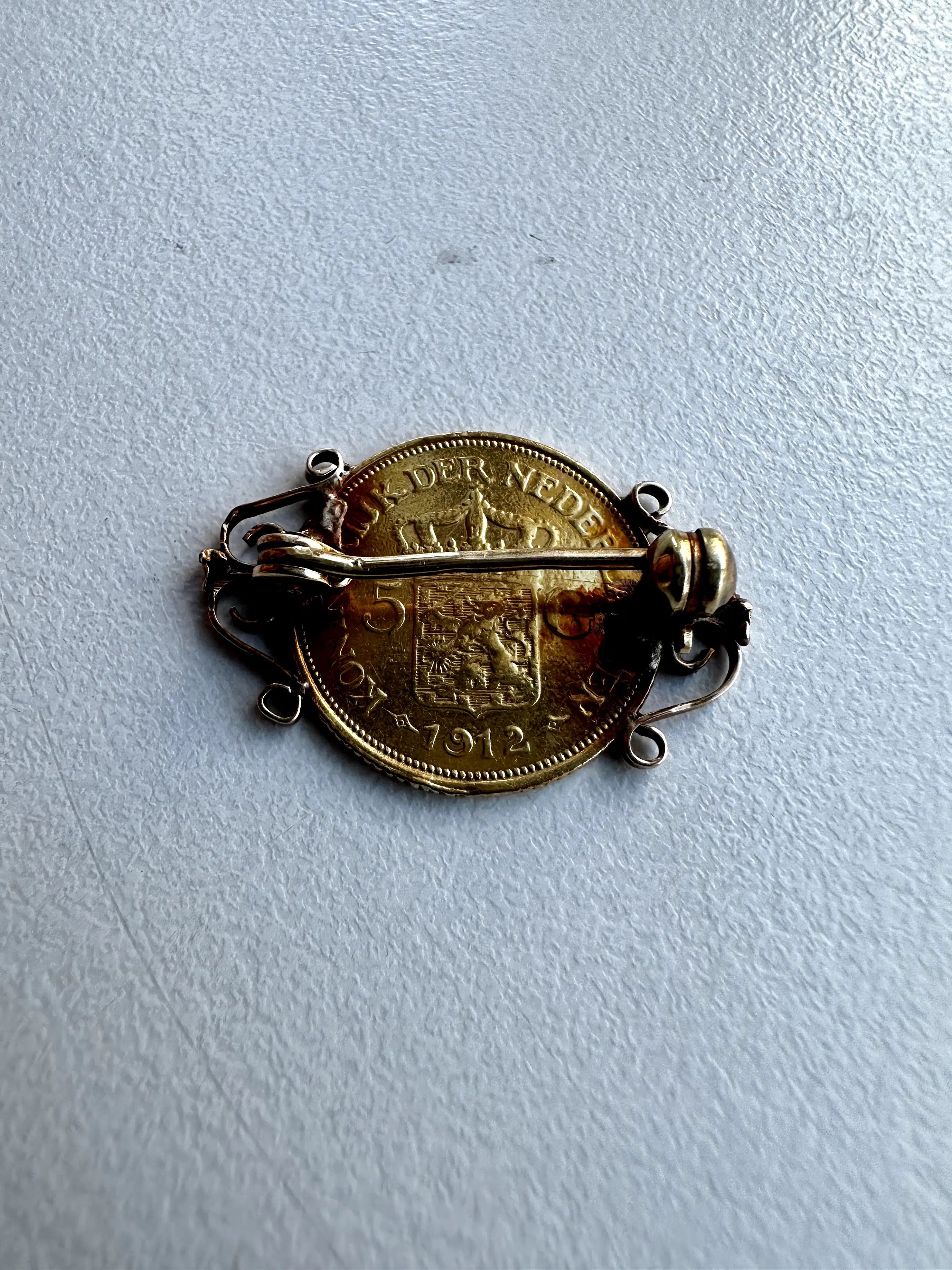 Munt is tot broche gemaakt, licht gebrand aan weerszijden.