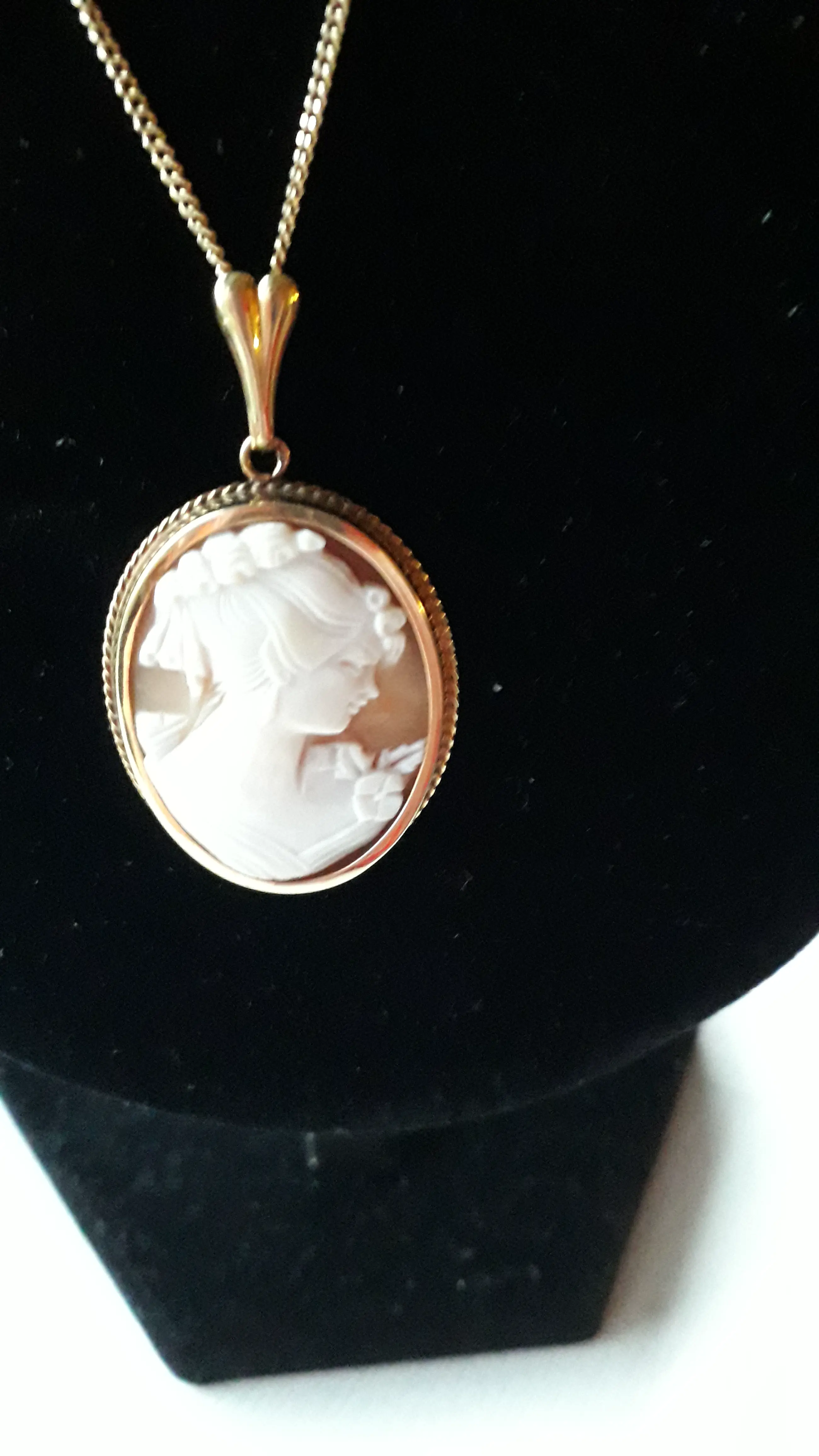 Gouden cameehanger, met mooi uitgesneden dame met haarband. Hanger met hangoog 4,5 cm. Achterzijde is met 4 tinsolderinkjes.