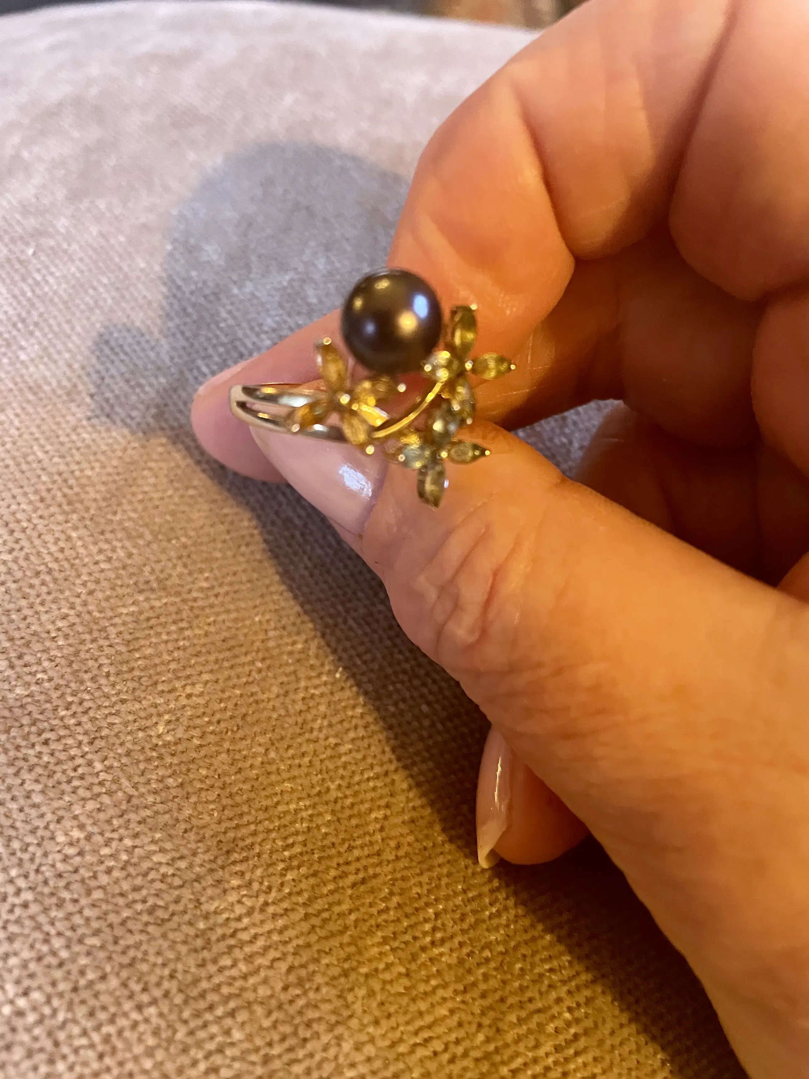 Gouden ring ( maat 20) met een zwarte Tahiti parel en bloemen van peridot, topaas en citrien. Opvallend en elegant.