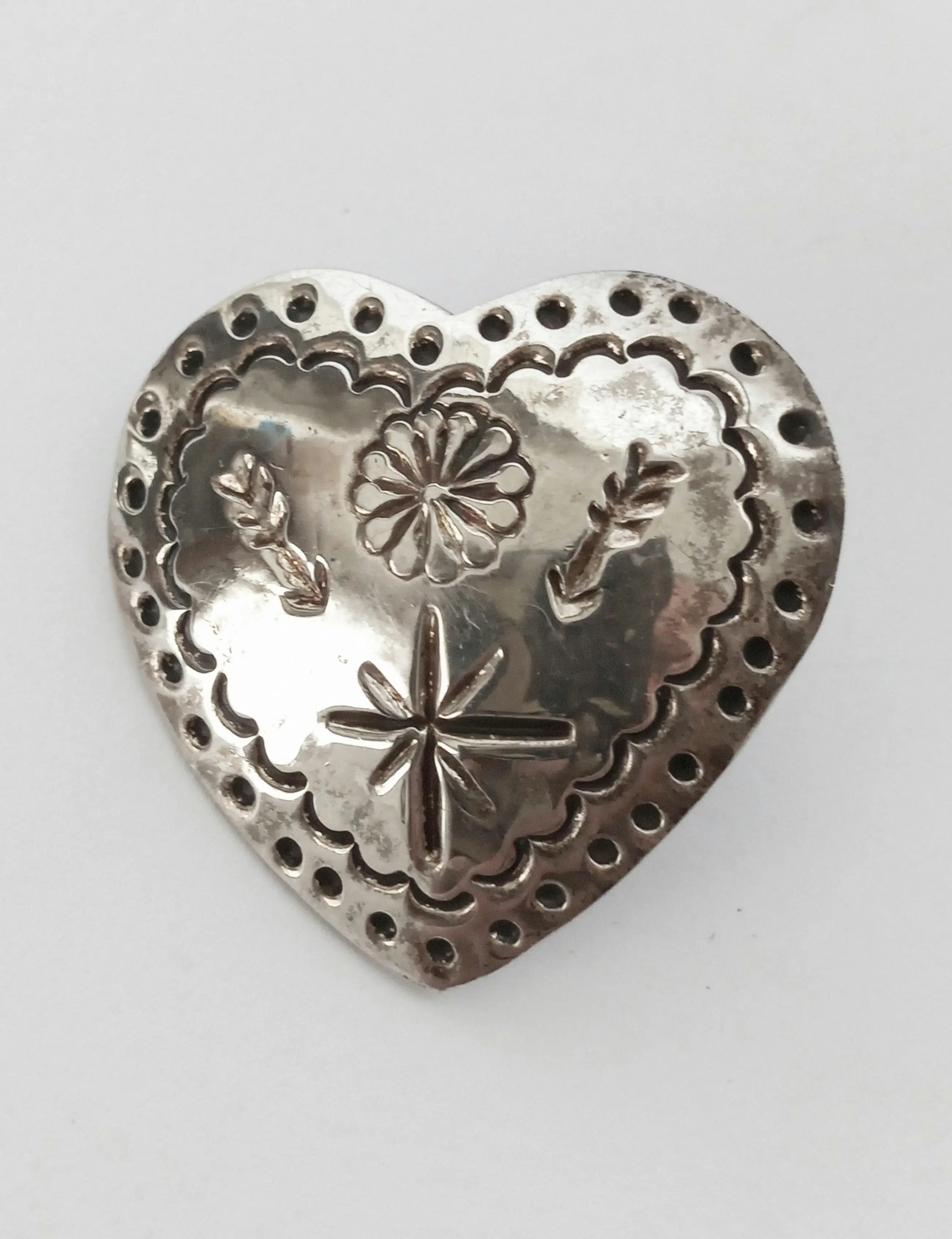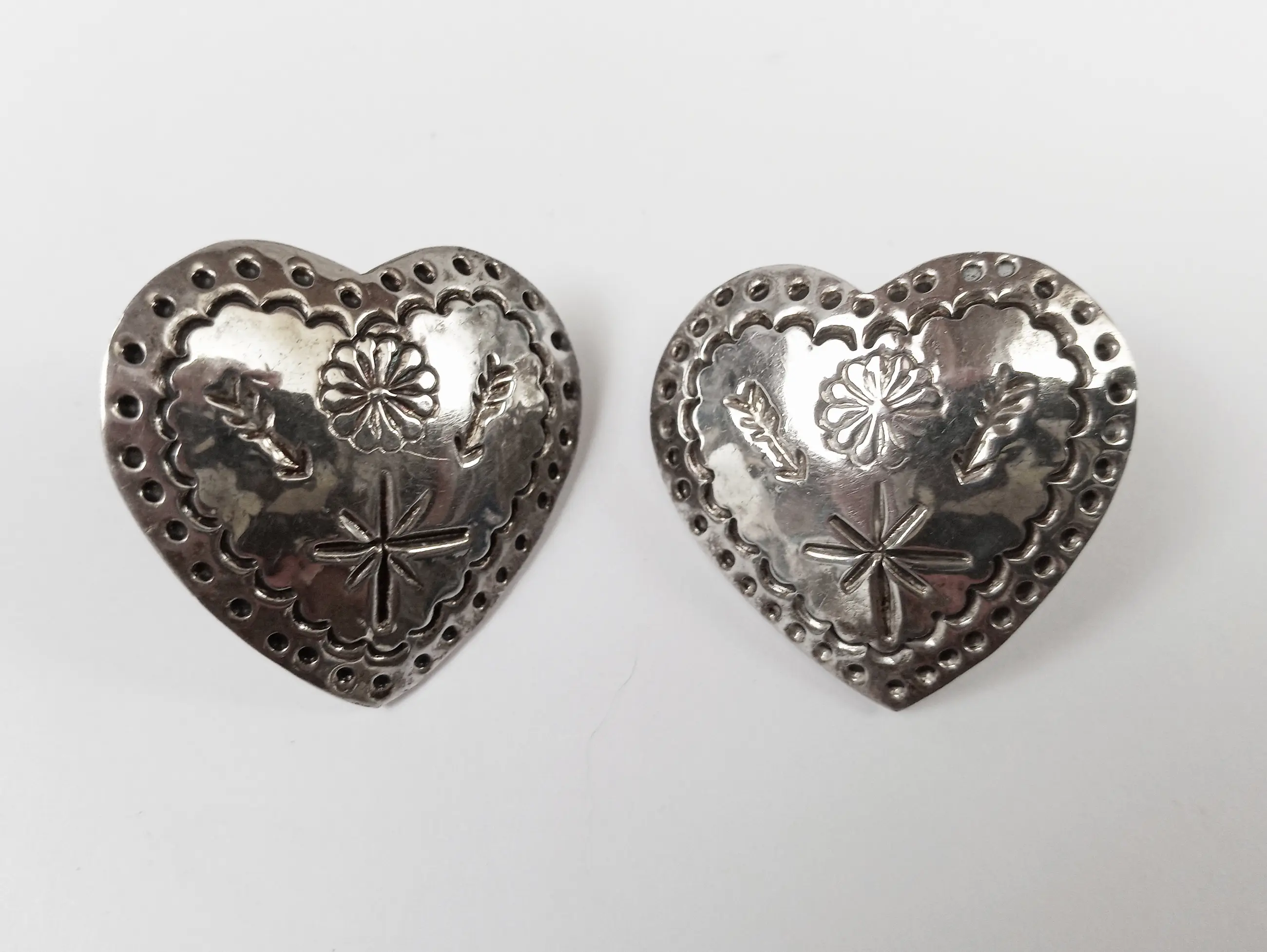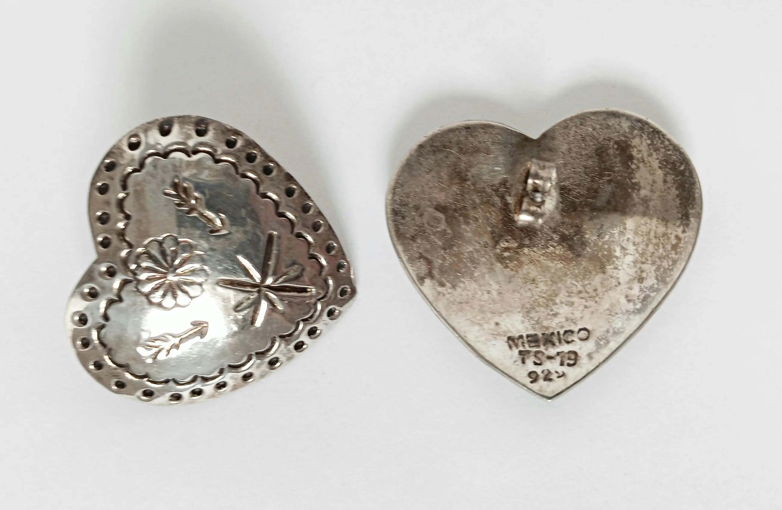 Bijzondere artisanale oorstekers in romantische hartvorm, gemaakt in de Mexicaanse zilverstad Taxco. De harten zijn gegraveerd en gestempeld met een poolster als symbool voor trouw, bloemen, en inheemse pijlen.