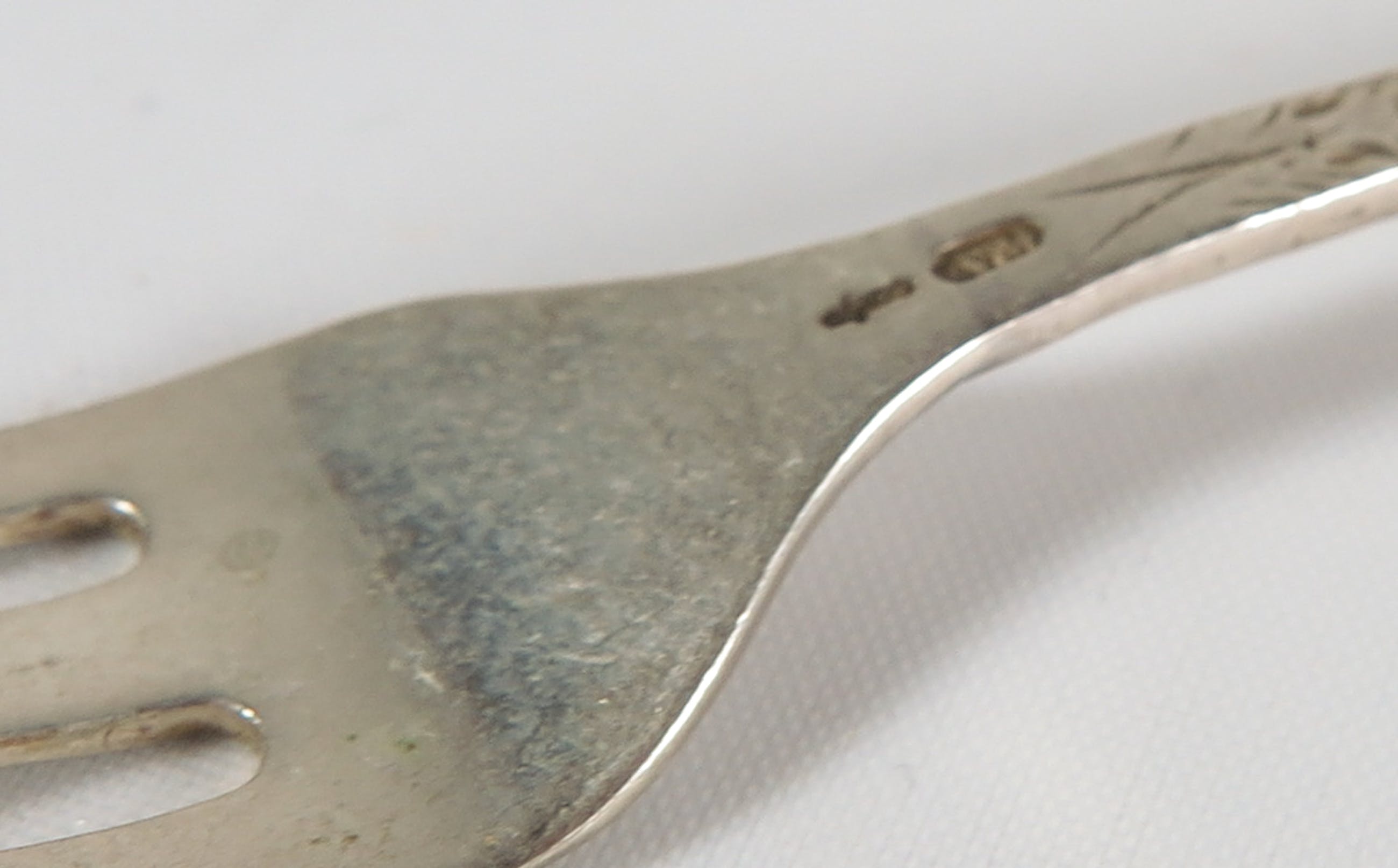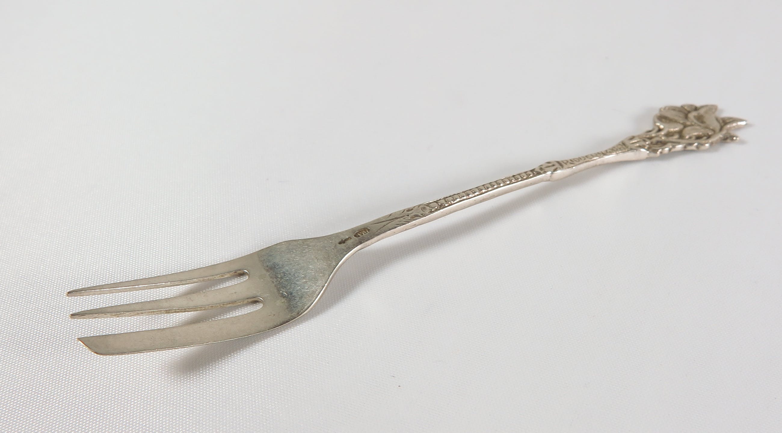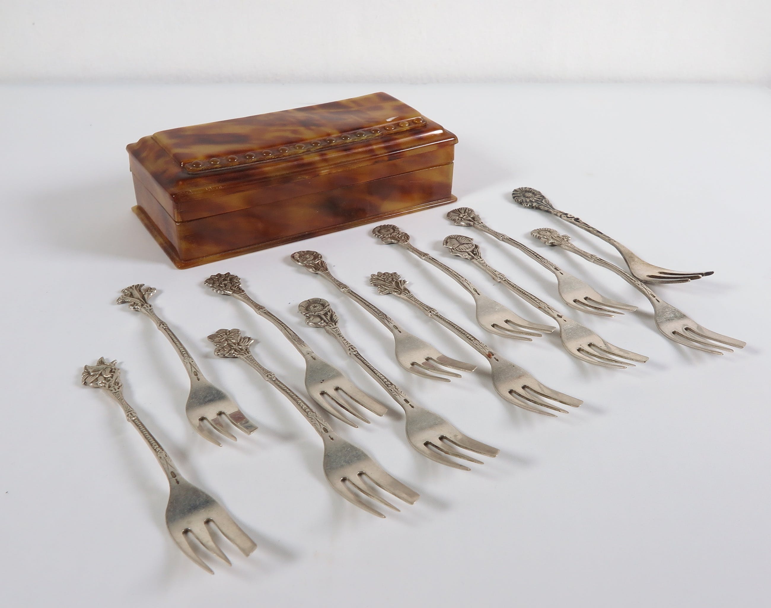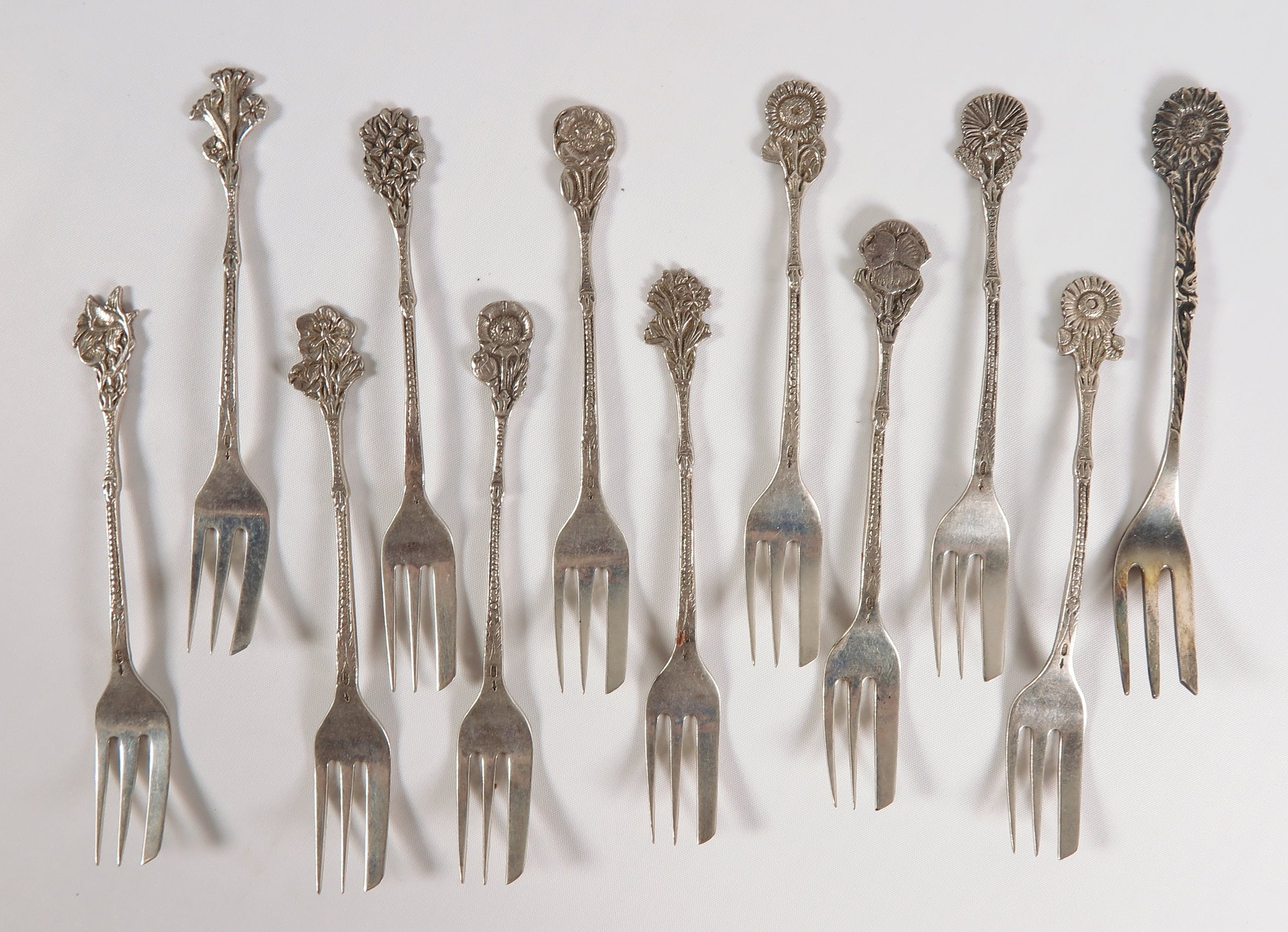 Lot van 12 zilveren gebaksvorkjes, gedecoreerd met bloemmotieven. Gemerkt.
