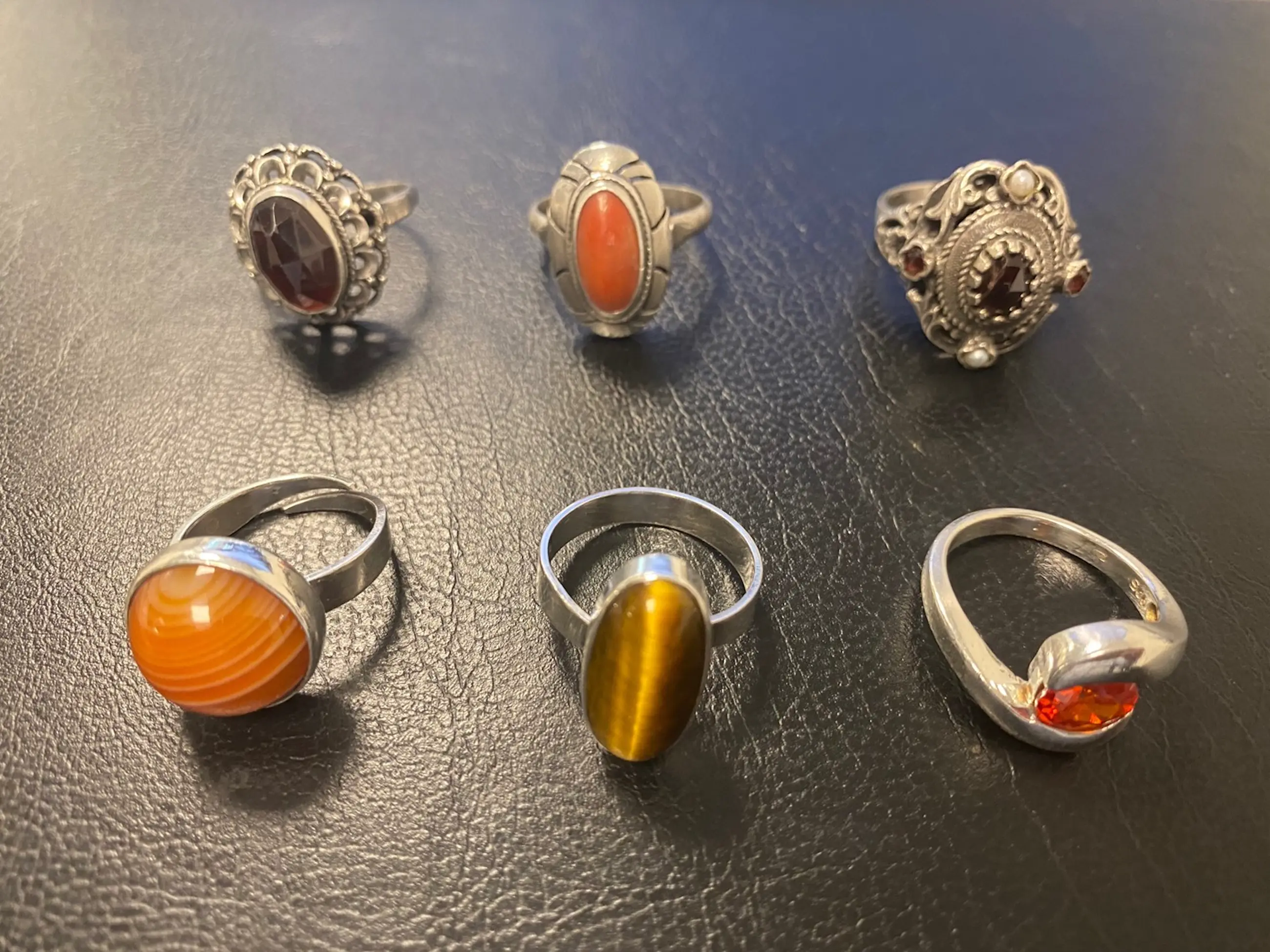 Lot van 6 zilveren ringen bezet met (edel)stenen.