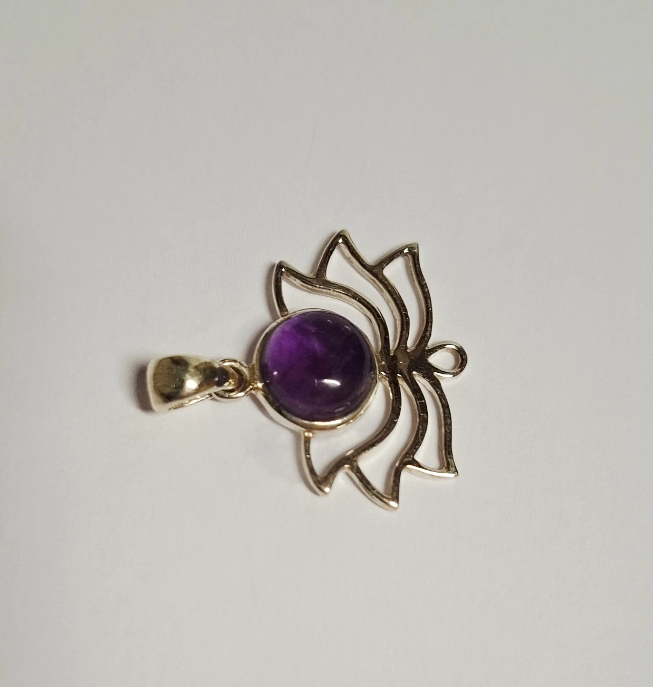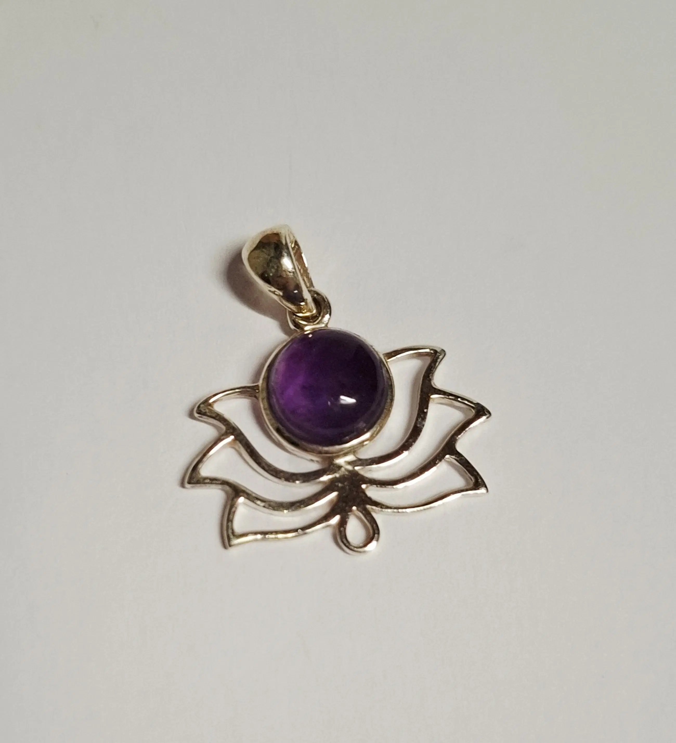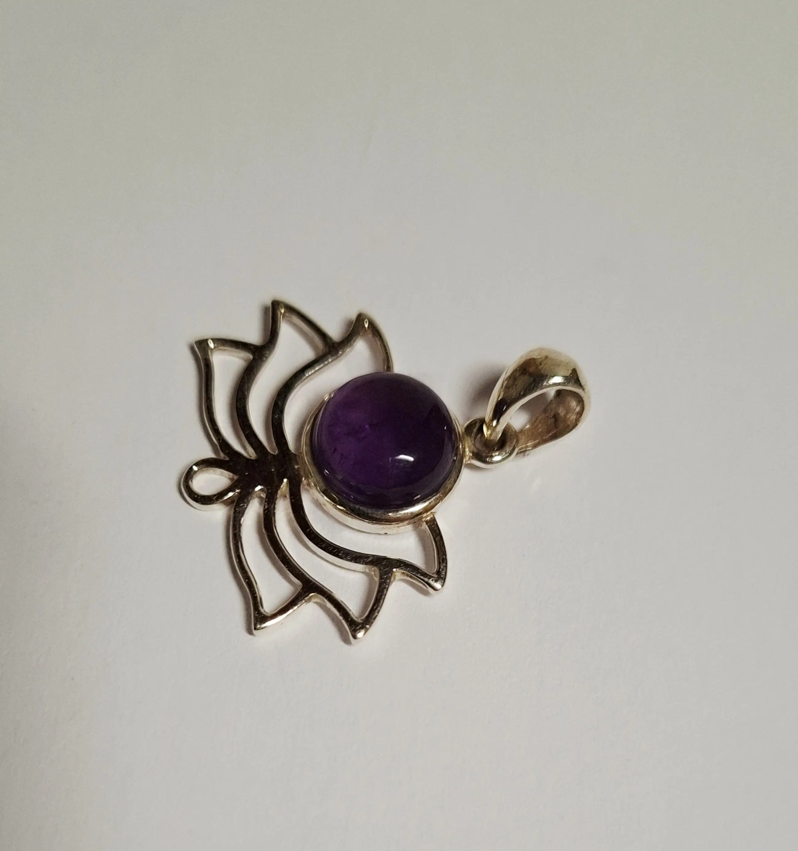 Lotus hanger gemaakt van 925 sterling zilver met een Amethist edelsteen. De hanger heeft een afmeting in lengte van 3,2 cm en breedte 2,8 cm en weegt 2,85 gram