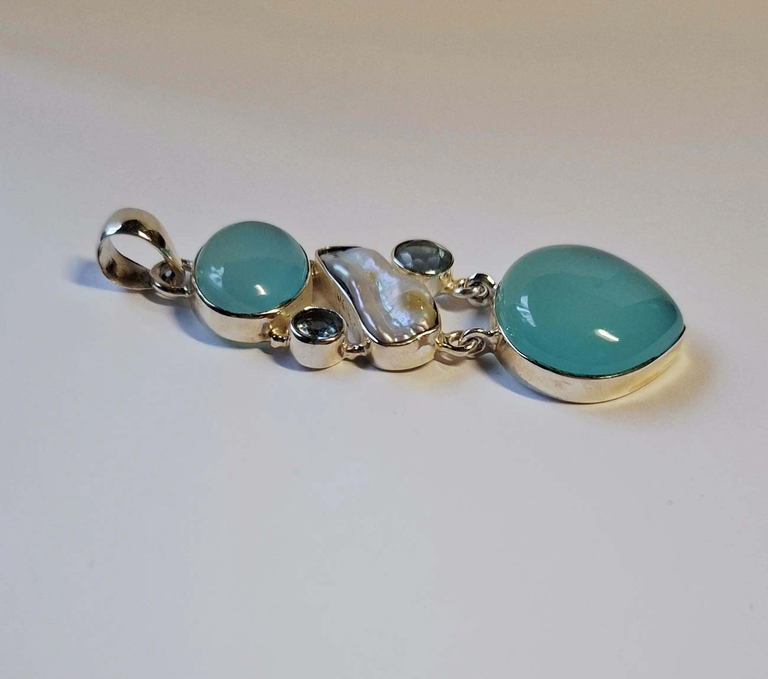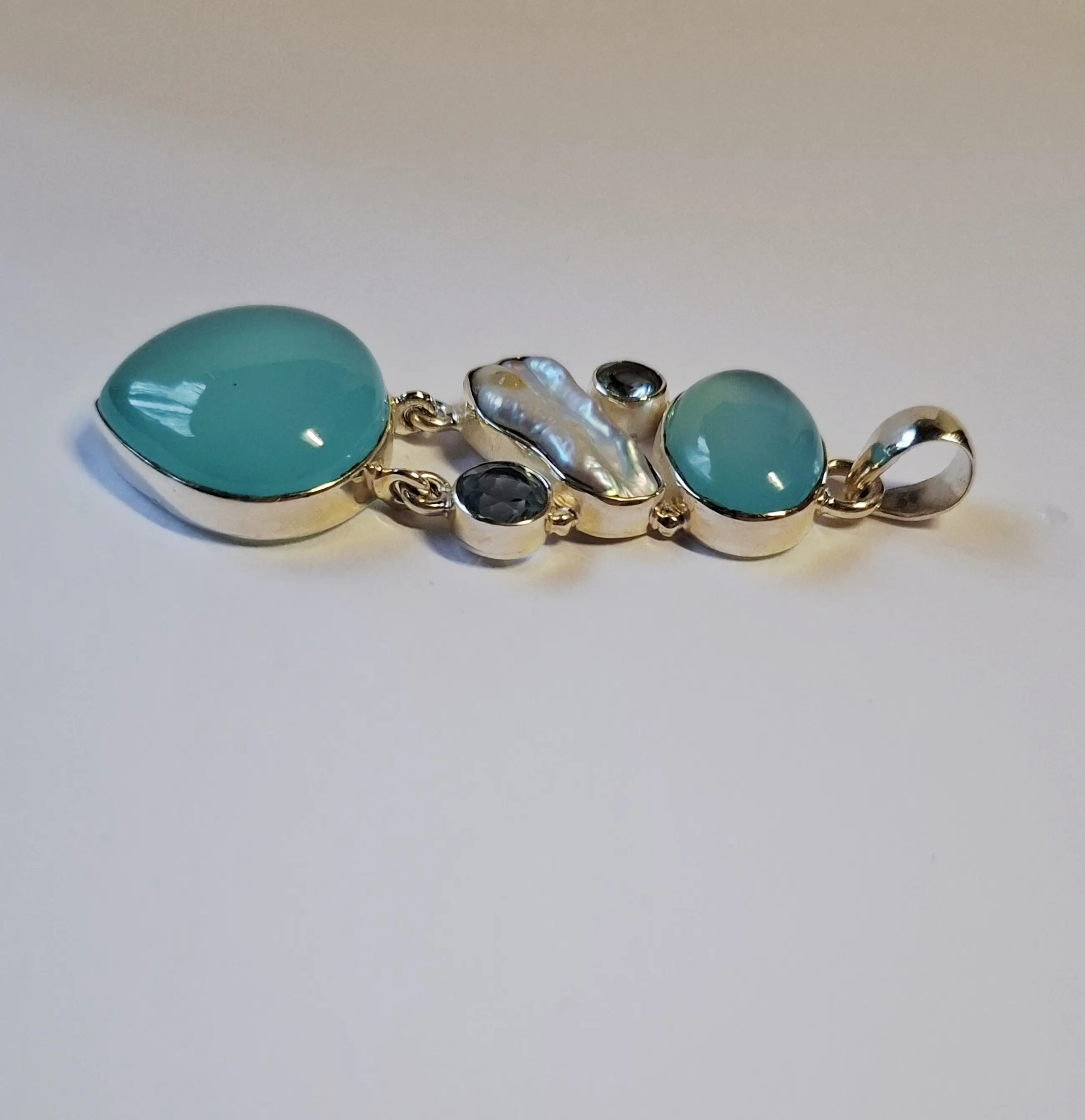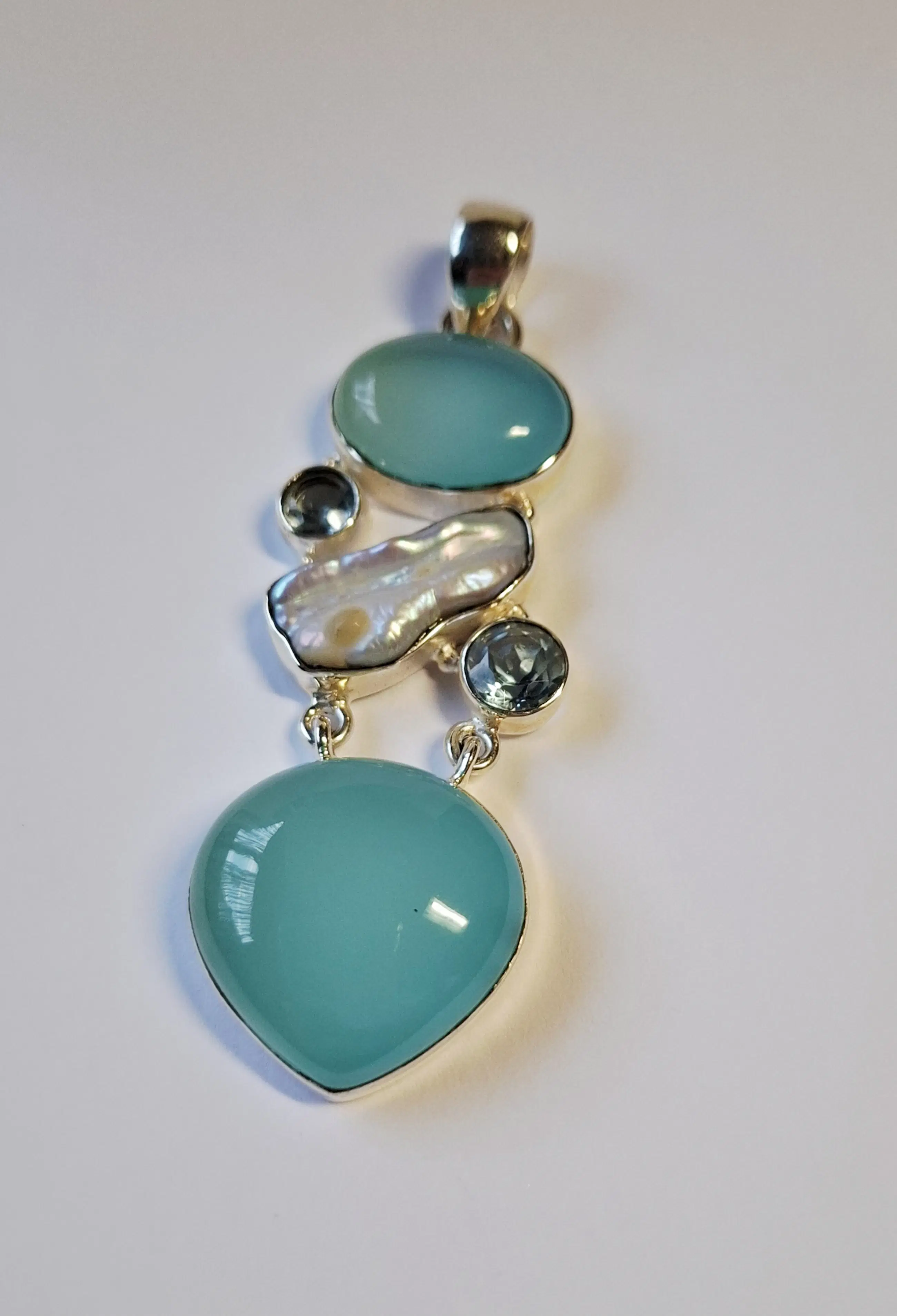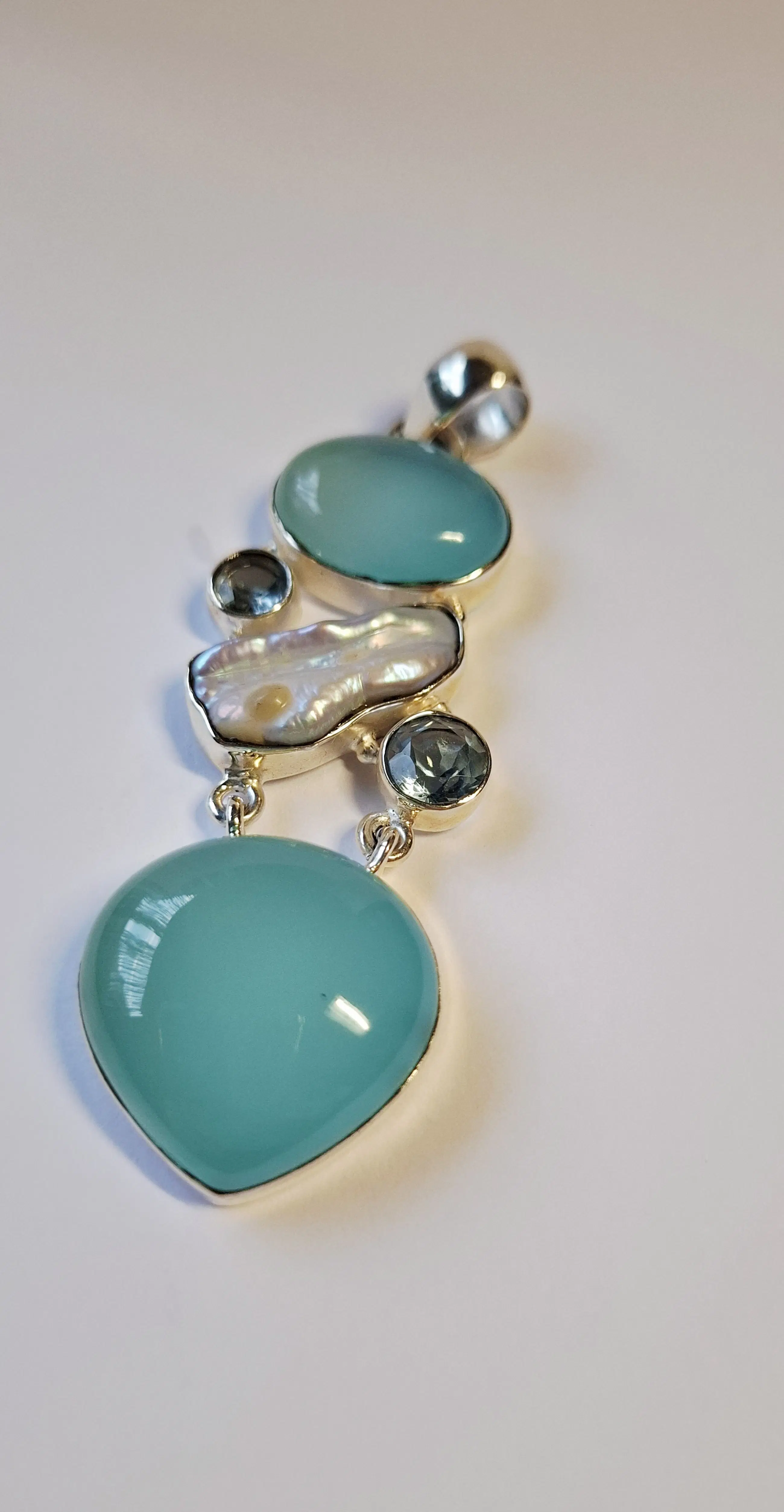 luchtige hemelsblauwe kleur amrapali hanger natuurlijke facetgeslepen aquakwarts r luchtige hemelsblauwe kleur amrapali hanger natuurlijke aquakwarts ronde cabochon losse edelsteen platte achterkant 2 x facetgeslepen aquamarijn Met 1 parelmoer schelp Lengte 7 cm  Breedte 2.3 cm  Hoogte 1 cm  En weegt 15.51 gram  Aquamarijn is even beroemd als bemind. De edelsteen is een heldergroen blauwige steen die er om bekend staat zeer geschikt te zijn voor hooggevoelige mensen. In vroegere tijden werd de steen gebruikt om duistere krachten tegen te gaan door de geesten van het licht in te schakelen. Het werd ook door zeelieden gedragen als talisman tegen verdrinking. Parelmoer staat bekend om zijn rustgevende, helende en balancerende werking. Het wordt vaak geassocieerd met vrouwelijke energie, emotioneel evenwicht en het verminderen van stress. Fysiek ondersteunt het de calciumopname, versterkt het de slijmvliezen en werkt het ontstekingsremmend, met name in de mond. Het versterkt ook de intuïtie en spirituele groei.. De parel staat bekend om zijn krachtige emotionele en fysieke werking, met name op het gebied van van kalmte balans en zuivering .  Het wordt geassocieerd met vrouwelijke energie, het verminderen van stress, en het bevorderen van innerlijke rust, eerlijkheid en spirituele groei. Fysiek wordt de parel vaak verbonden met het ondersteunen van de maag en milt. Deze komt uit een privé Collectie Heeft altijd in een vitrinekastje gelegen eigenlijk is het nog nieuw voor een sieraad uit 2020.  Word goed verpakt en verzekerd verzonden met track en tracé