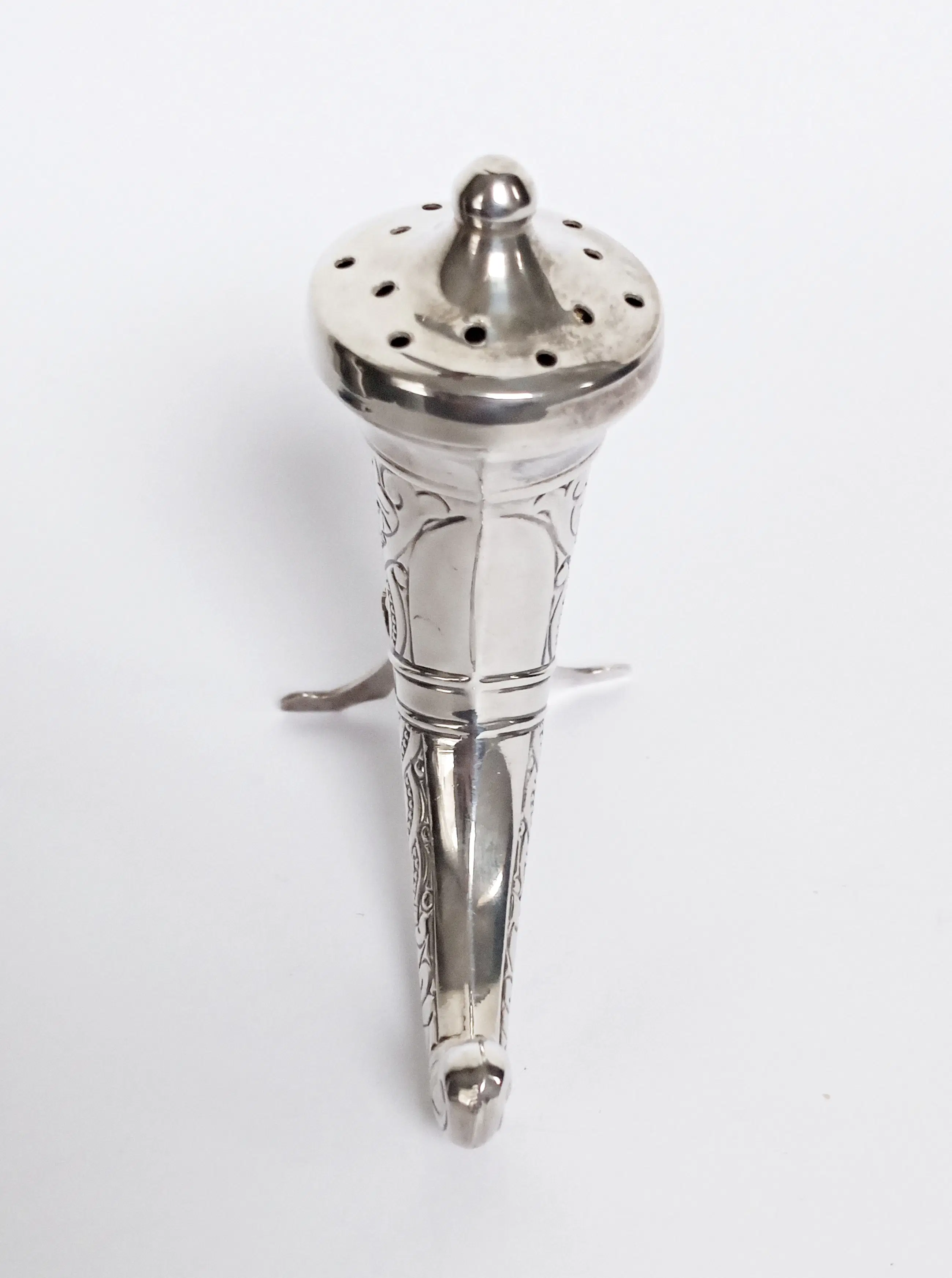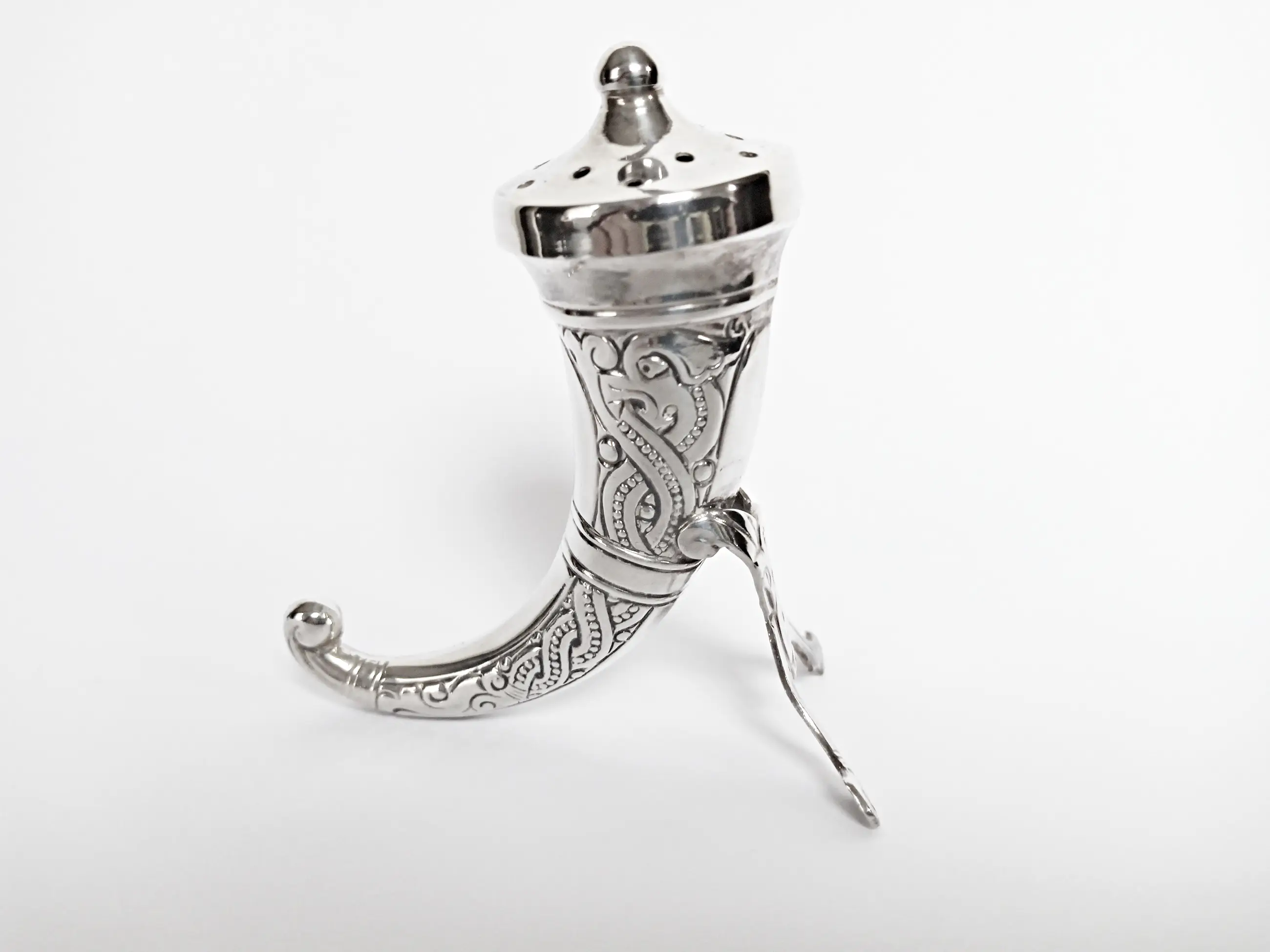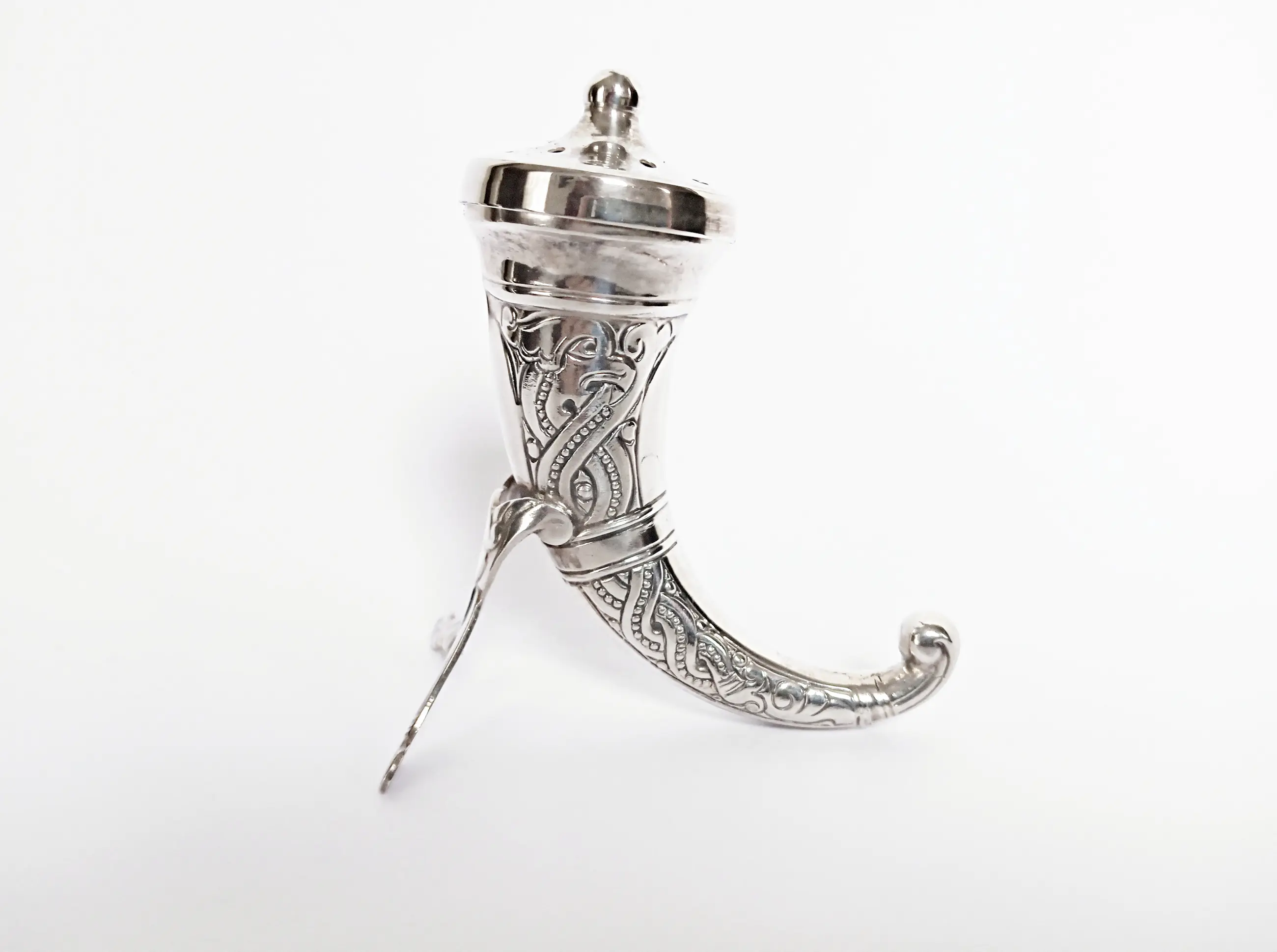 Het ontwerp van de strooier is gebaseerd op een Viking drinkhoorn, geheel in sterling zilver uitgevoerd met een vergulde binnenkant tegen de inwerking van het zout.