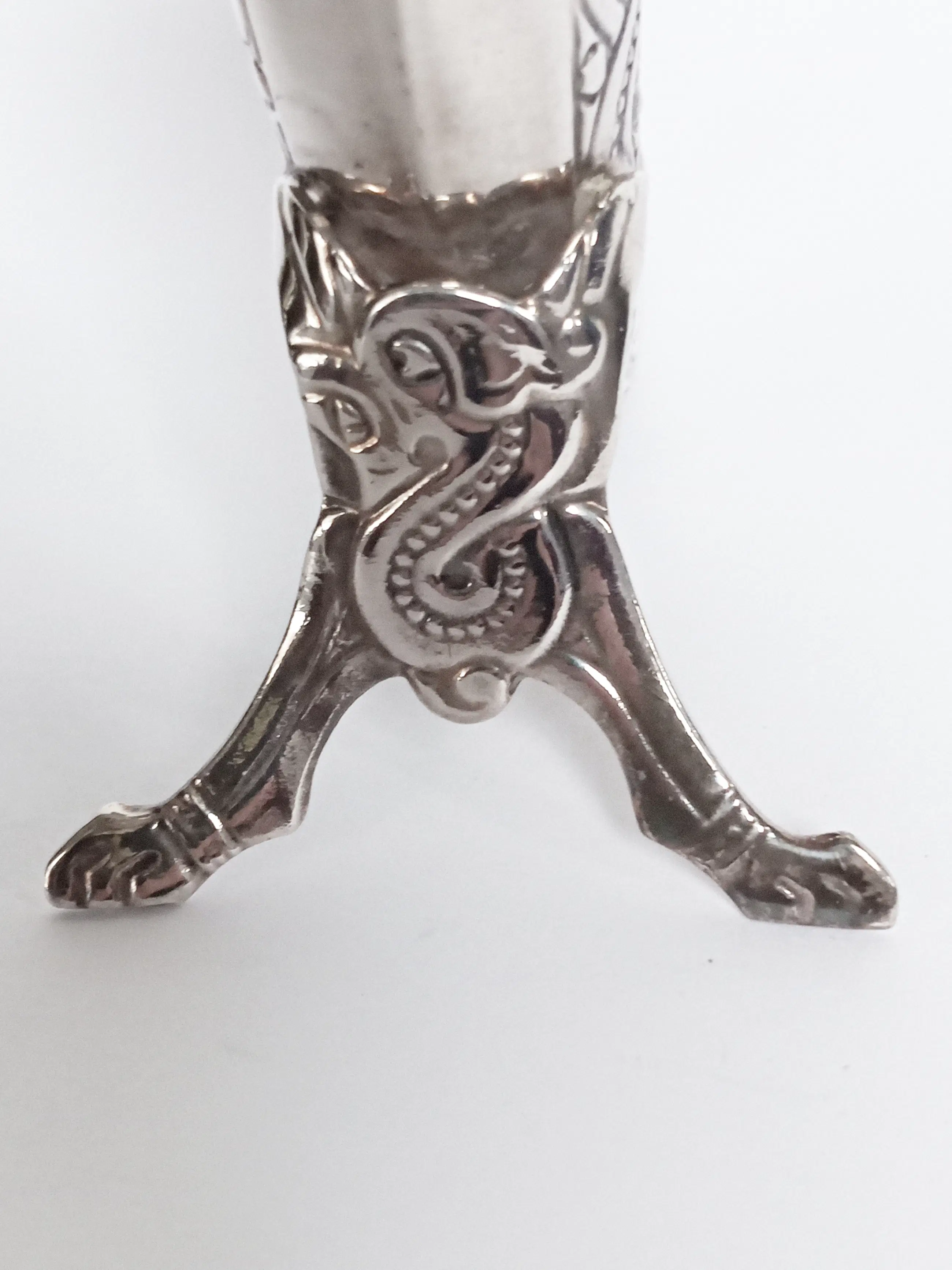 Het hoorntje is versierd met traditionele Urnesstil motieven, genoemd naar een bekende Vikingkerk in Noorwegen die dateert van ca 1100, en wordt gekenmerkt door gestileerde dierfiguren met veel golven en krullen. De stijl wordt ook wel Dragestil genoemd, draken stijl. Prachtig handwerk.