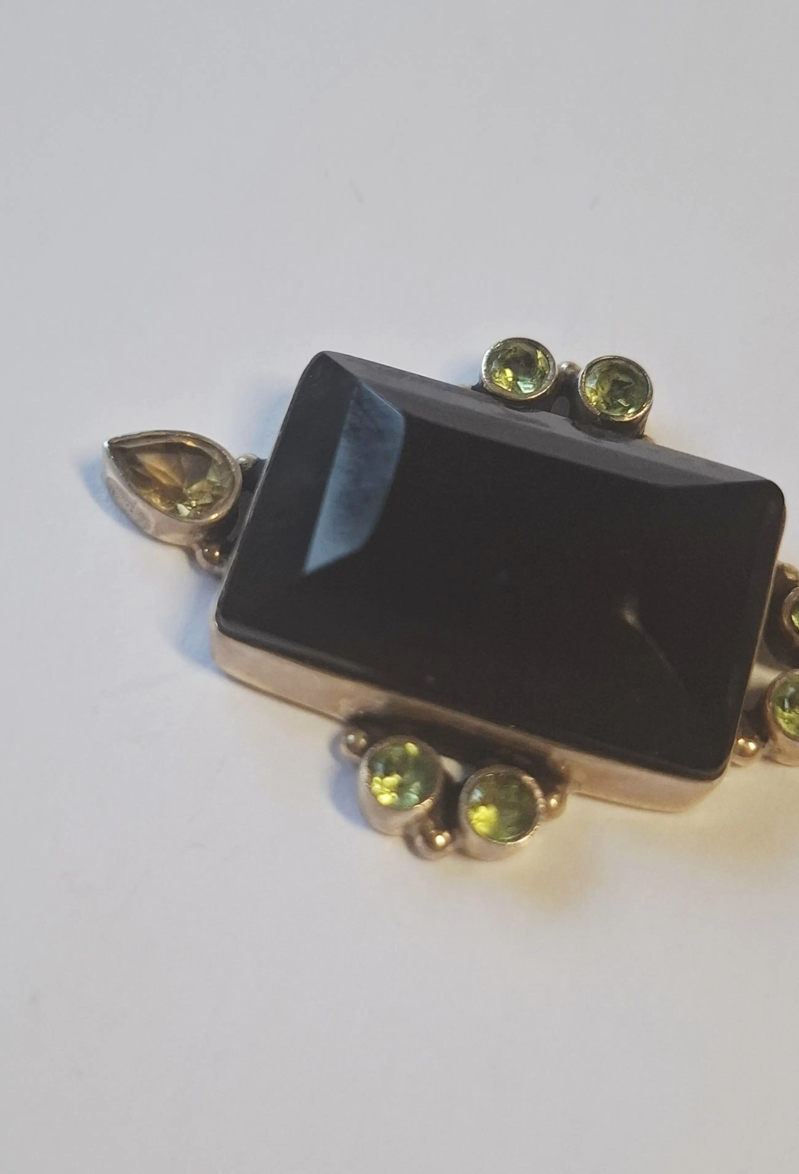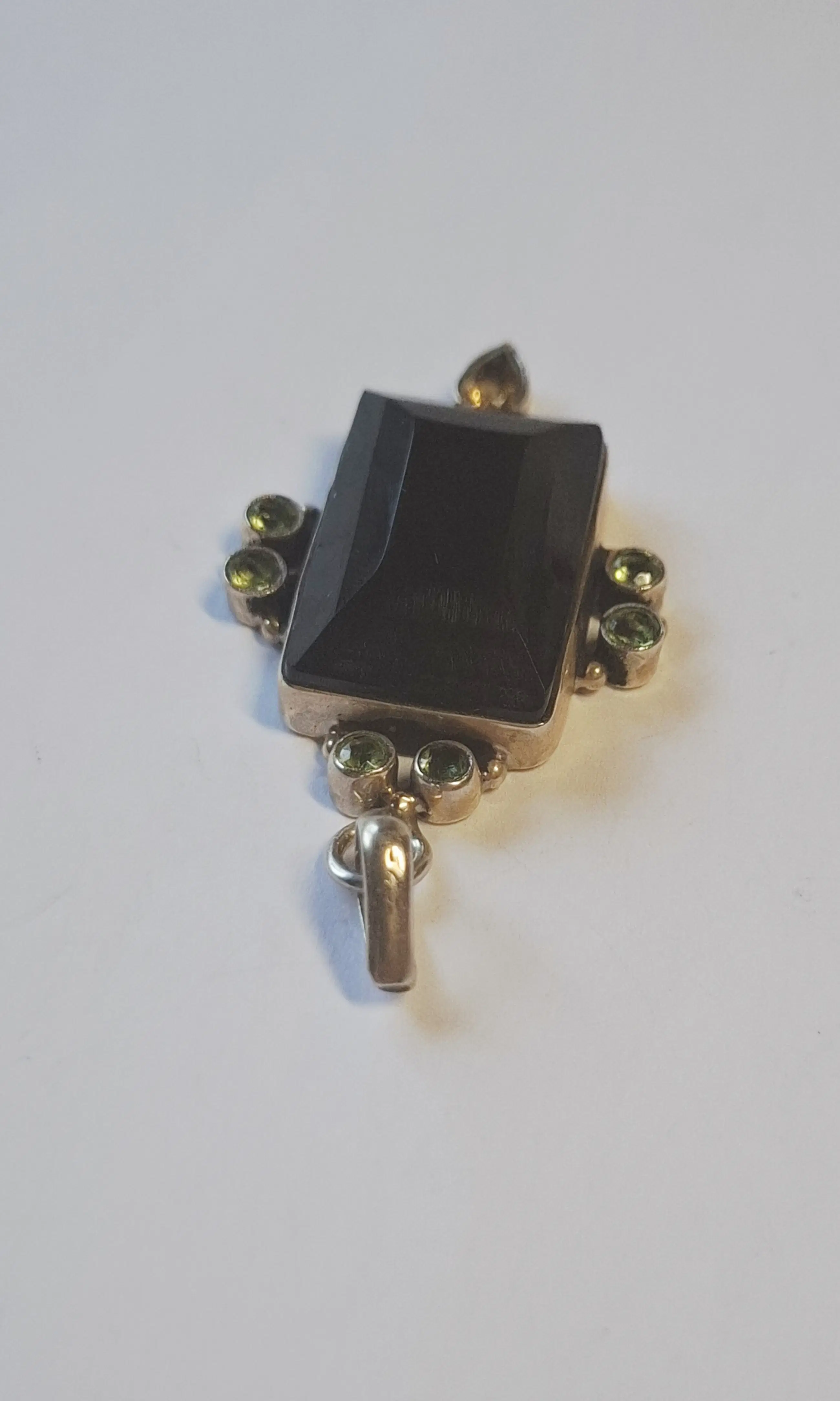 Mooie zilveren hanger met black Onyx en 6 facetgeslepen Peridoot edelstenen en facetgeslepen rookkwarts   . Onyx kan  Je  bij je dragen kan helpen in belastende en stressvolle situaties. De steen geeft steun, kracht en doorzettingsvermogen en helpt je je doelen te bereiken. Het maakt standvastig en verantwoordelijk en stimuleert zelfverwezenlijking. Onyx stimuleert analytisch denken, logica, concentratie en helpt om een nuchtere en realistische houding aan te nemen. Het is een goede steen voor mensen die makkelijk afgeleid of beïnvloed worden komt uit 1975 .