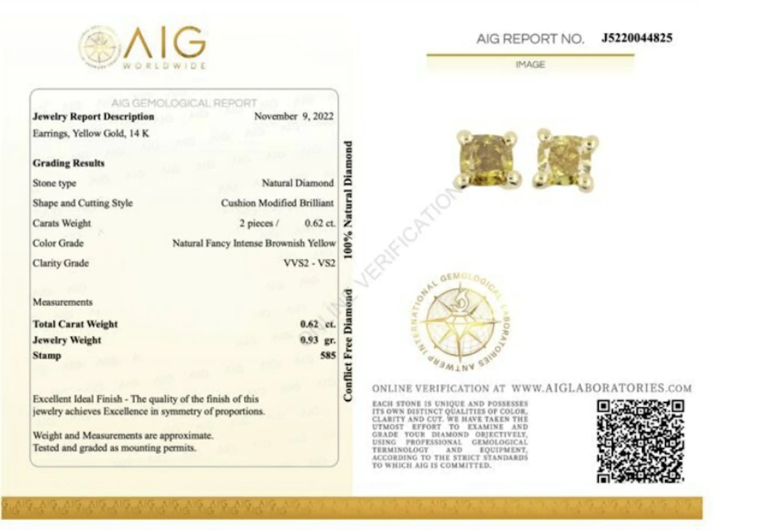 Dit zijn klassieke briljanten oorstekers in 14 karaat (585/-.) geelgoud met 2 kussenvormige briljanten in de kwaliteit "Natural Fancy Intense Brownish Yellow" (intense bruingele kleur) en VVS2 (zeer zeer kleine insluitsels 2) en VS2 ( zeer kleine insluitsels 2), een bijbehorend certificaat wordt meegeleverd. De briljant geslepen kussendiamanten wegen elk 0,31 karaat voor een totaal van 0,62 karaat.