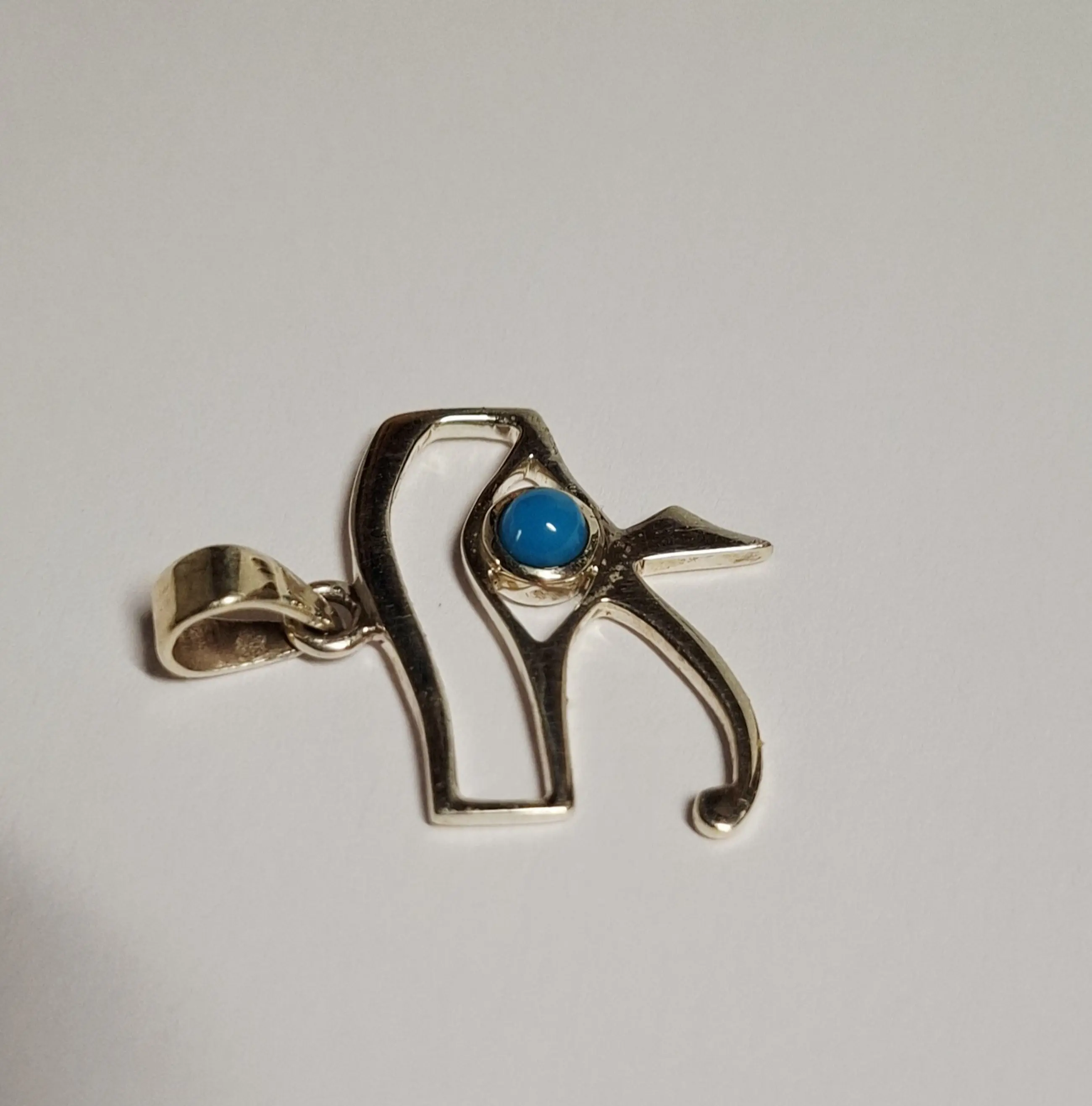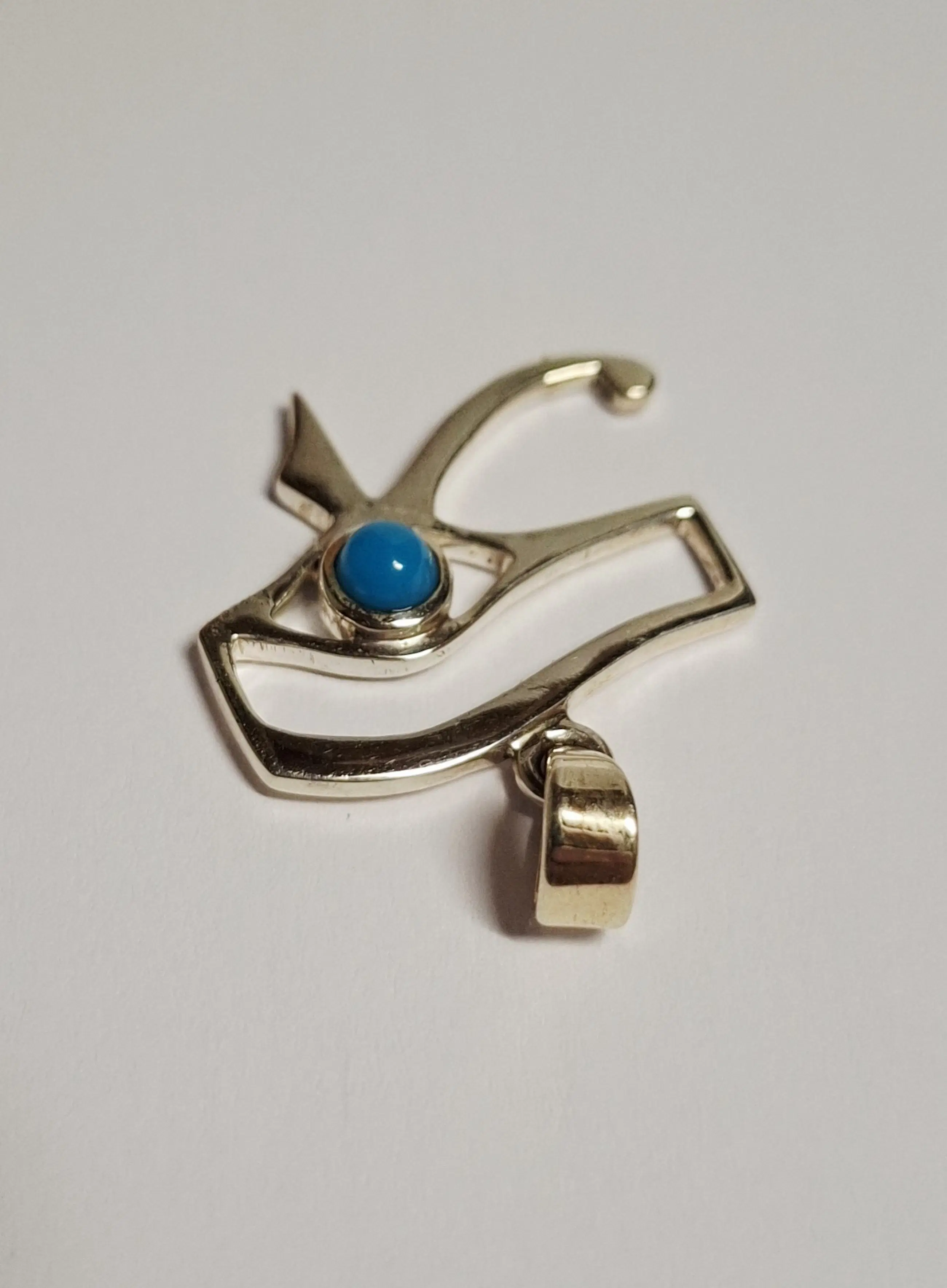Dit is een handgemaakte zilveren hanger met het Oog van Horus en een turquoise steen.