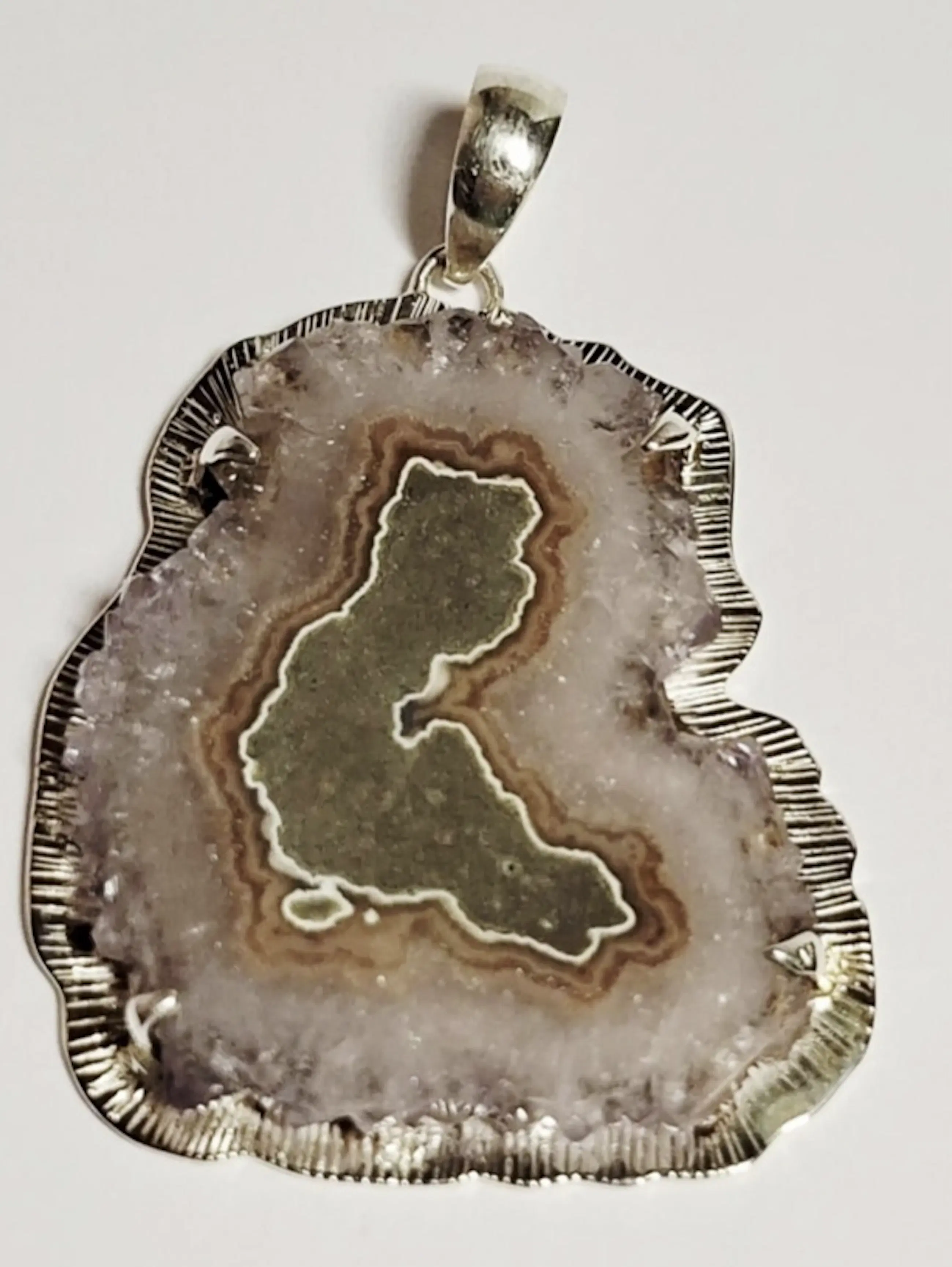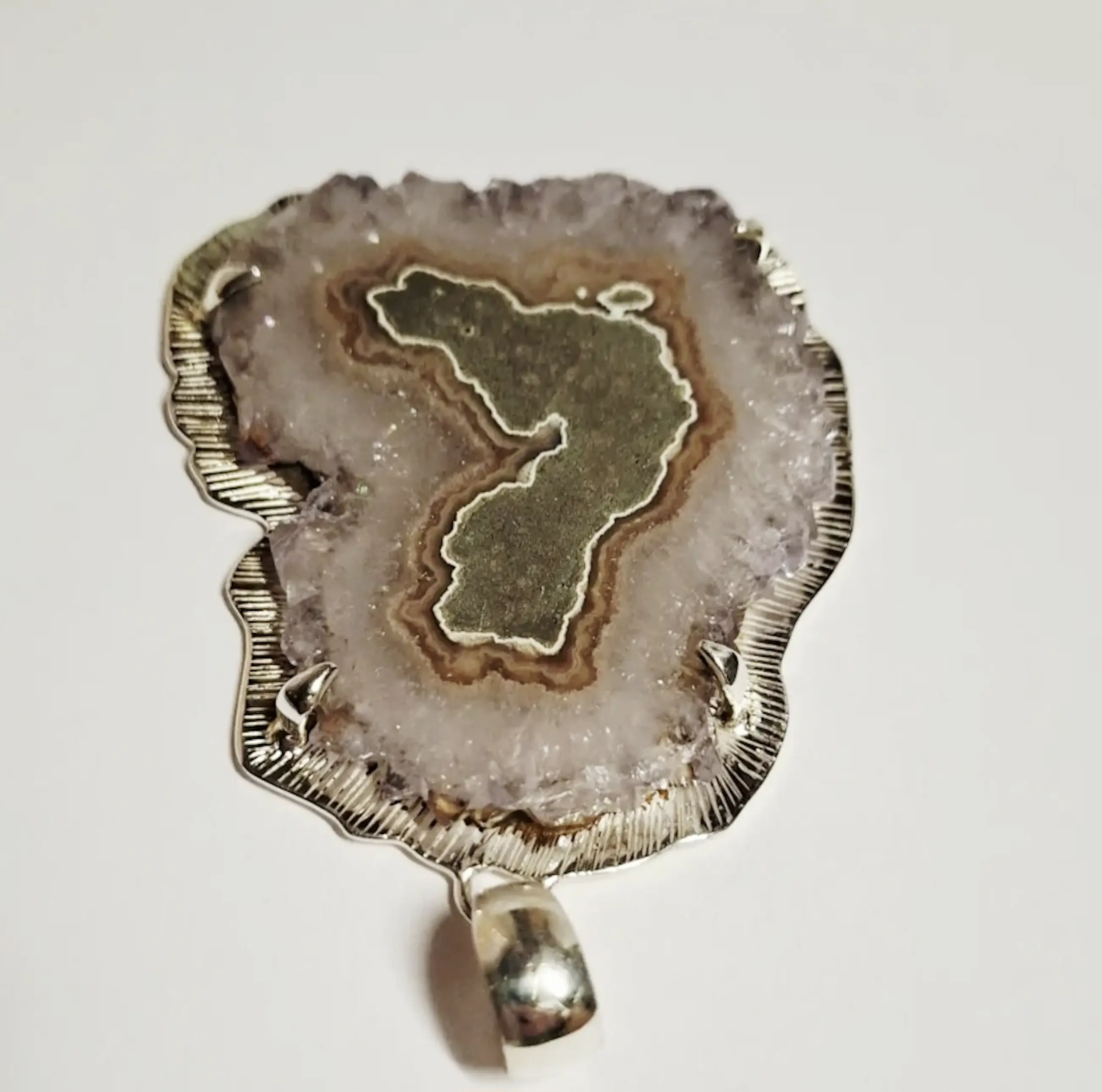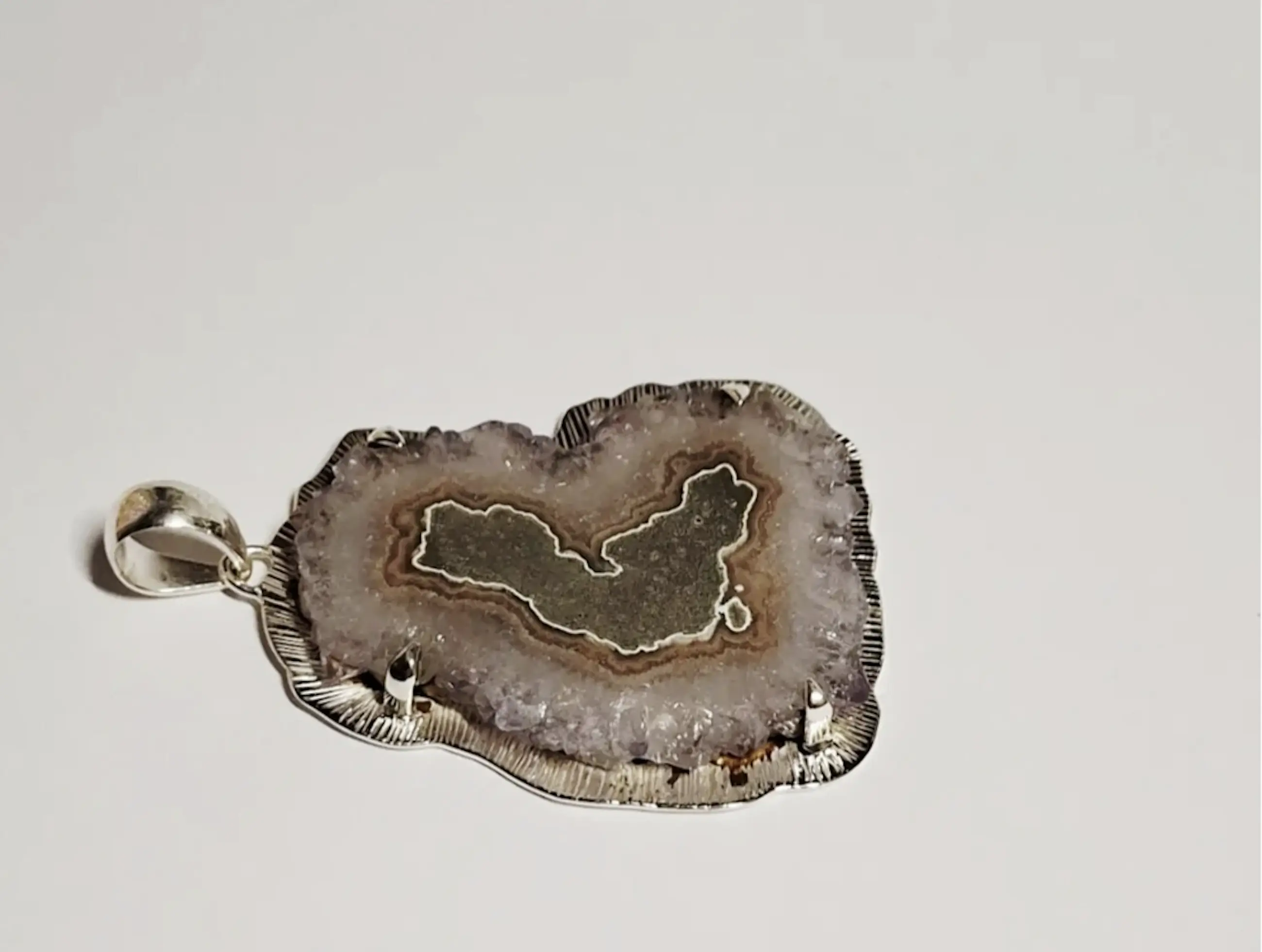 Nieuwe extra grote hanger met Amethist edelsteen aan twee zijden gepolijst met ruwe buitenrand in zilver gevat, Heel zeldzaam en exclusief en bijzonder