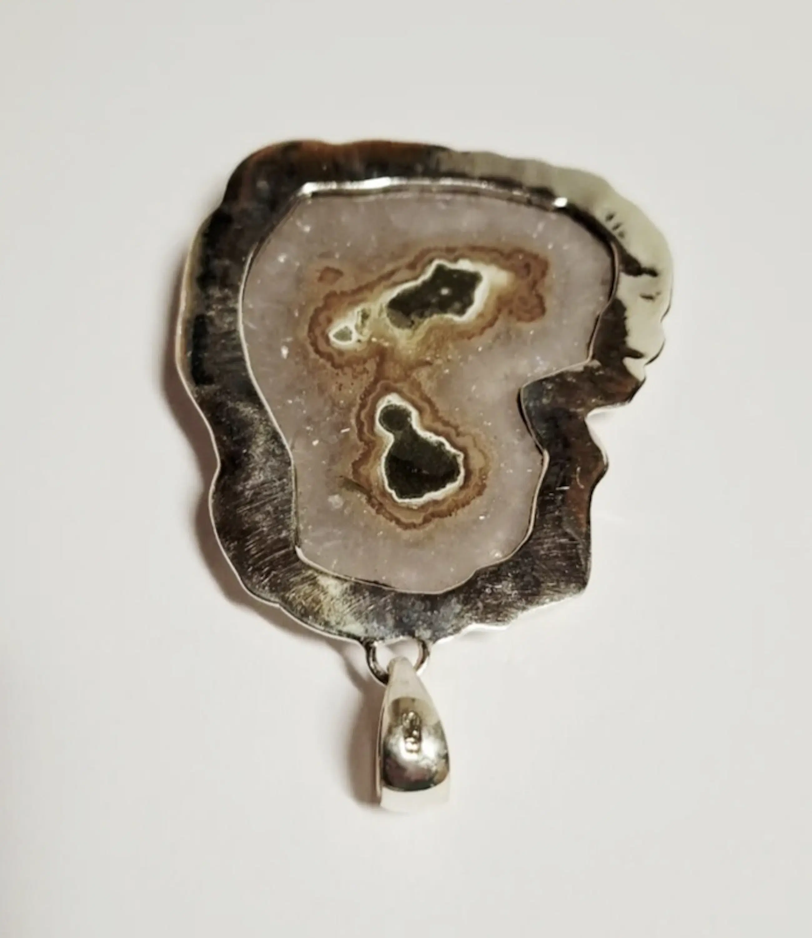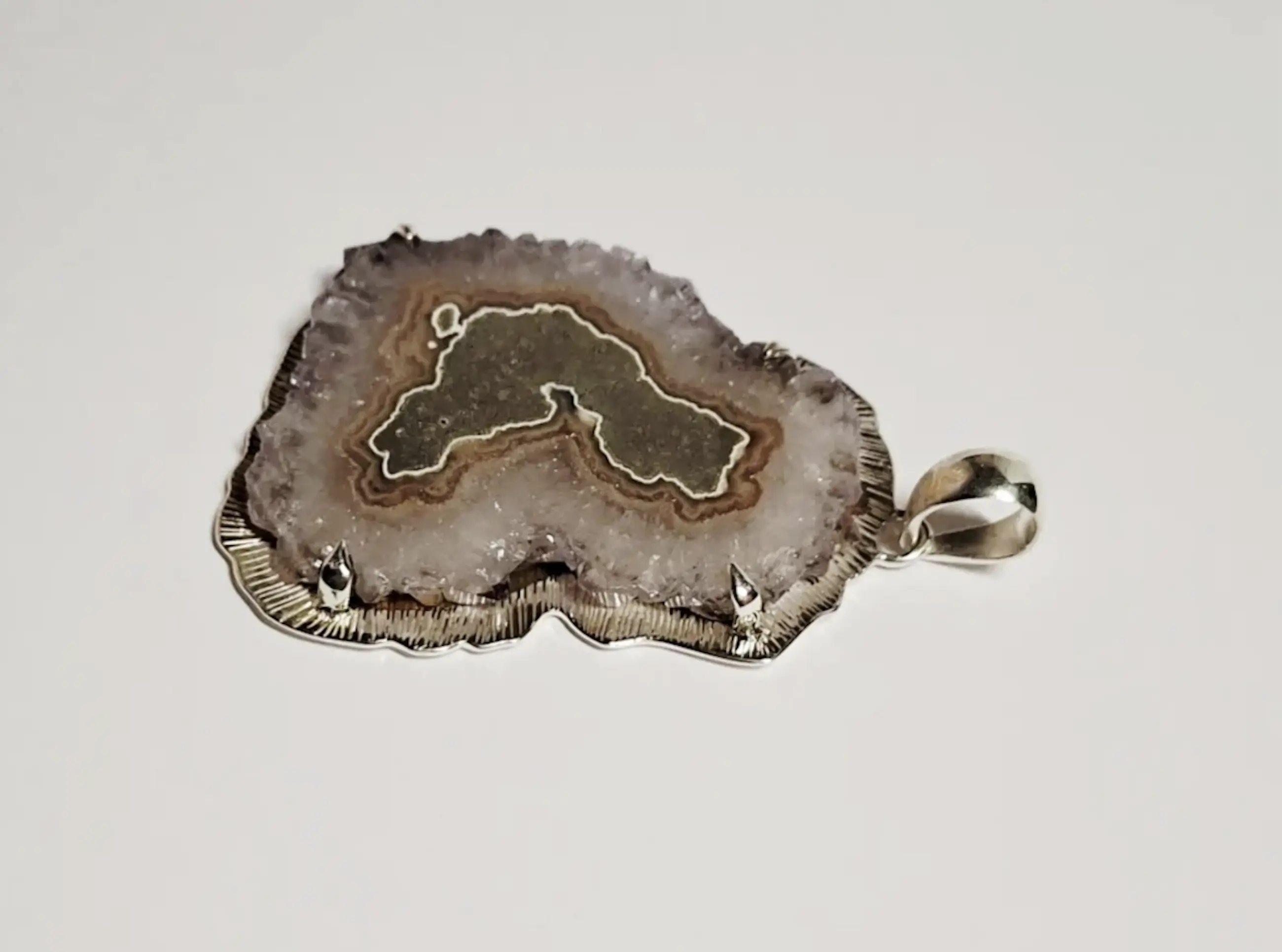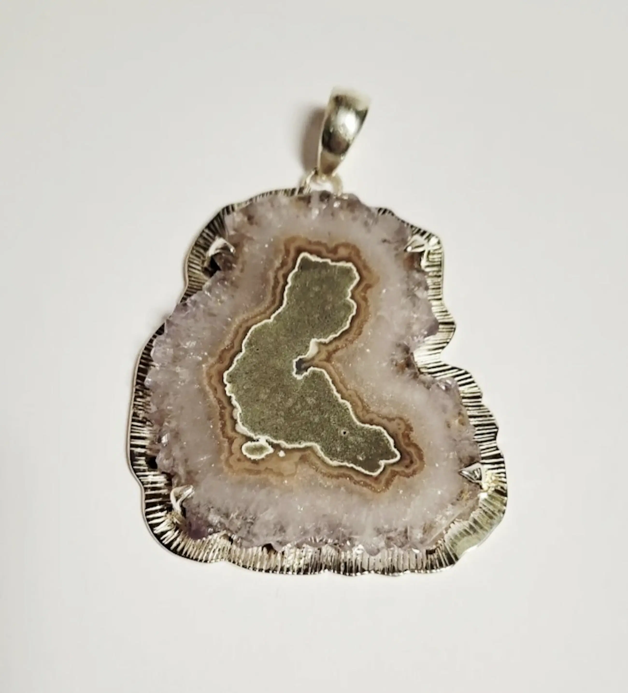 Nieuwe extra grote hanger met Amethist edelsteen aan twee zijden gepolijst met ruwe buitenrand in zilver gevat, Heel zeldzaam en exclusief en bijzonder