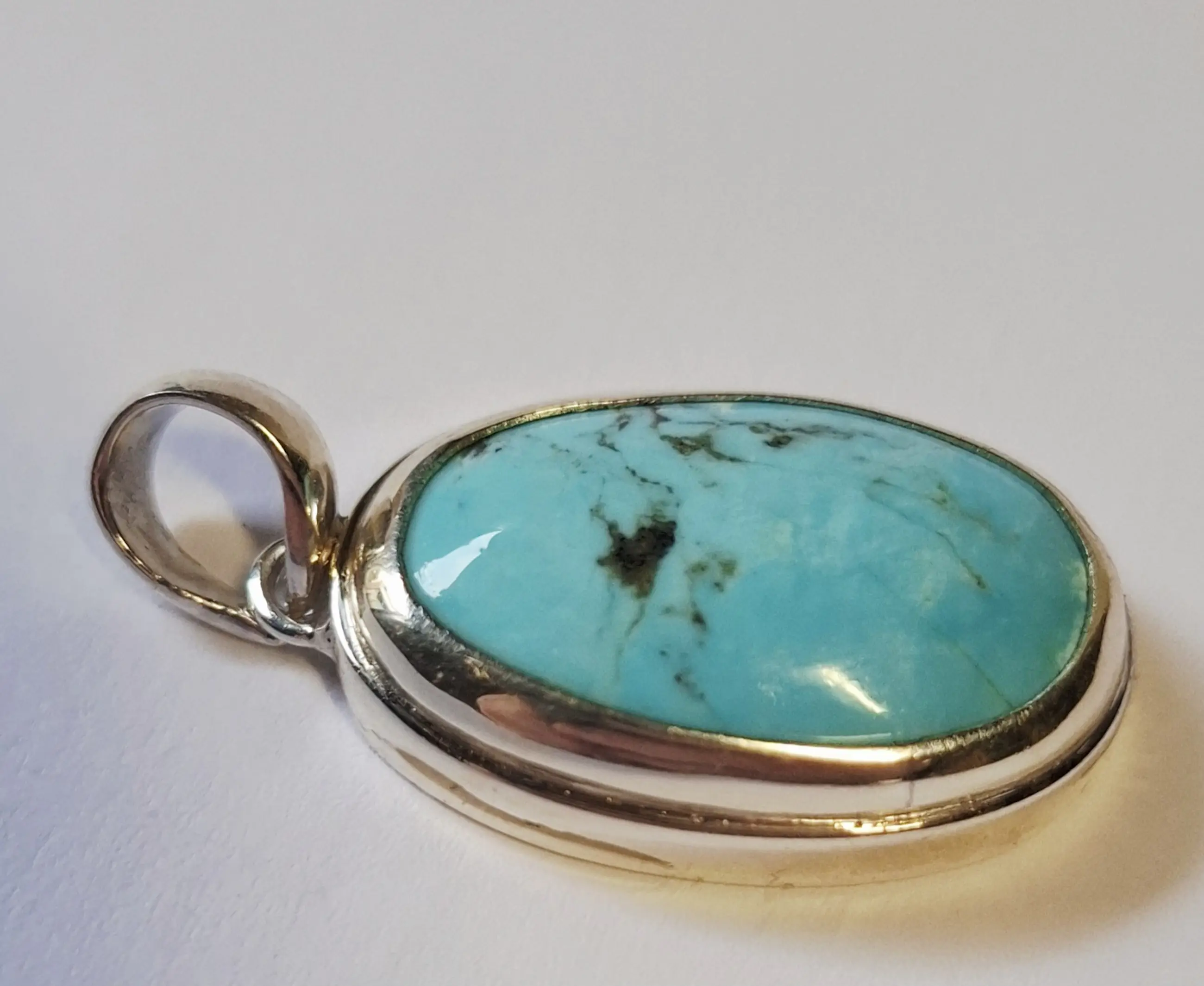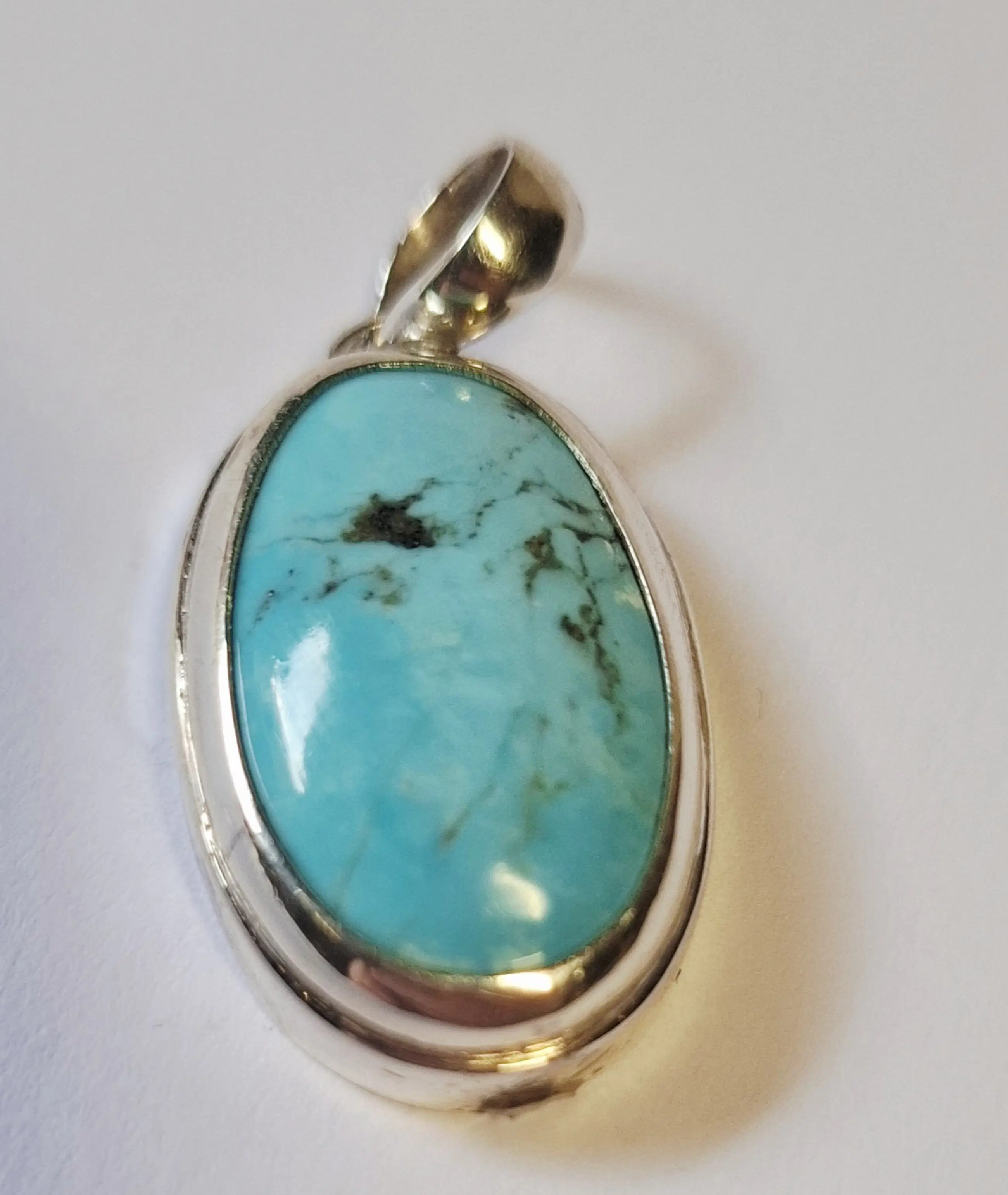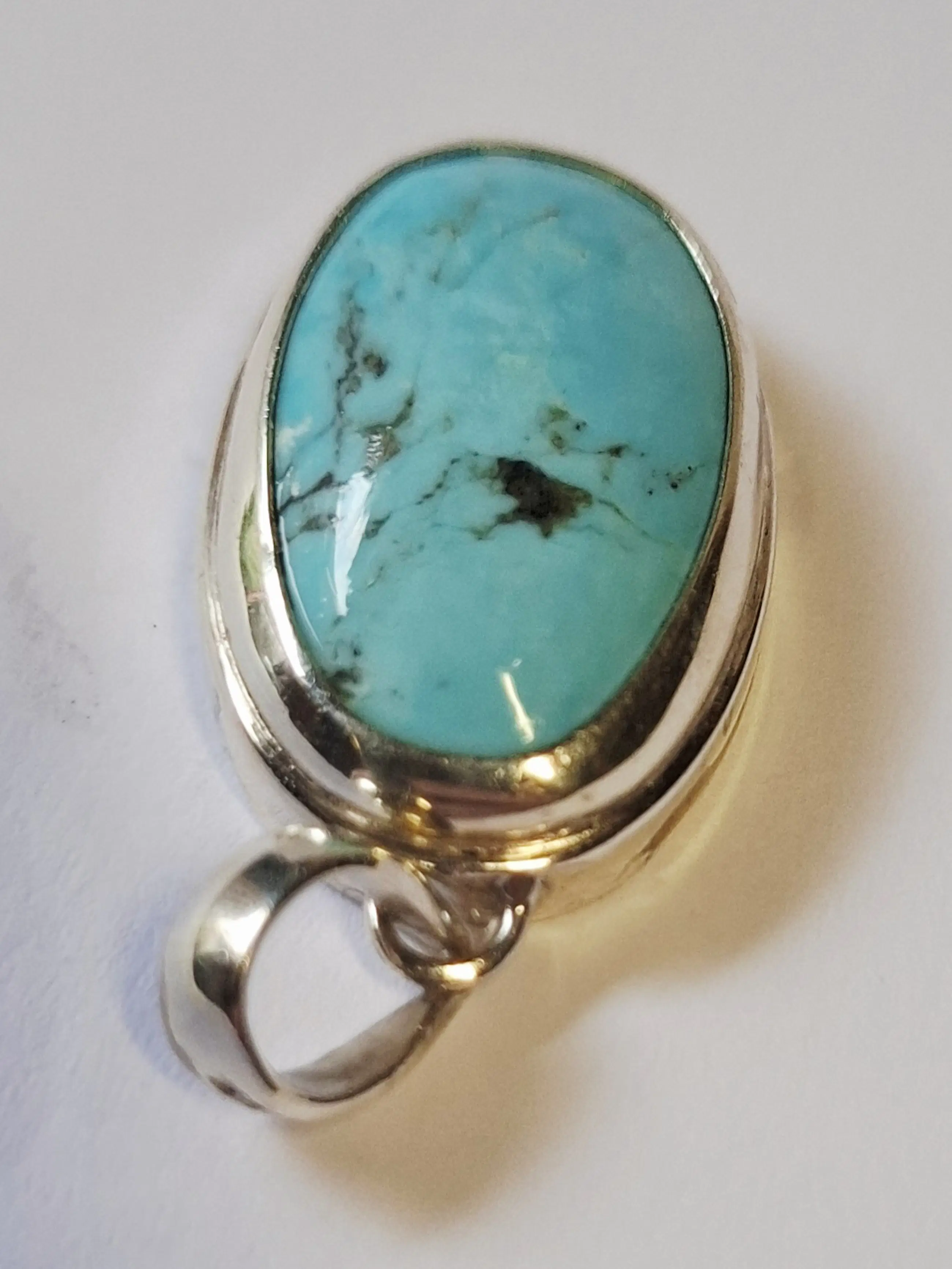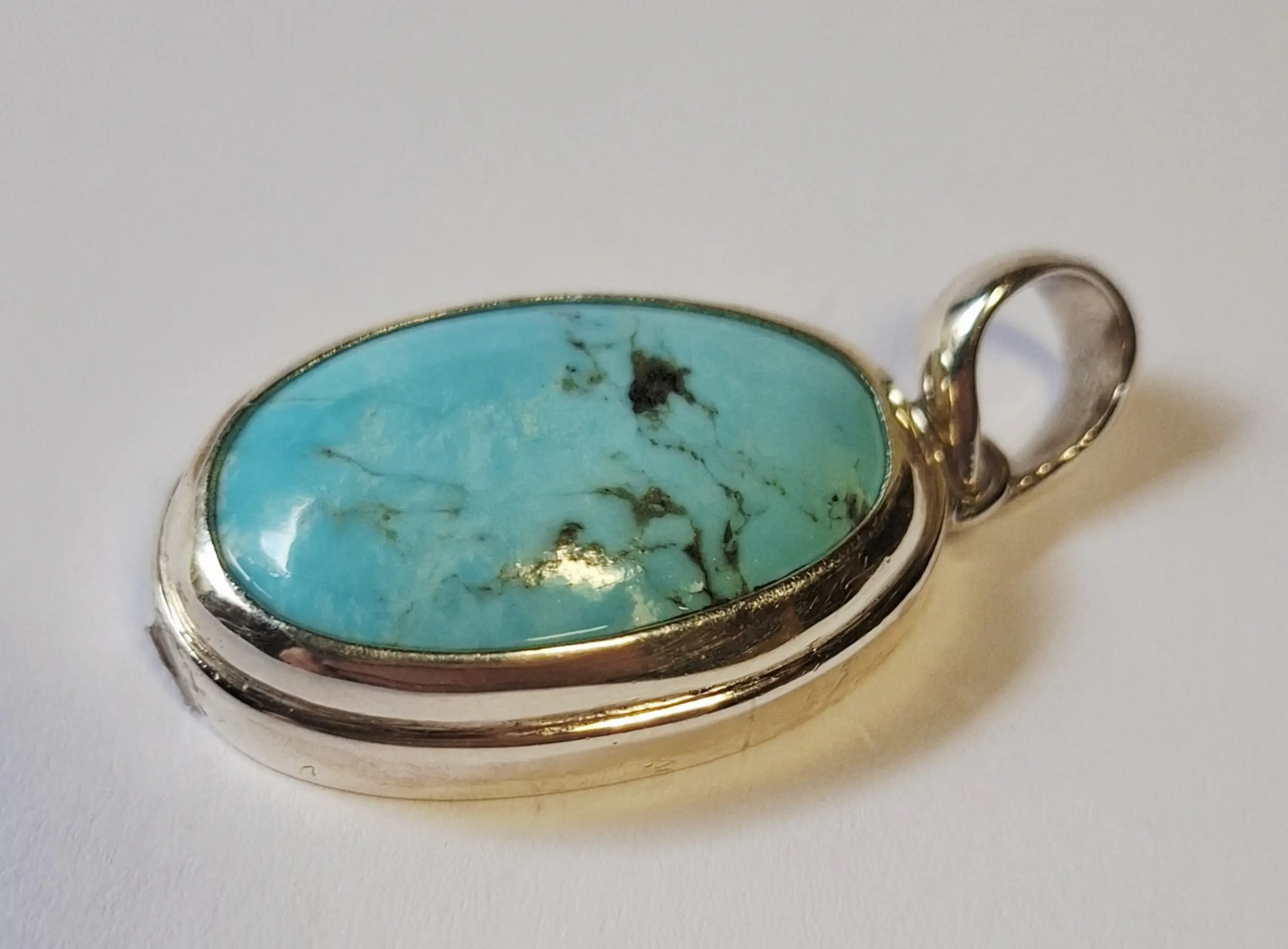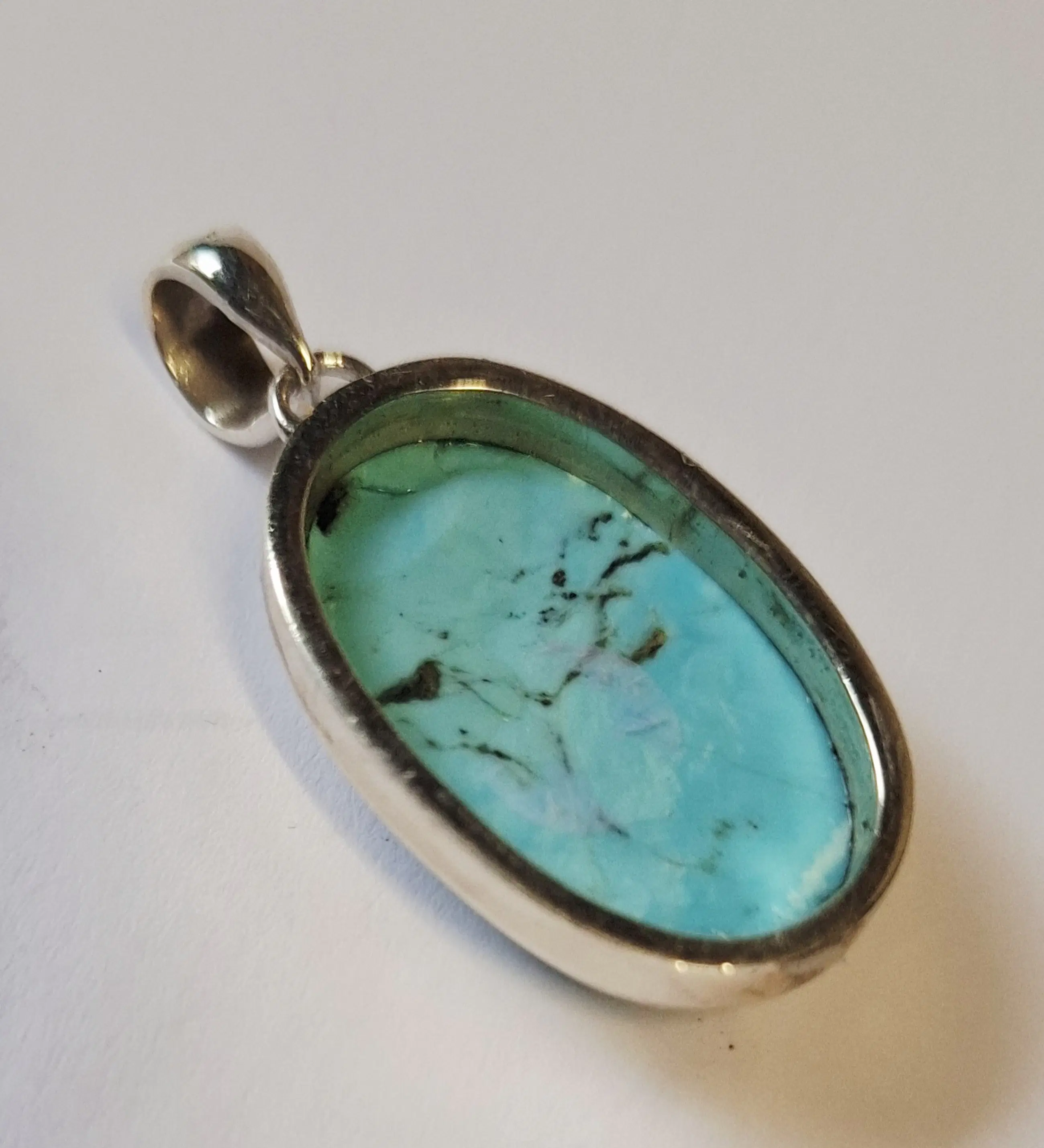 Nieuwe handgemaakte grote ovale hoogglans zilveren hanger, fraai ingelegd met groene turkoois