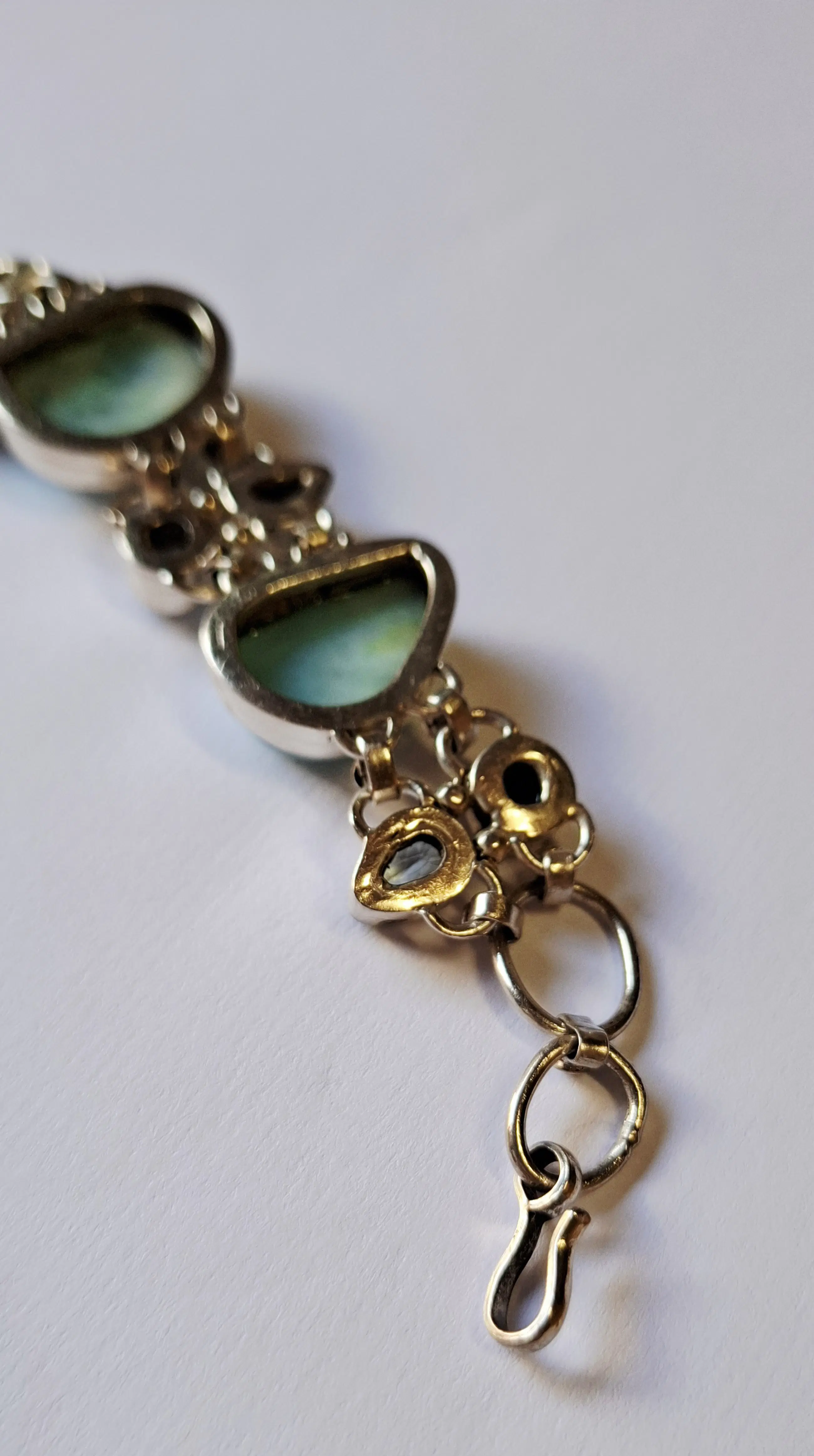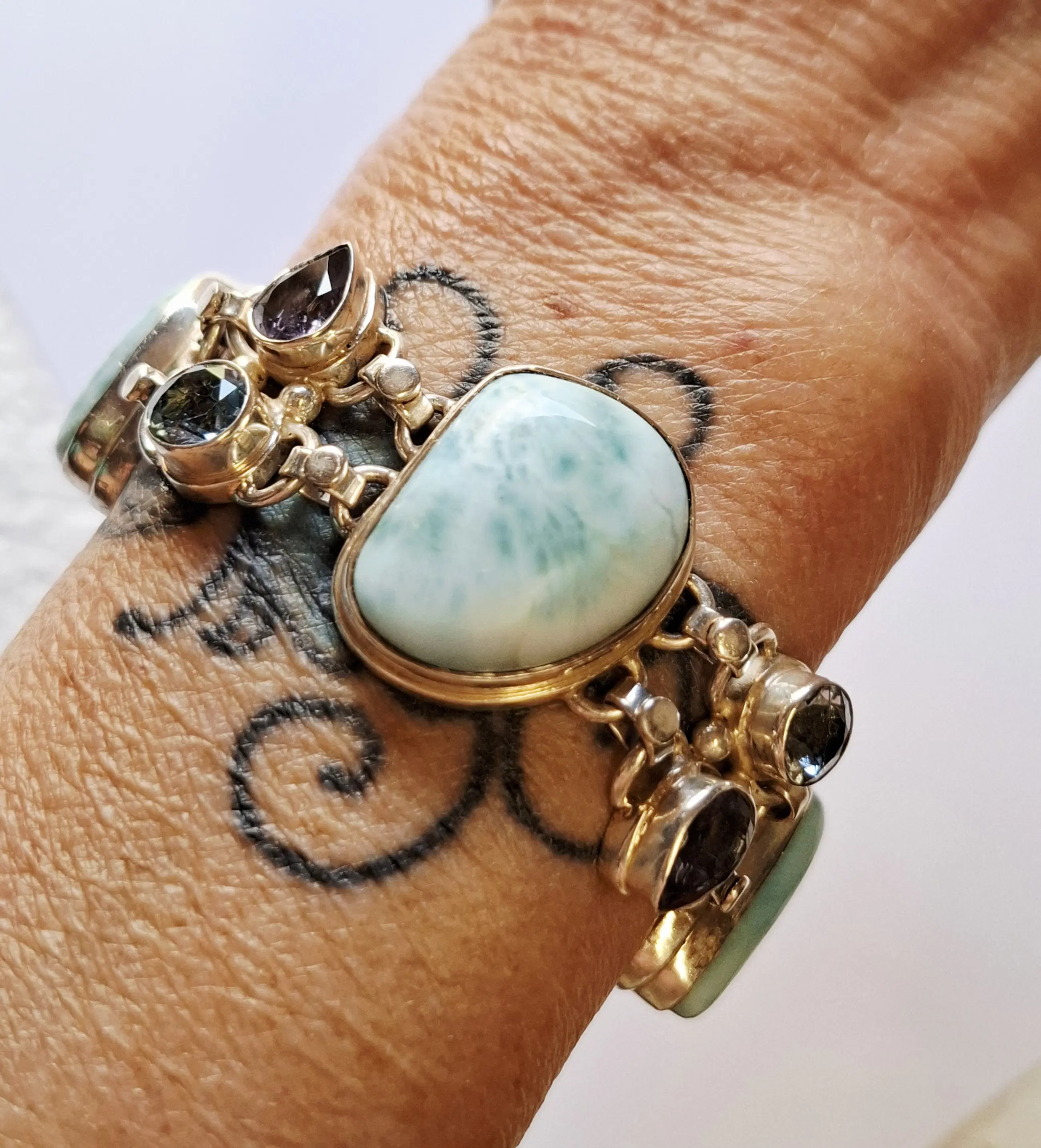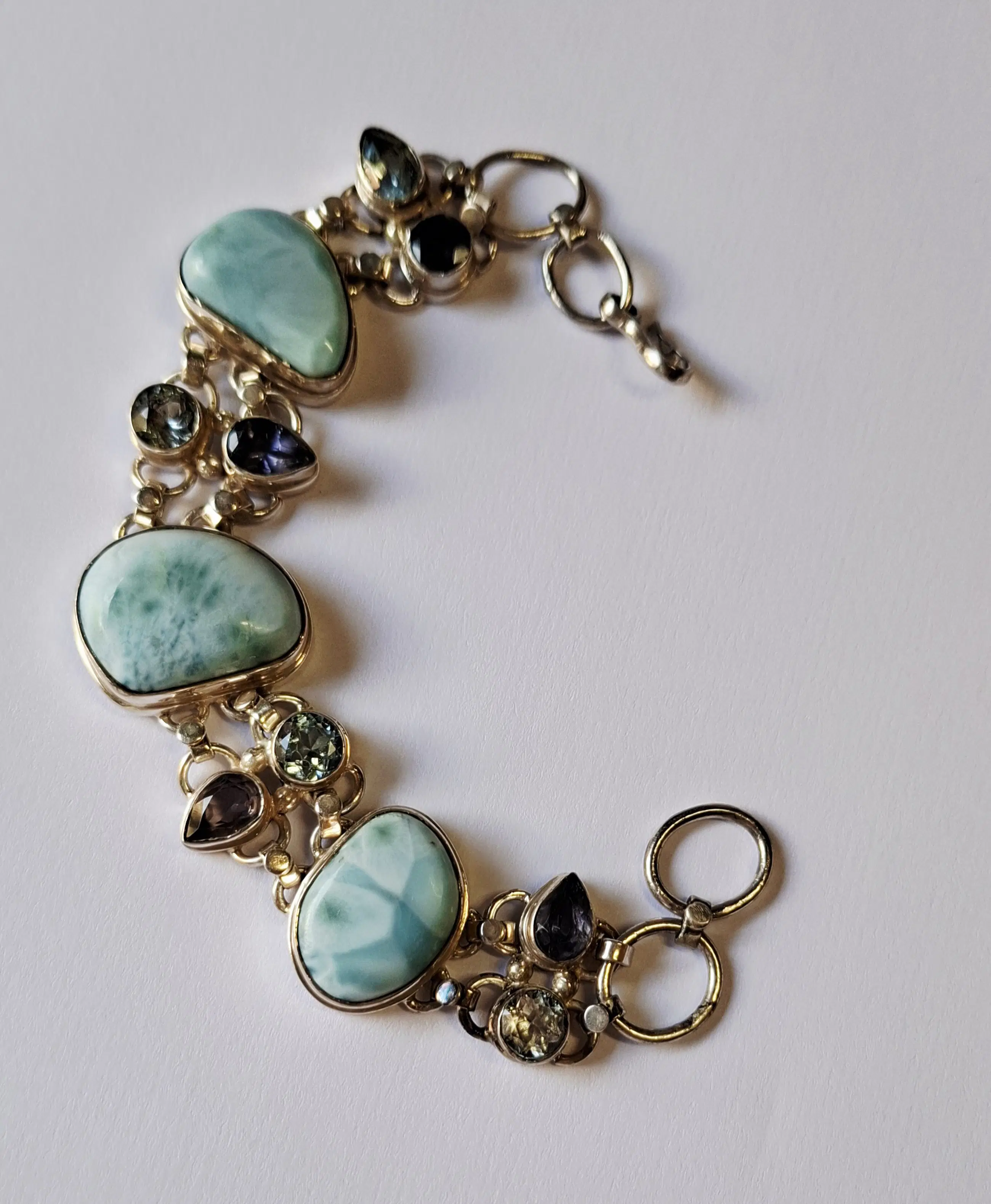 Nieuwe mooie grote zware zilveren armband gezet met Larimar met facetgeslepen topaas / saffieren / aquamarijn/ Bergkristal / Amethist / mooie edelstenen. Deze zilveren armband is verstelbaar van 17.5 cm 18.5 19.5 tot 20.5cm. Komt uit een prive Collectie nog nooit gedragen. Heeft altijd in een vitrine kastje gelegen eigenlijk is het nog nieuw dat het vanuit 1995 stamt Word goed verpakt en verzekerd verzonden met track en trace