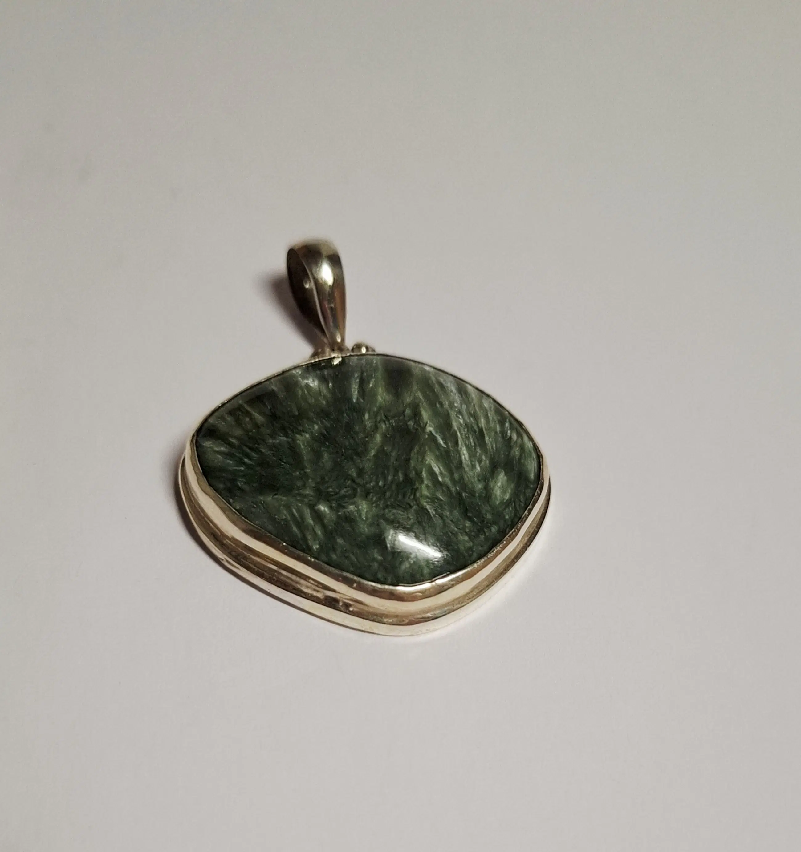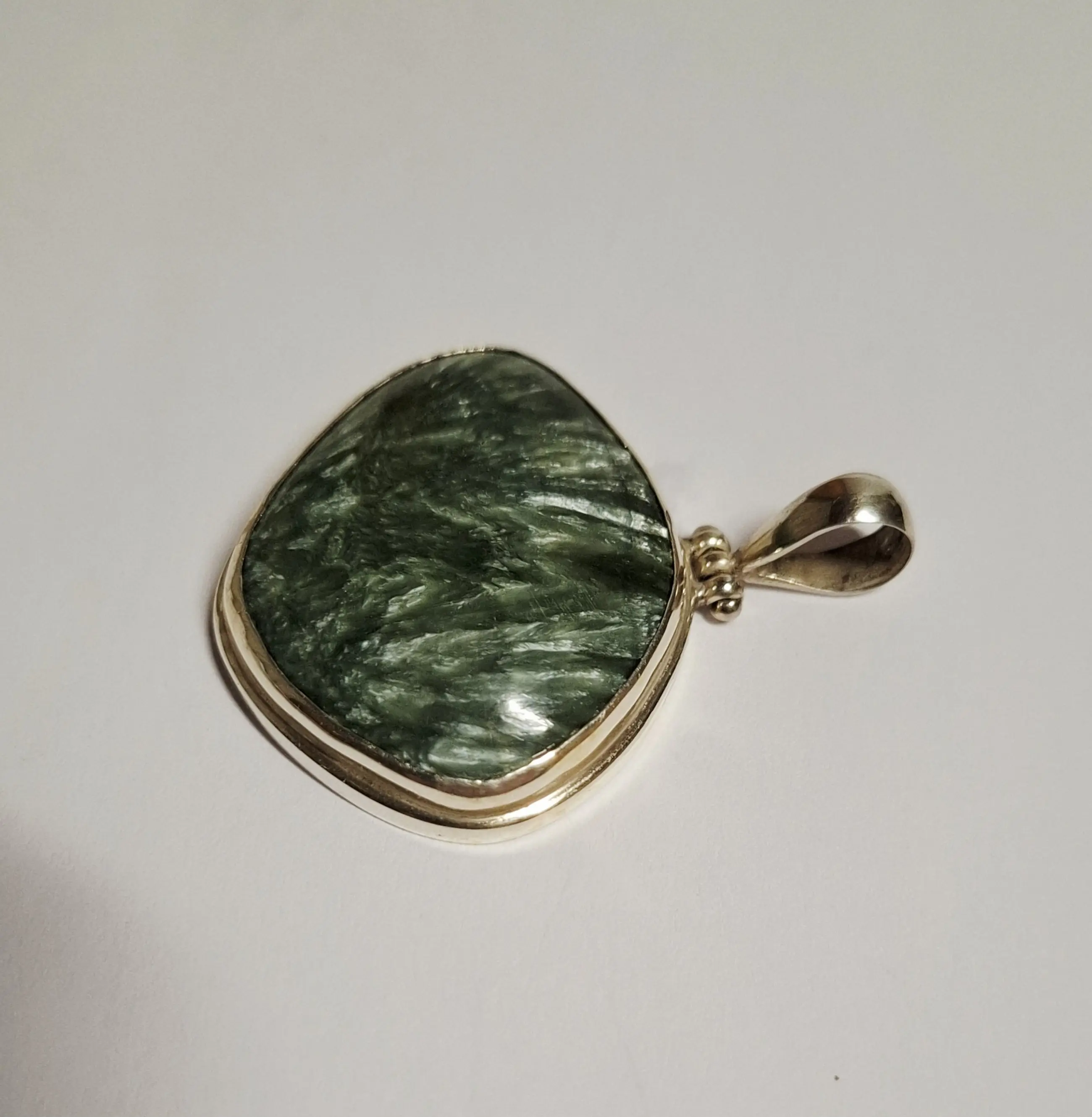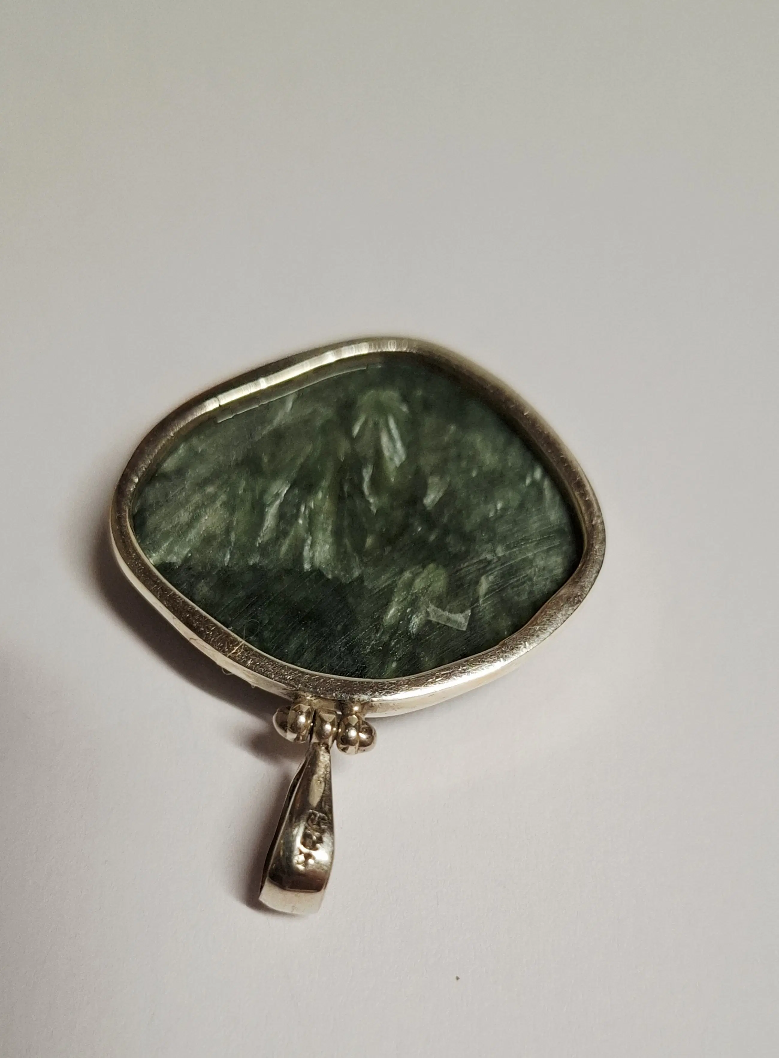 Prachtige groen-zilveren gelaagde serafiniet hanger in zilver. Het zilver is van 925 sterling juwelierskwaliteit. De afmeting van de steen is ongeveer 1 cm Dik/ hoog en 3,5 m breed.en een totale lengte 4,2 cm weegt 11,81 gram Een bijzondere steen, alsof het niet van deze aarde komt. Serafiniet wordt alleen gevonden in de omgeving van het Baikalmeer in Siberië.