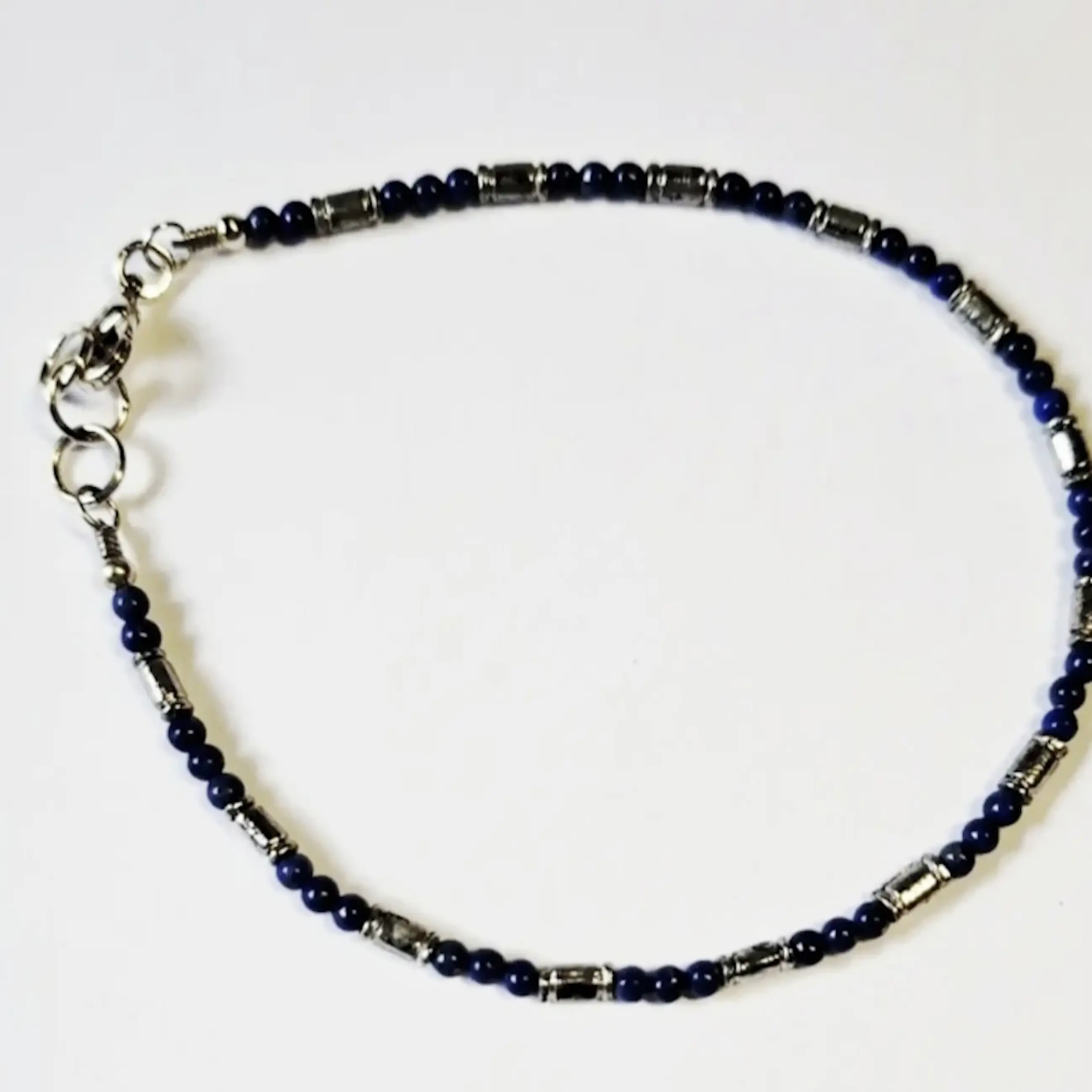 Prachtige kleine ronde lapis lazuli steentjes gemengd met 970/1000 zilveren Buis ringen. Dit zilver van uitzonderlijke zuiverheid De verschillende verbindingselementen - ketting, karabijnsluiting, pailletten.